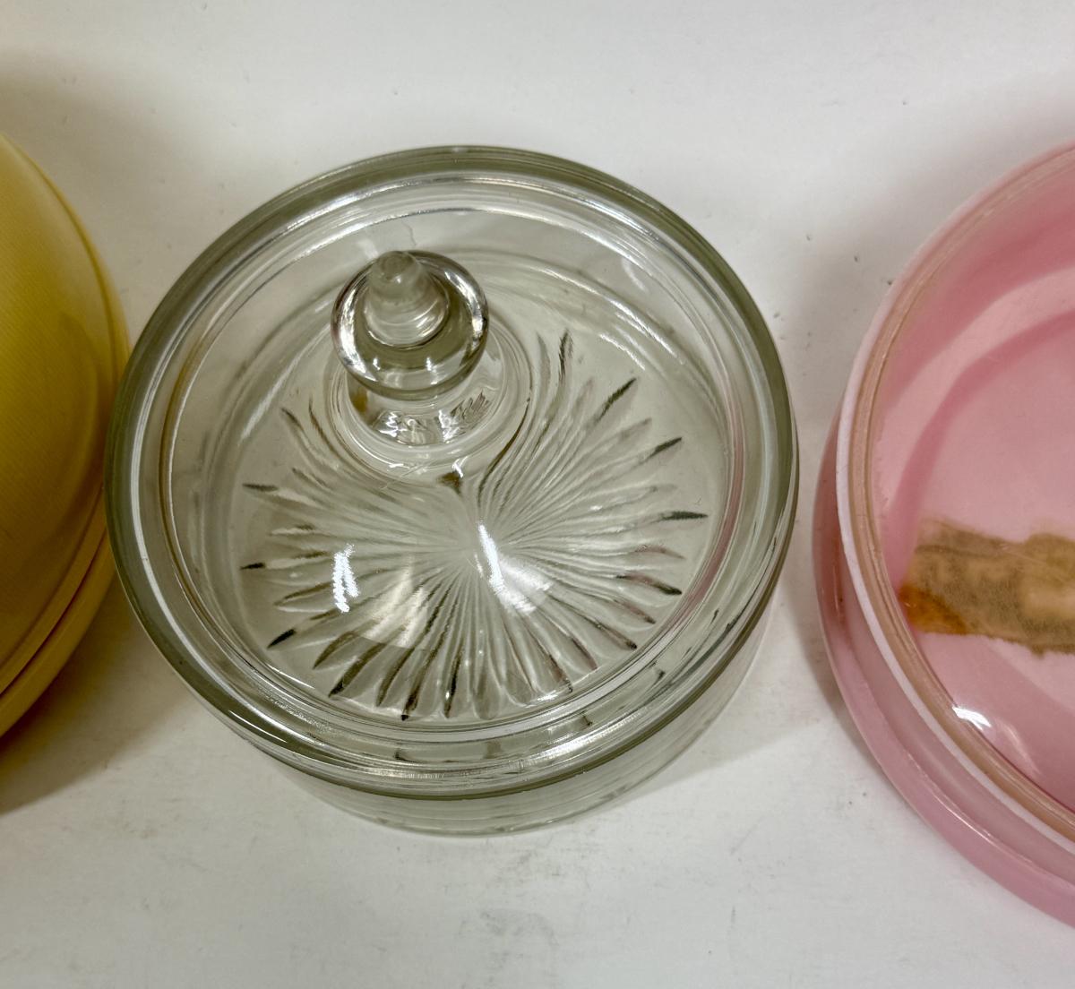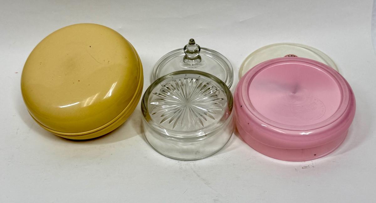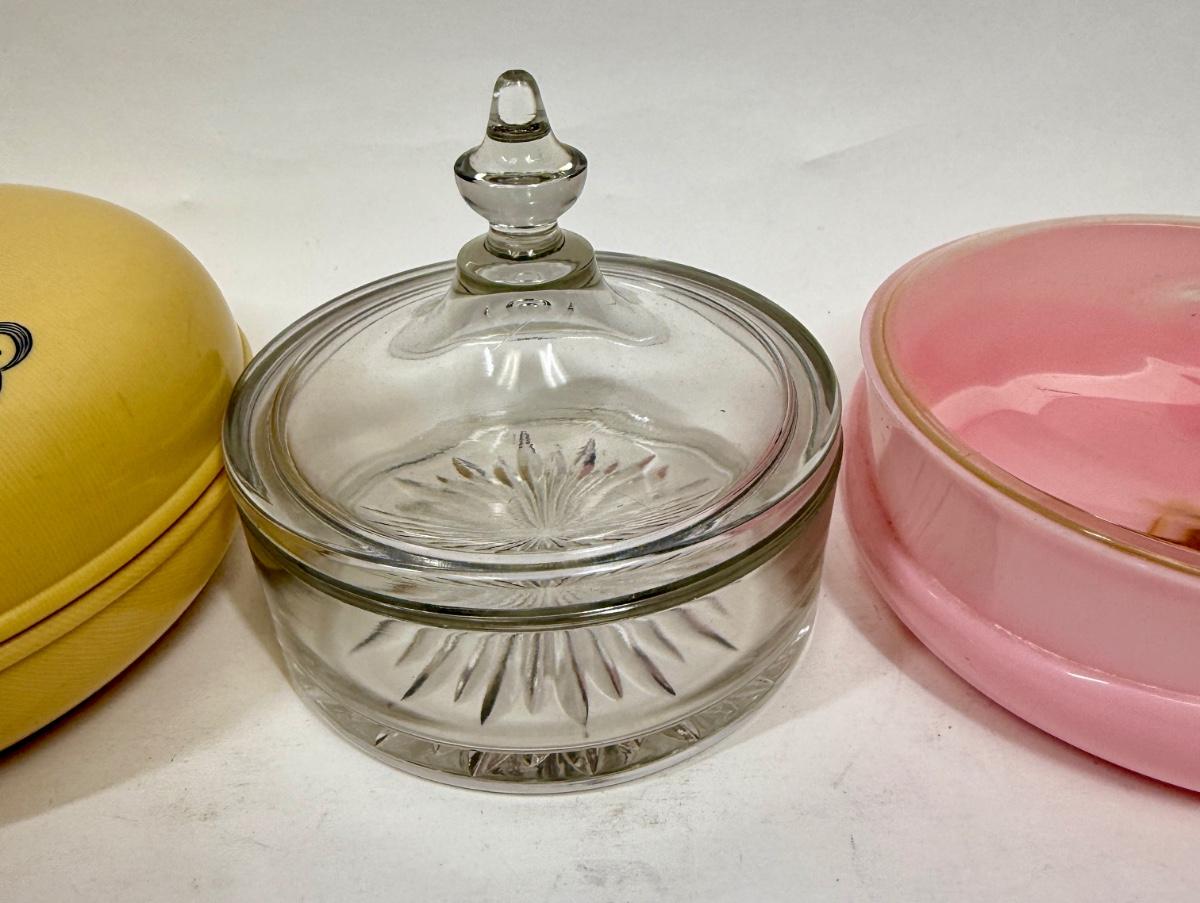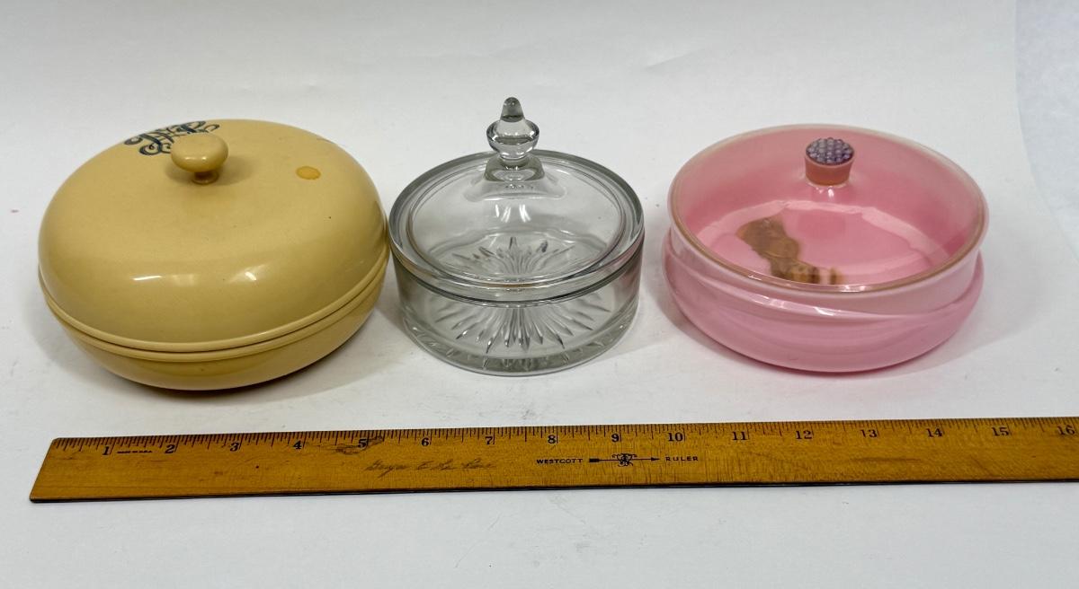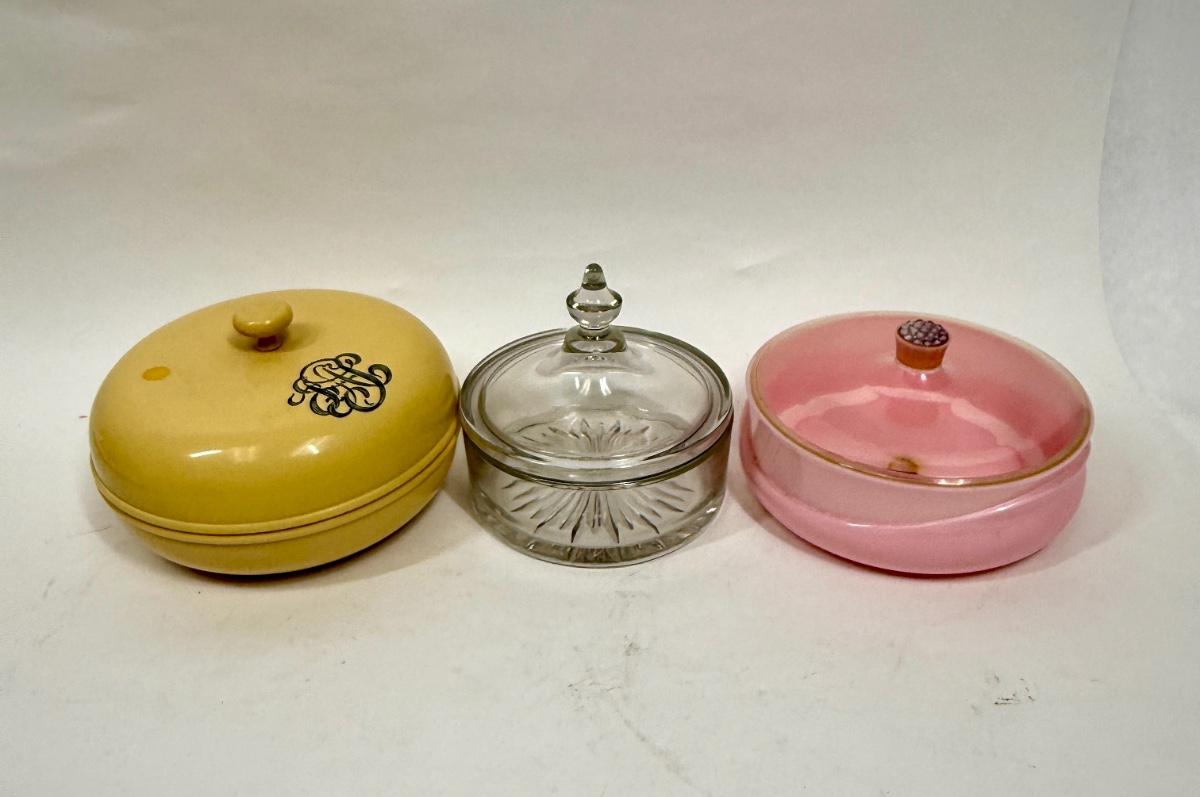 Yellow box is Palmer's French Ivory made from Celluloid Acetate, the middle one is glass, and the pink one is Avon box that once contained "Somewhere Beauty Dust". Pink one has dark stain that doesn't seem to come out.