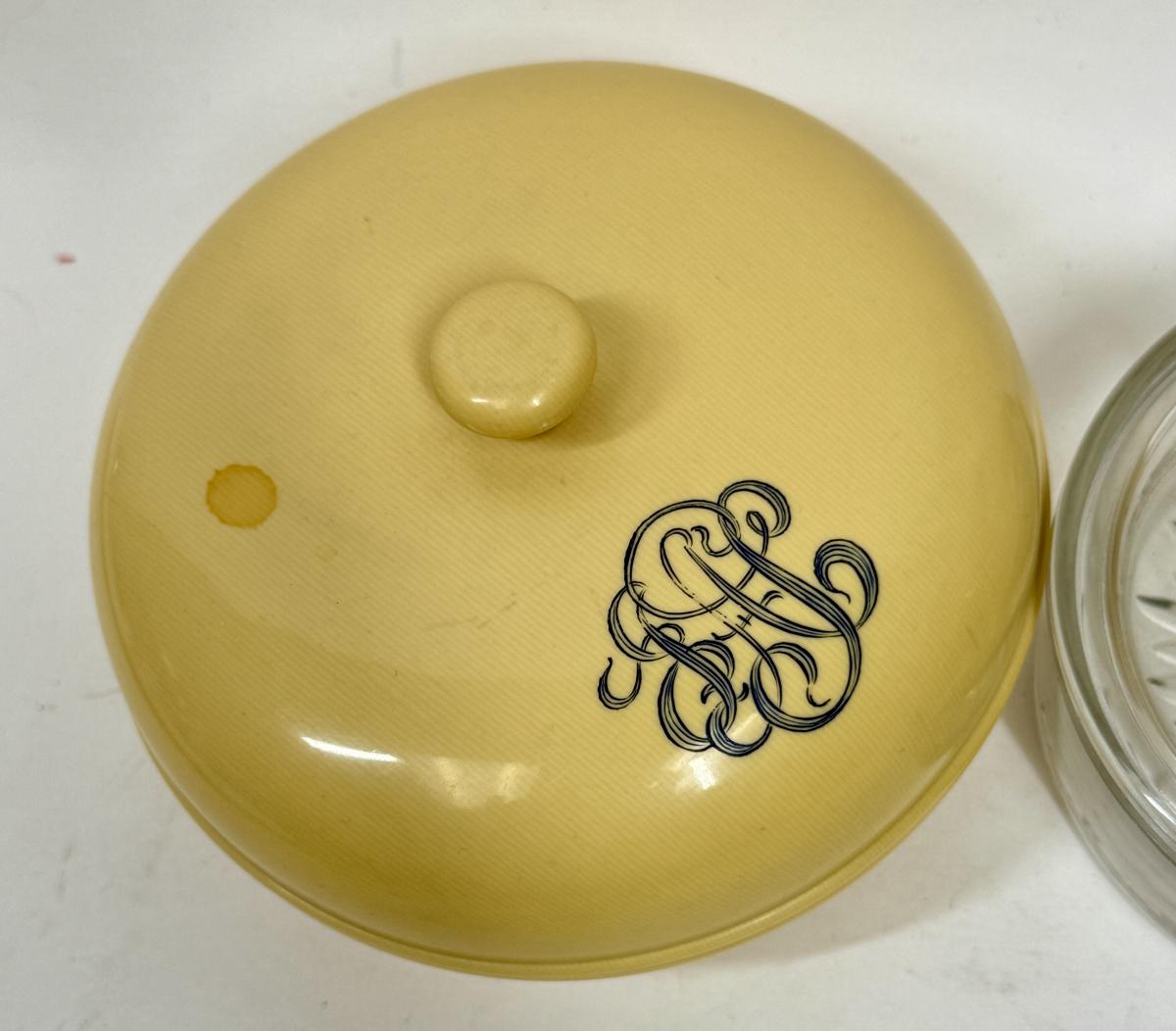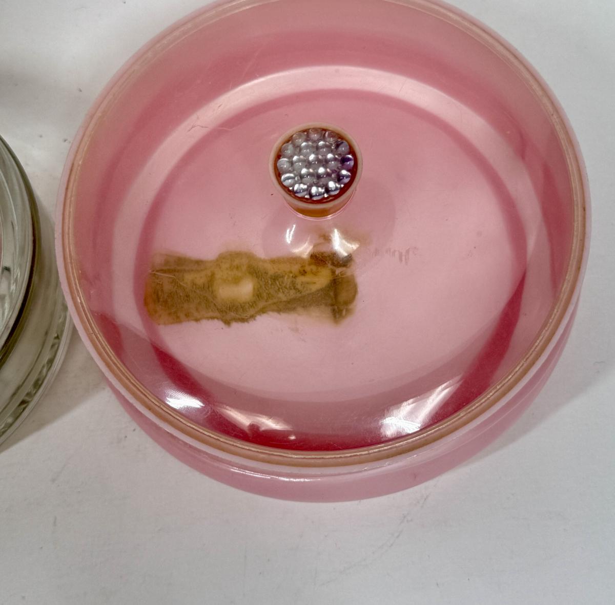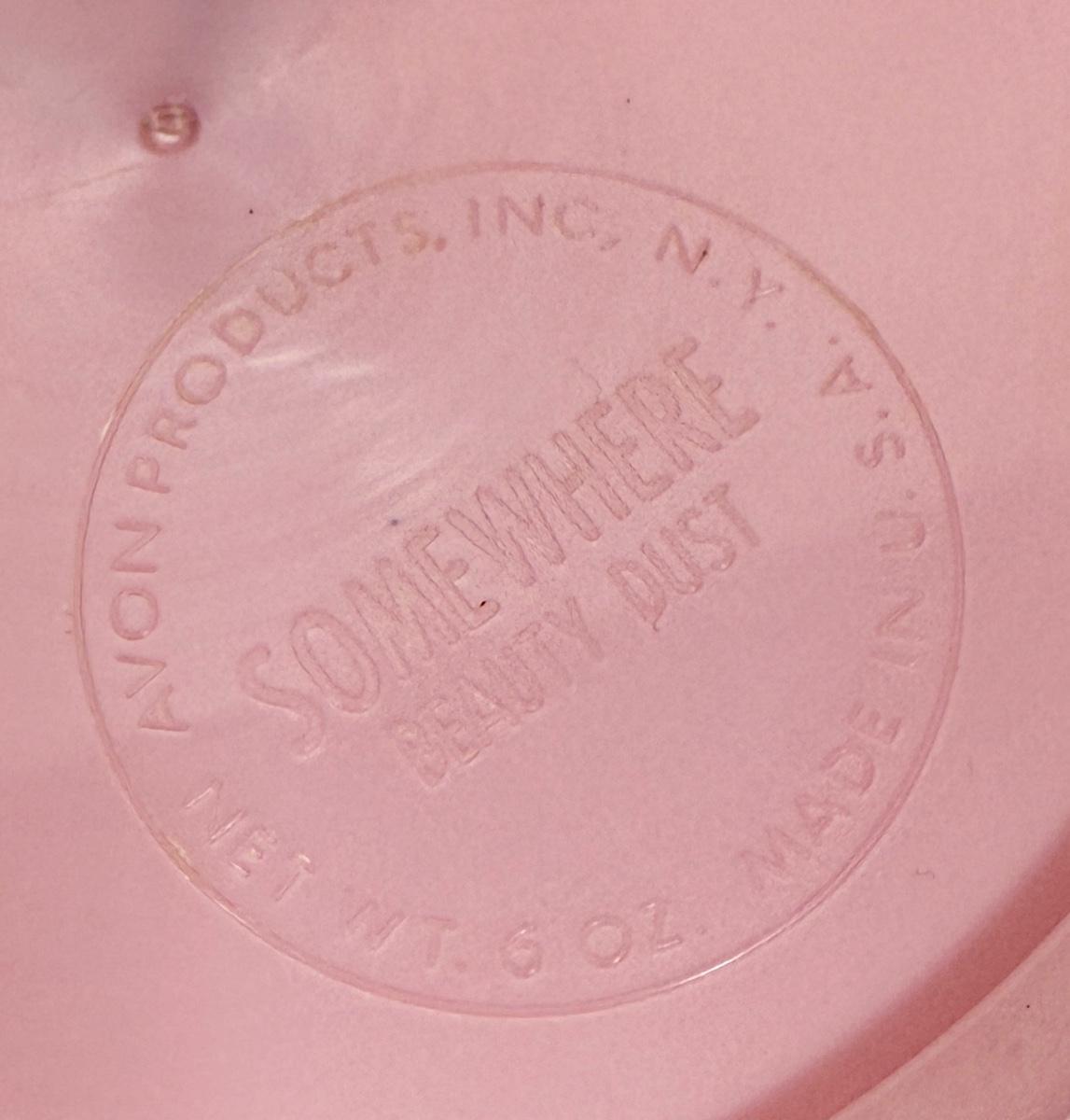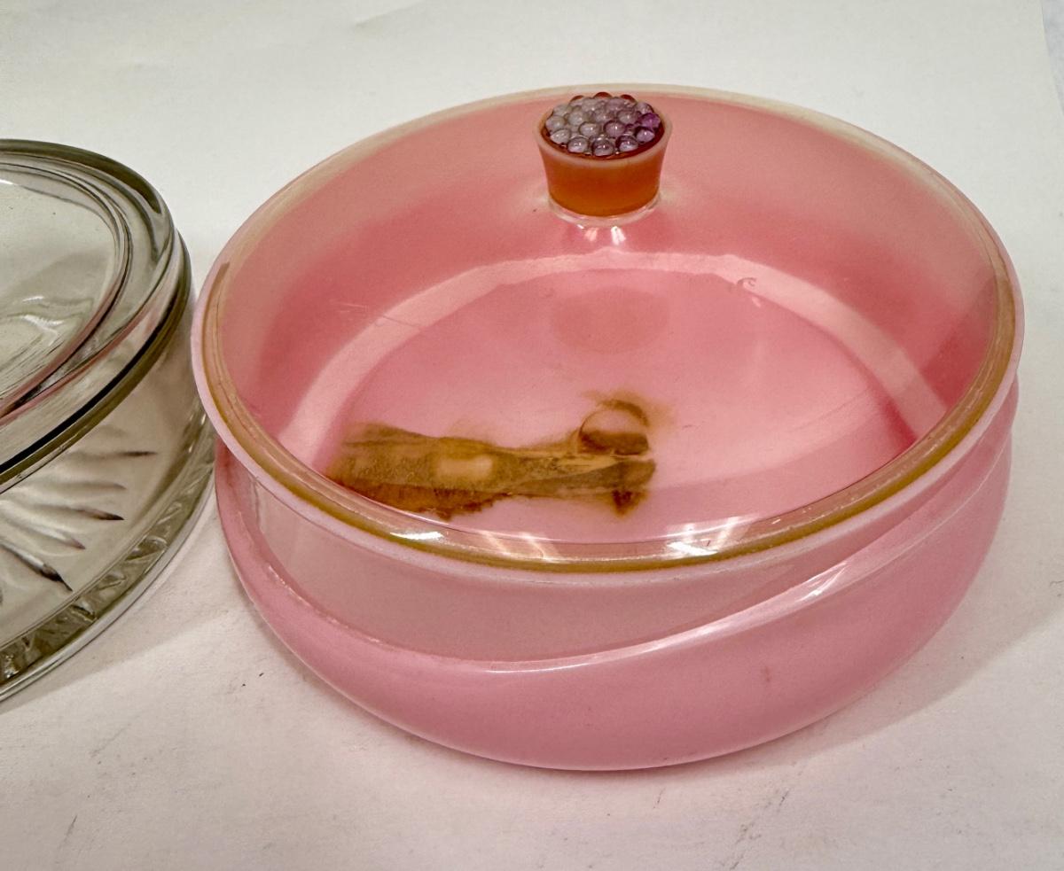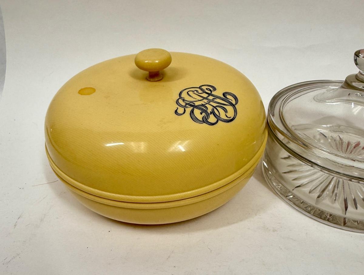 Yellow box is Palmer's French Ivory made from Celluloid Acetate, the middle one is glass, and the pink one is Avon box that once contained "Somewhere Beauty Dust". Pink one has dark stain that doesn't seem to come out.