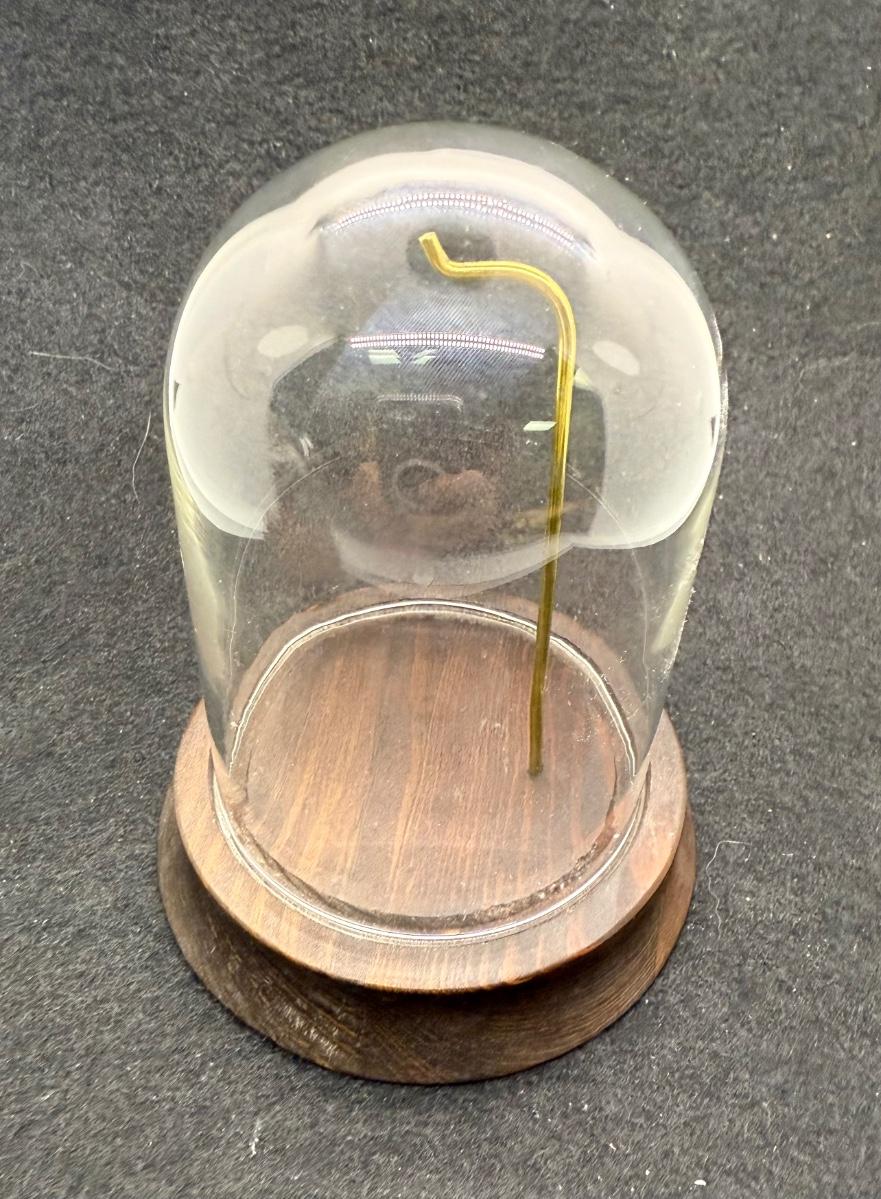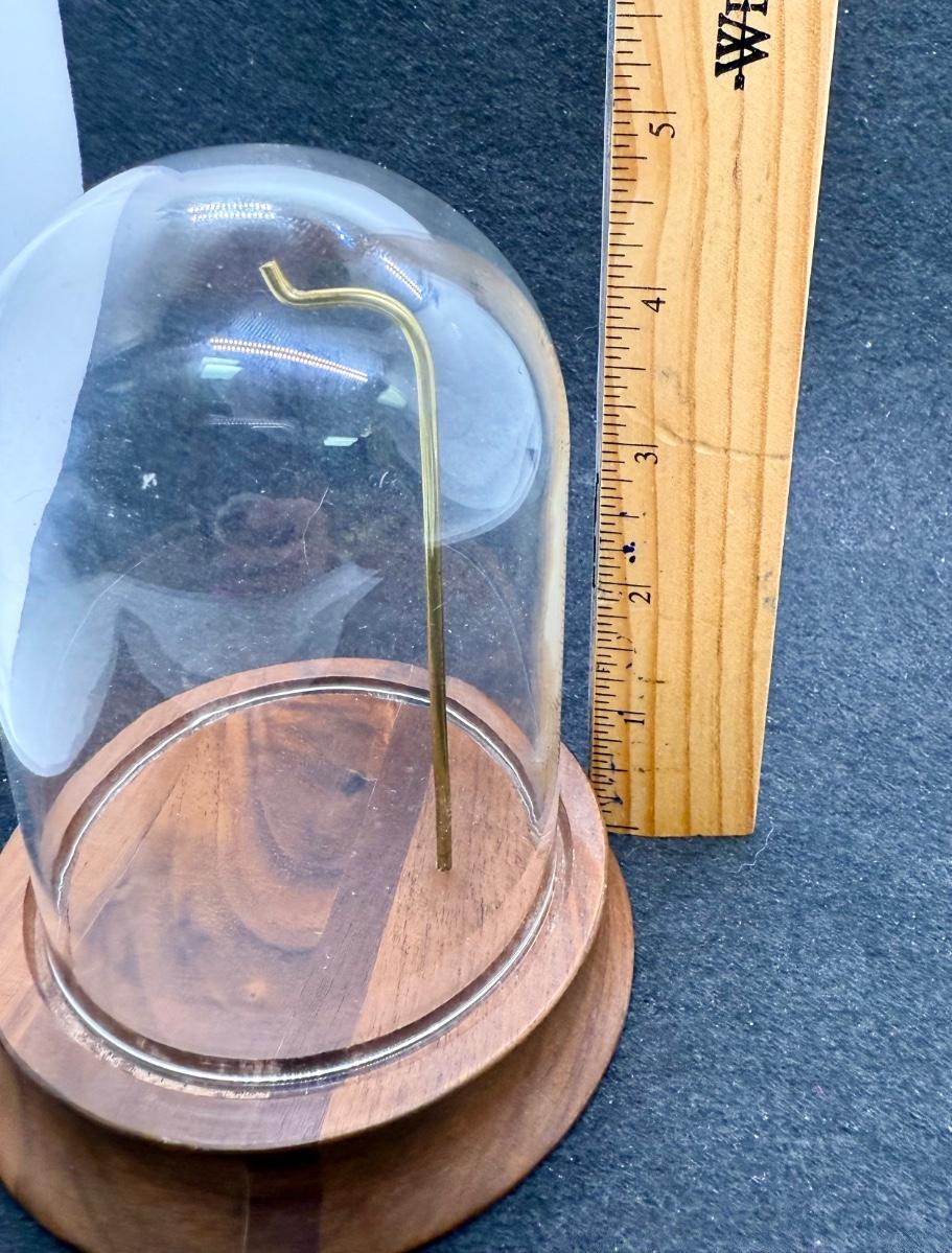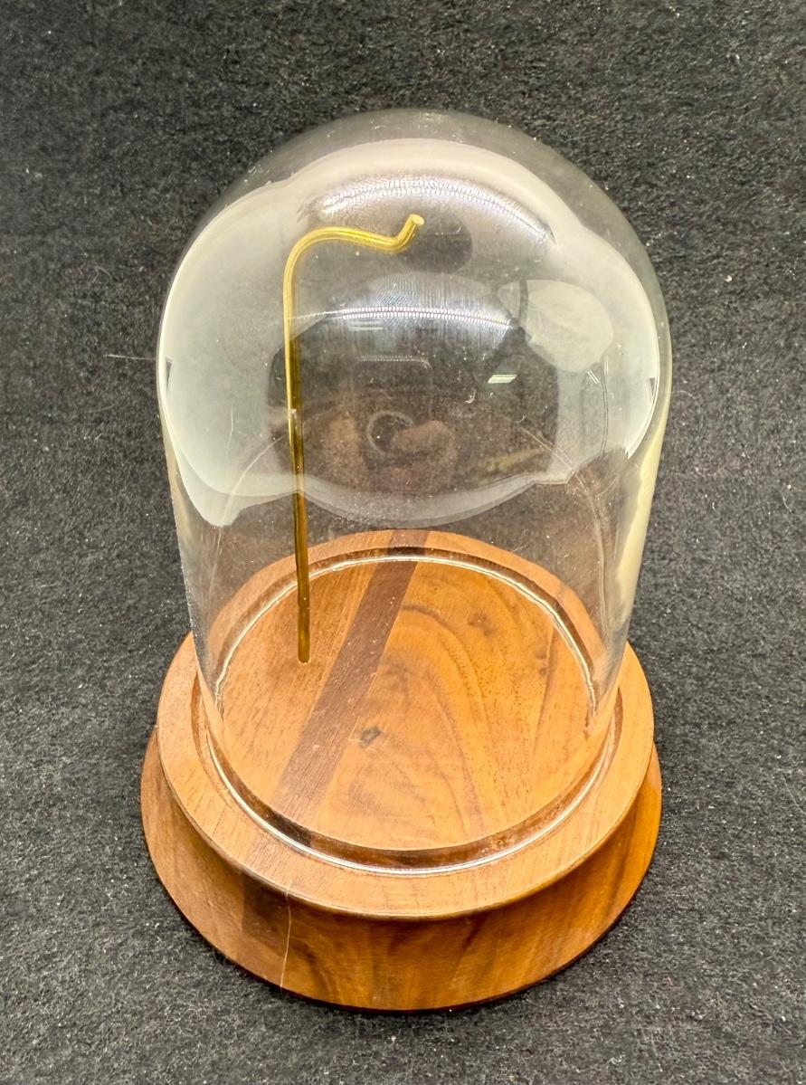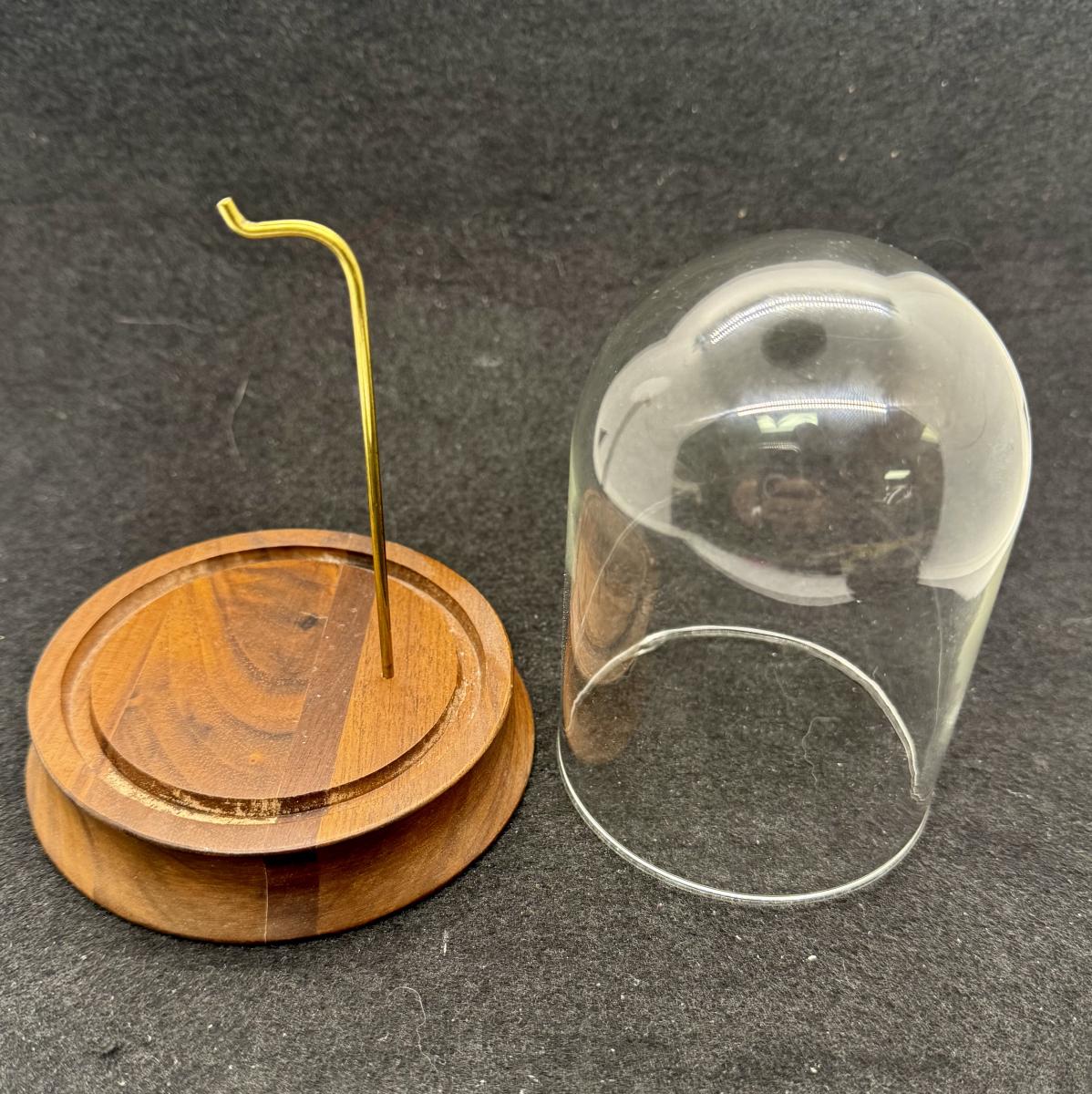 Round wooden base with a brass post with hook, to display a pocket watch, handing ornament, or mother item, Clear glass dome cover, which is removable. Good condition, approx. 5" tall overall.