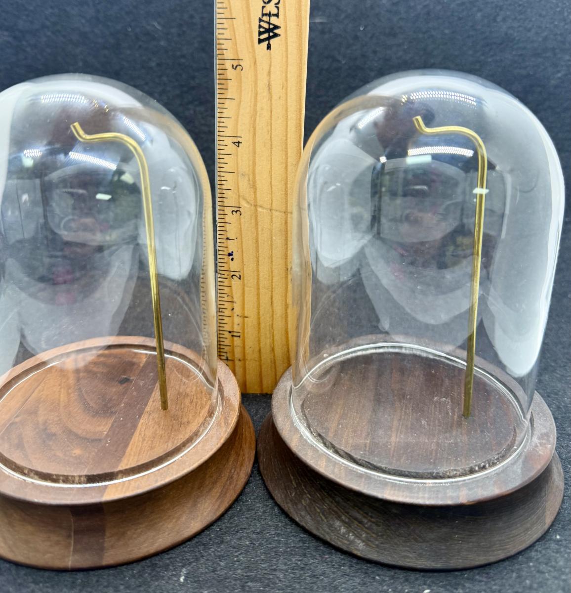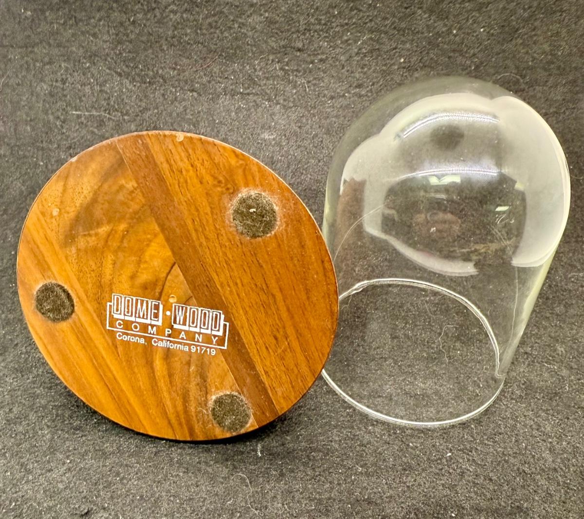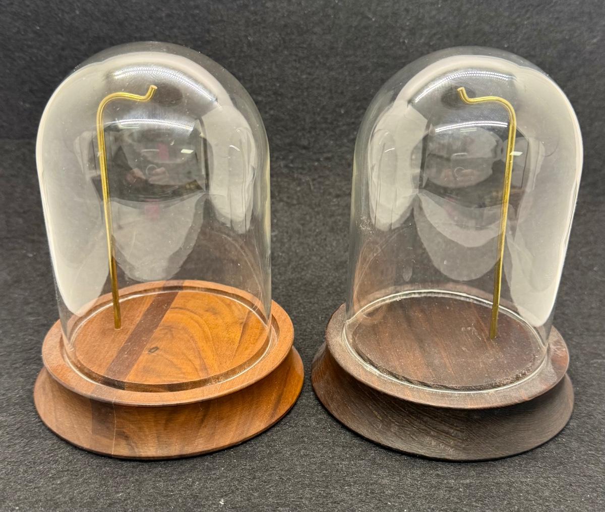 Round wooden base with a brass post with hook, to display a pocket watch, handing ornament, or mother item, Clear glass dome cover, which is removable. Good condition, approx. 5" tall overall.