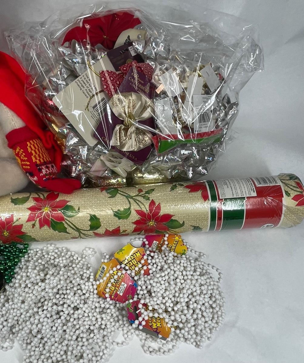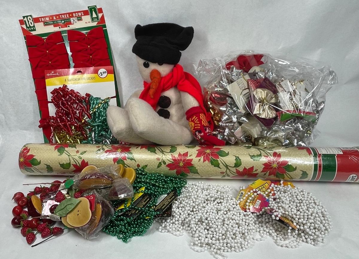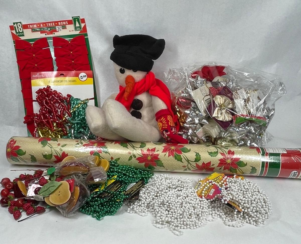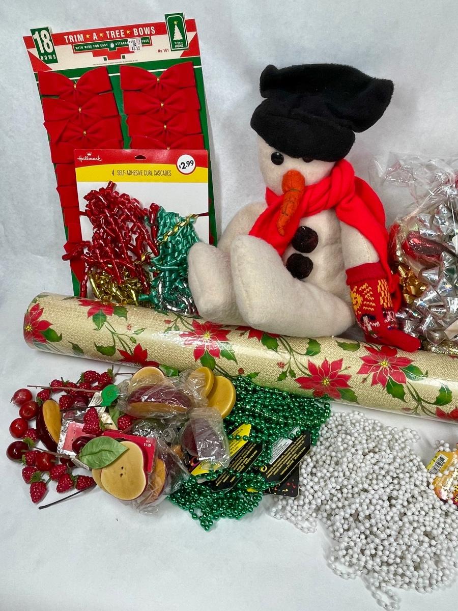 Super Big Christmas Trim Lot - wrapping paper, beads, bows, ribbon, fruit, Snowman stuffy, etc