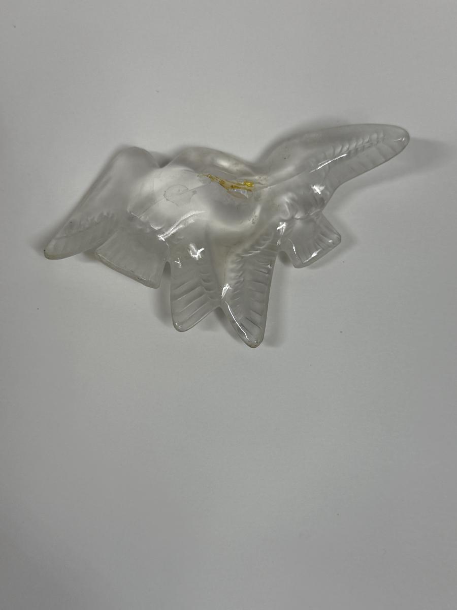 This is stopper broken off a bottle of L'Air du Temps perfume by Nina Ricci. The stopper was designed by Marc Lalique. It is made of frosted glass and features two entwined doves, symbolizing peace and love. The bottle still contains perfume but the stopper broke off inside. The stopper looks like someone had attempted to glue it on.