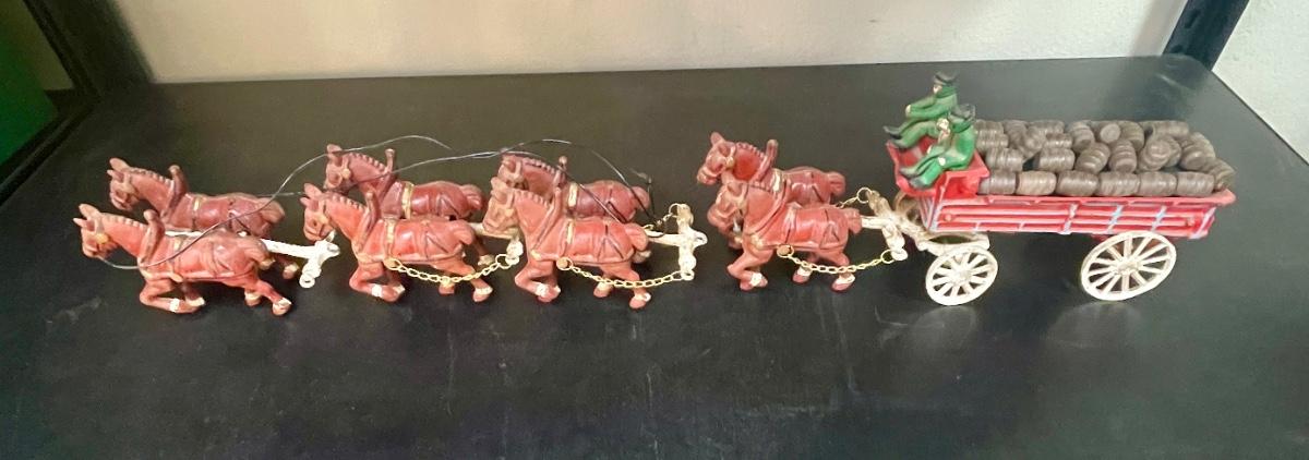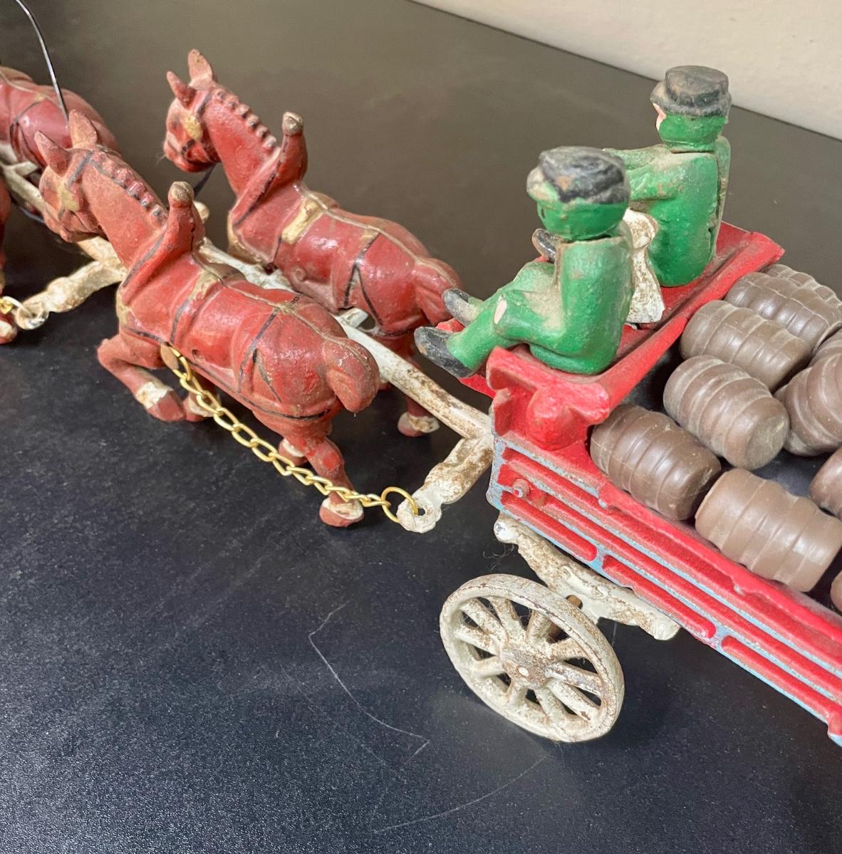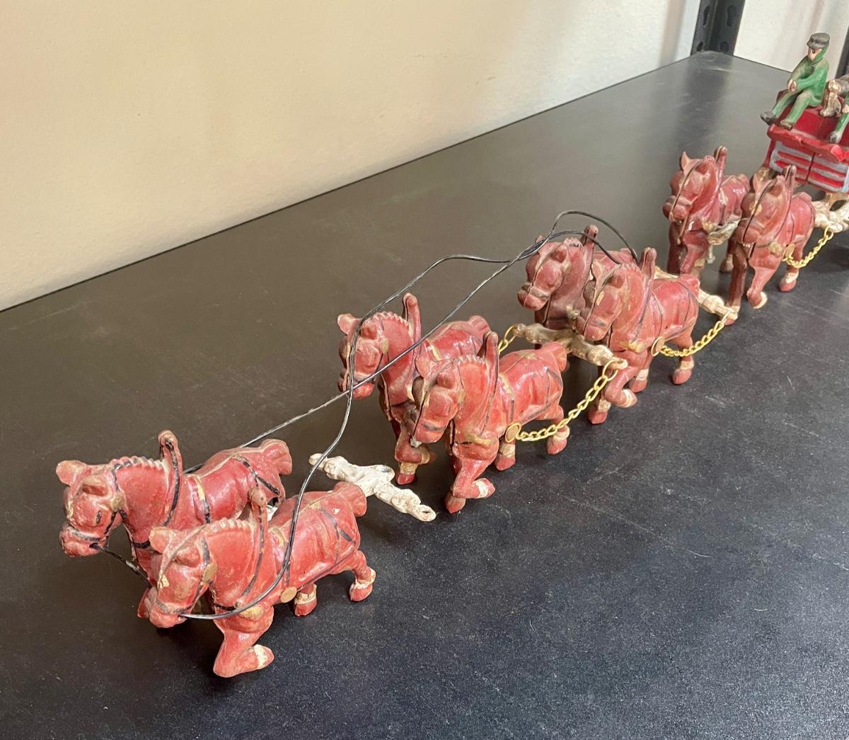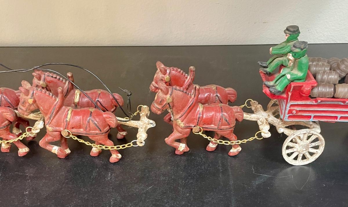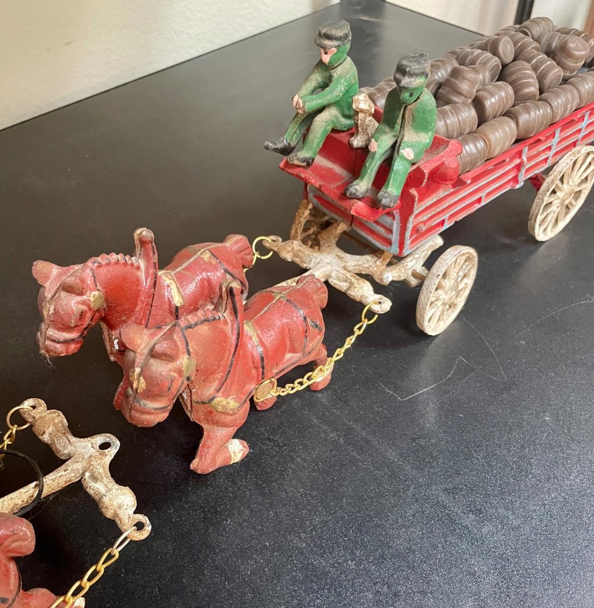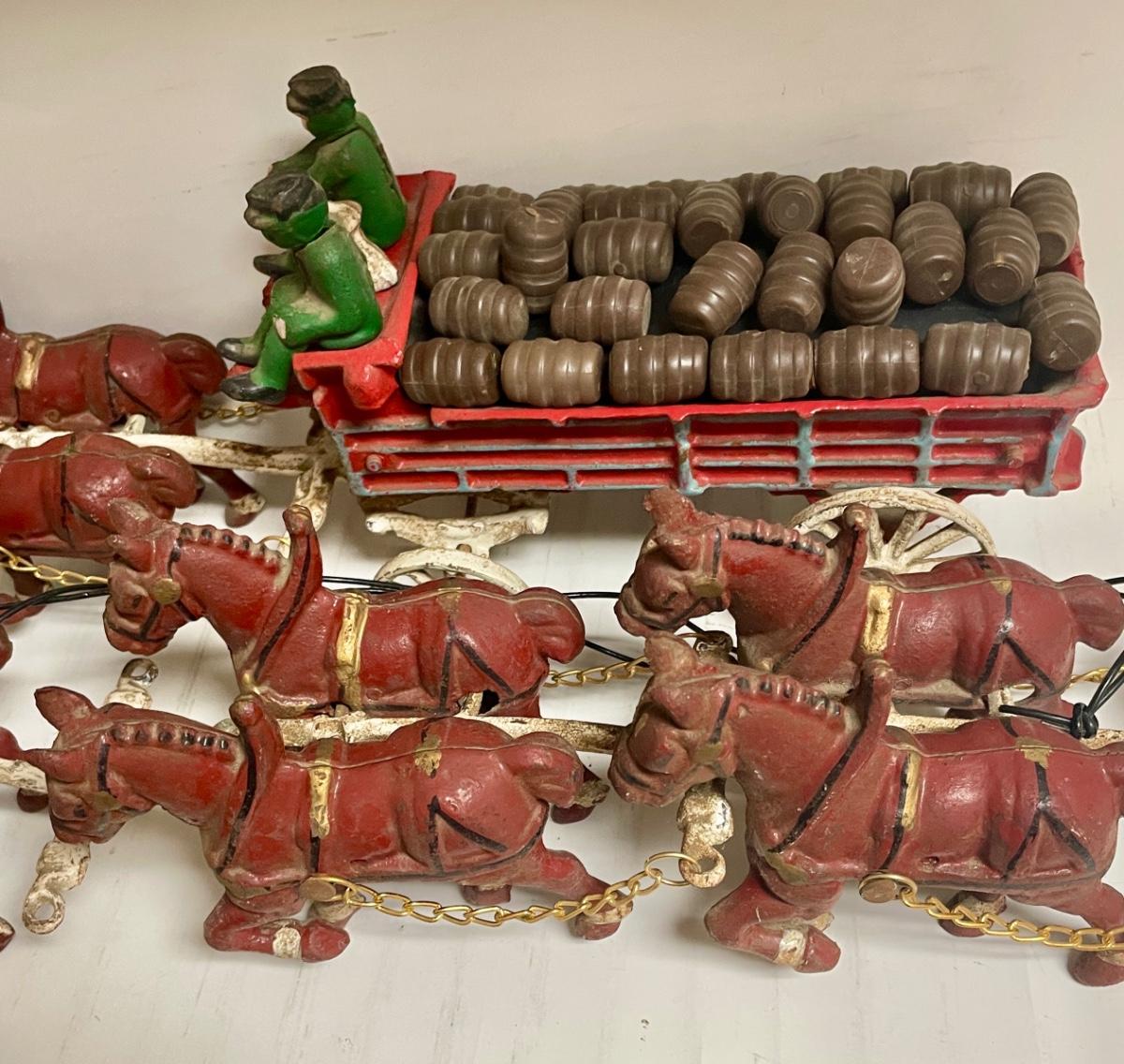 Vintage Cast Iron Toy 8 Clydesdale Horses & Wagon, Beer Barrels, 2 Drivers & Dog