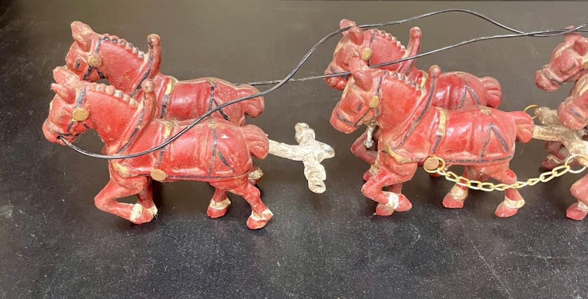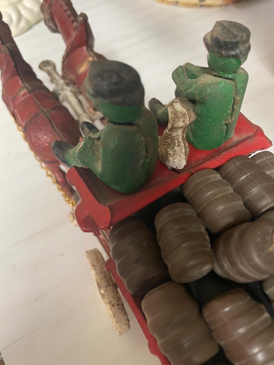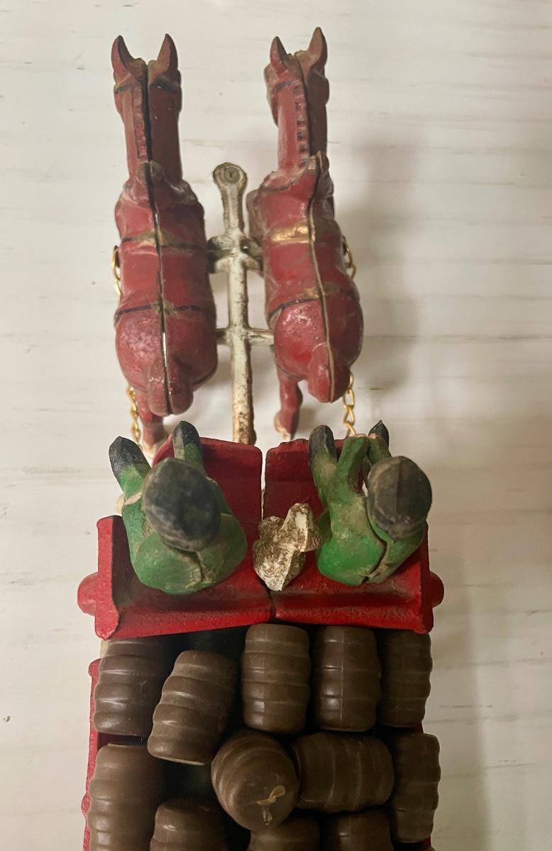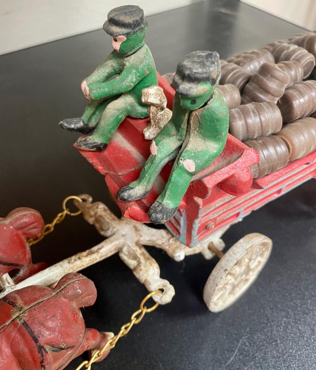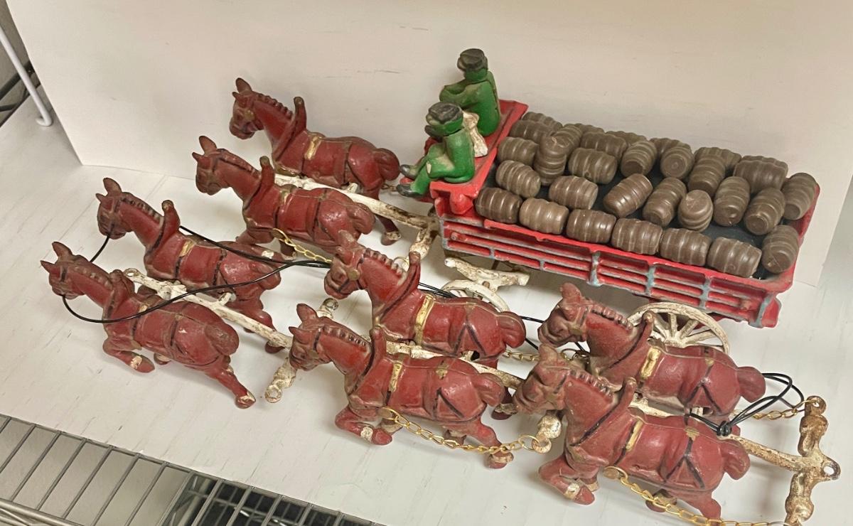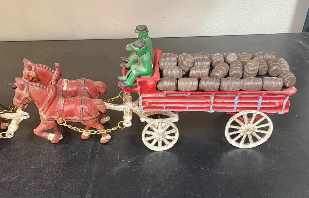 Vintage Cast Iron Toy 8 Clydesdale Horses & Wagon, Beer Barrels, 2 Drivers & Dog