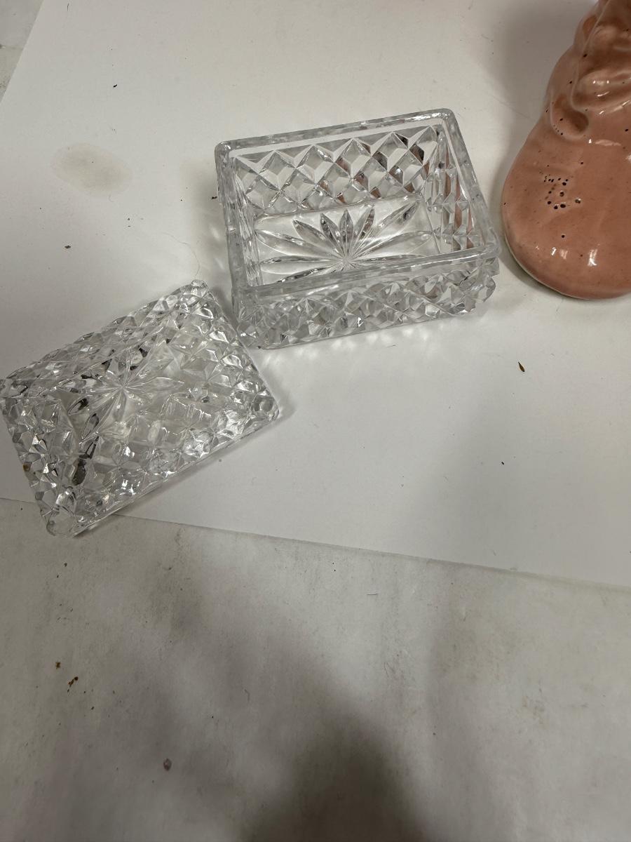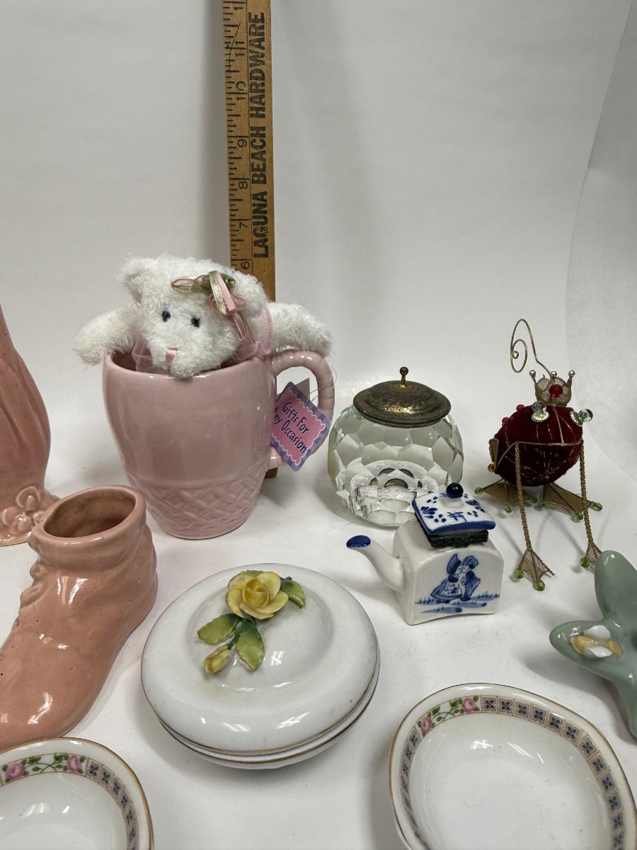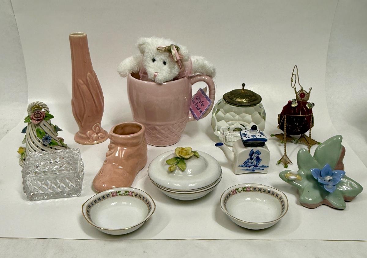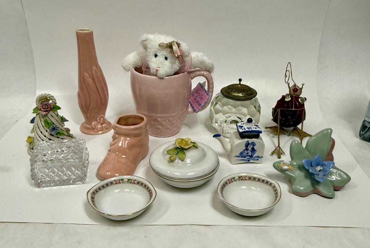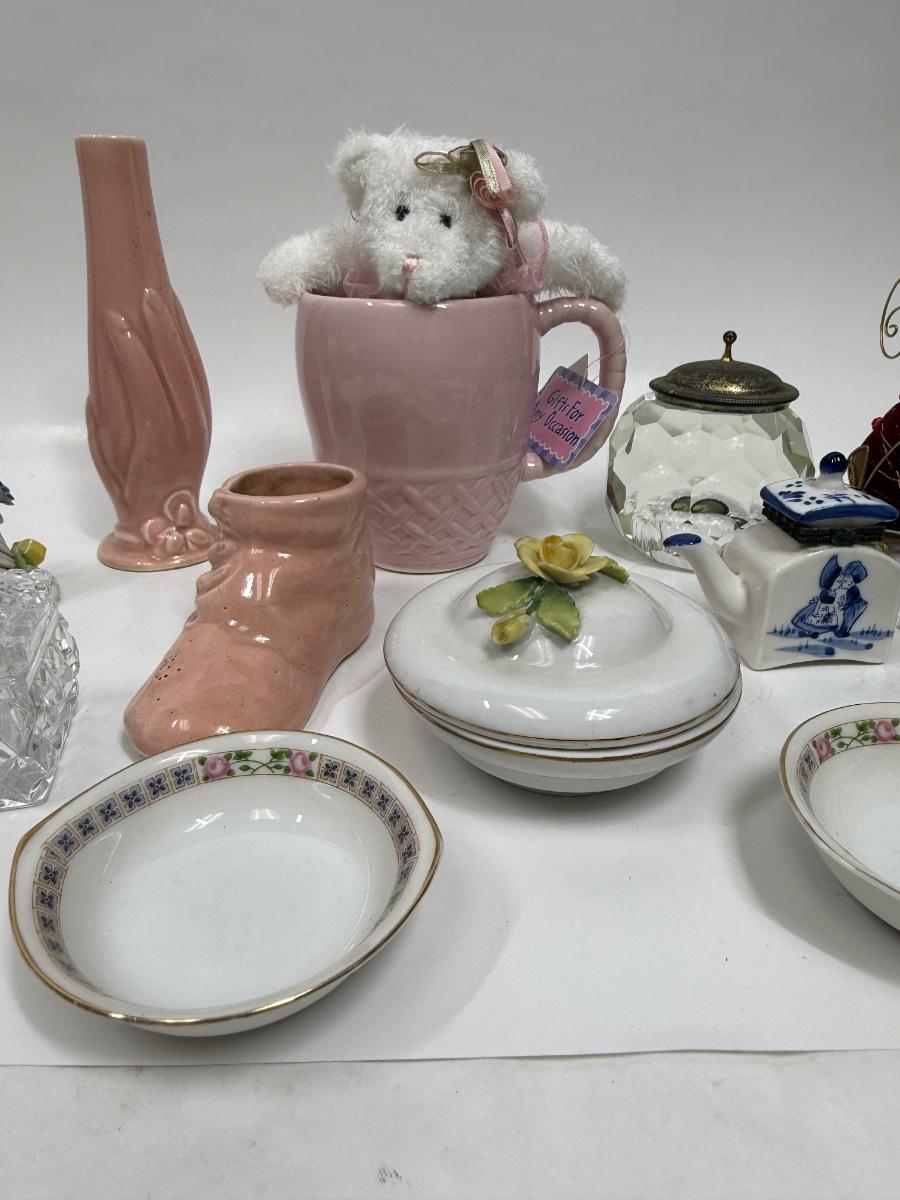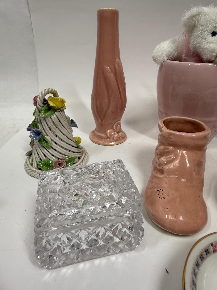 Misc small collectibles lot - USA pottery vase, crystal candle holder, pottery baby bootie,, etc