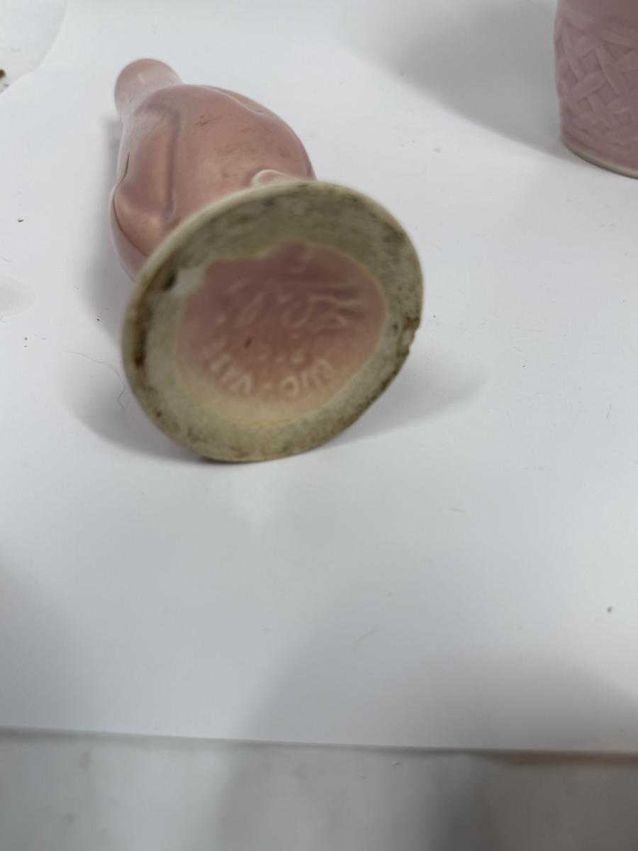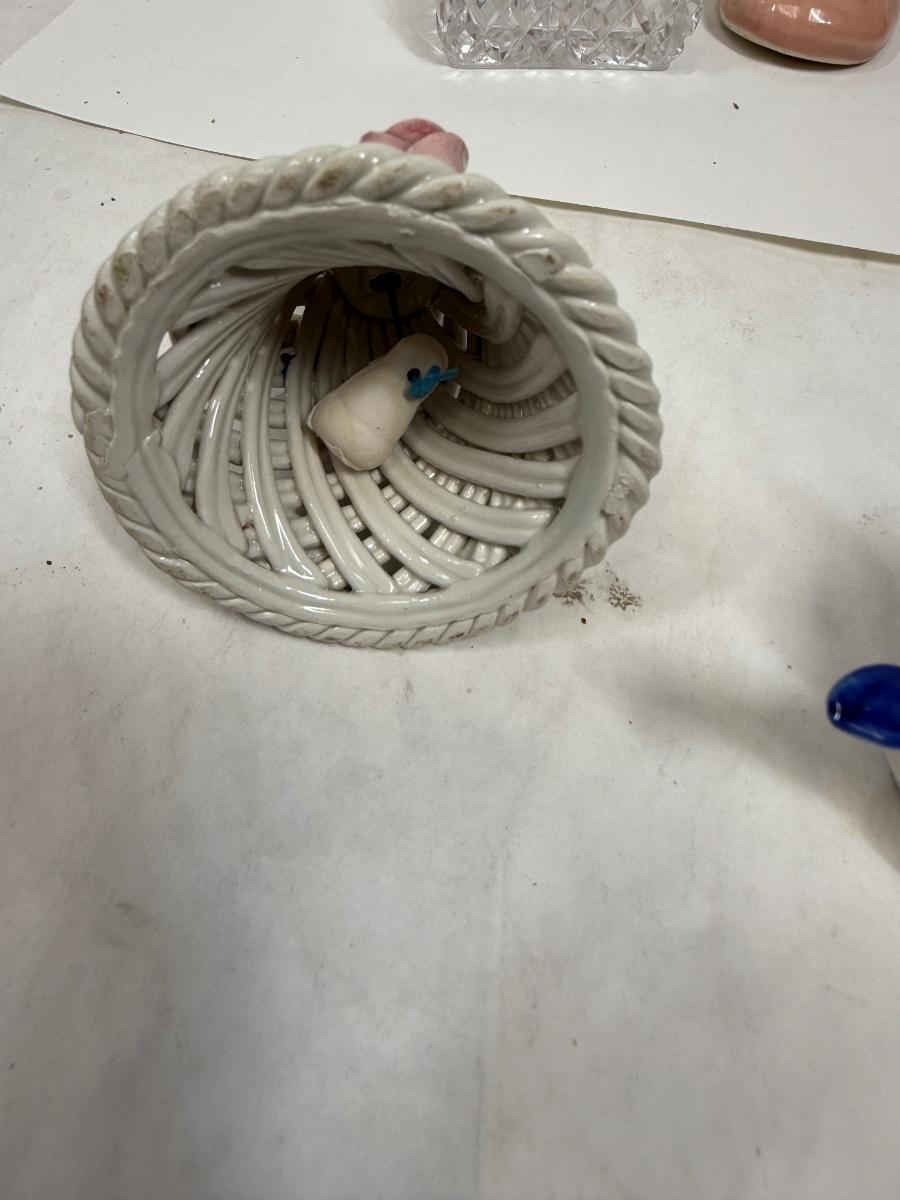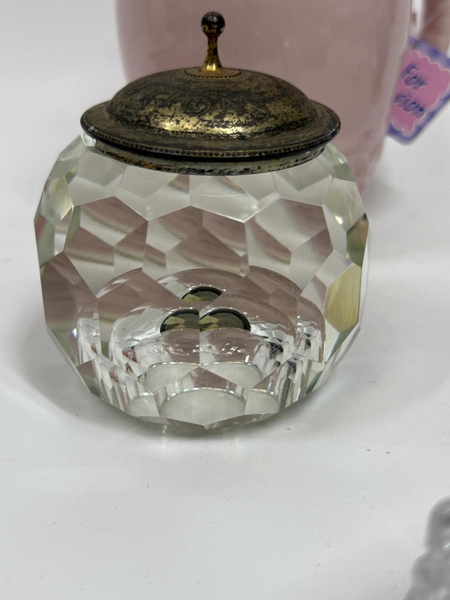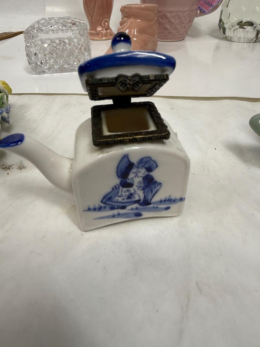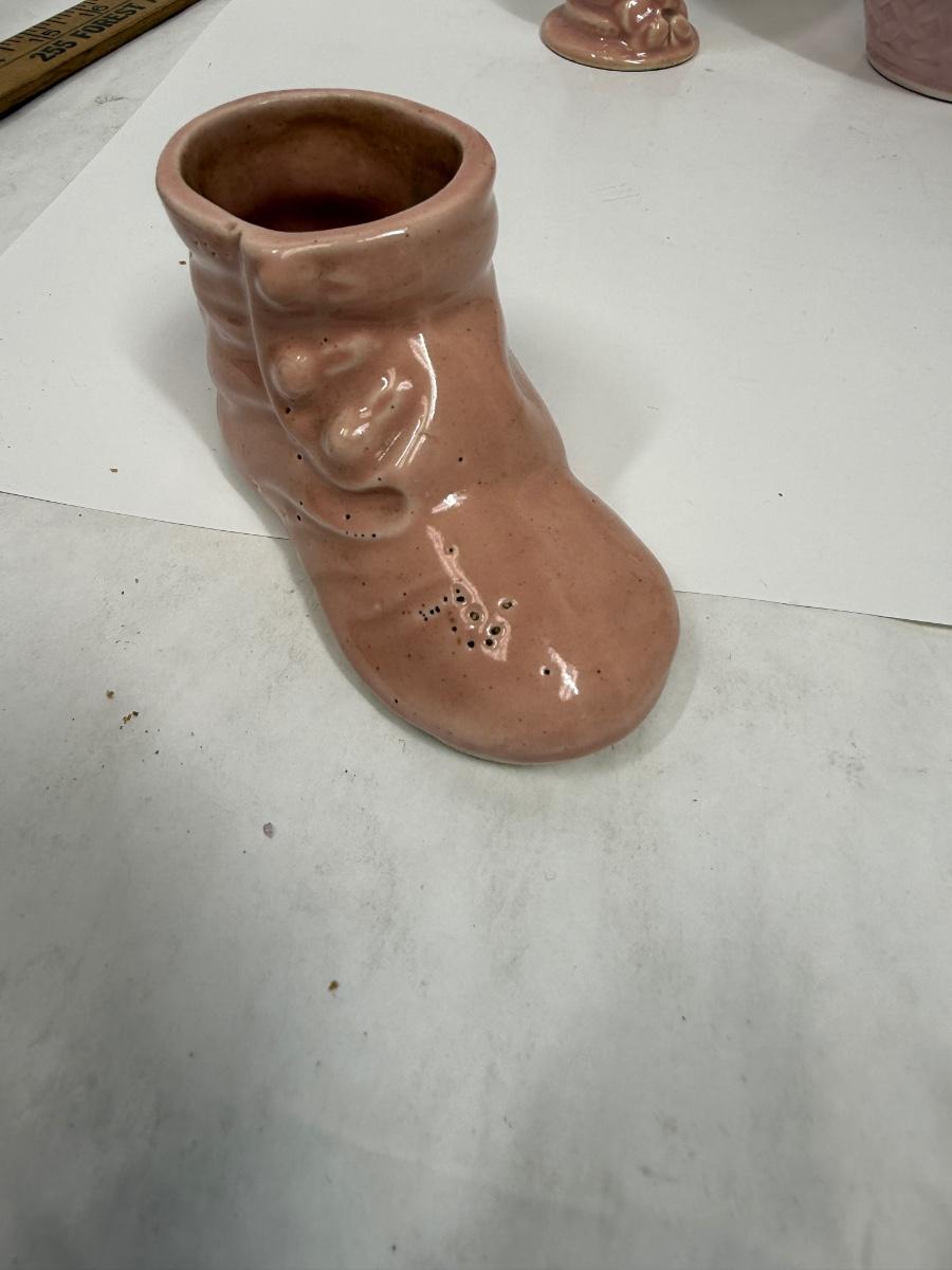 Misc small collectibles lot - USA pottery vase, crystal candle holder, pottery baby bootie,, etc