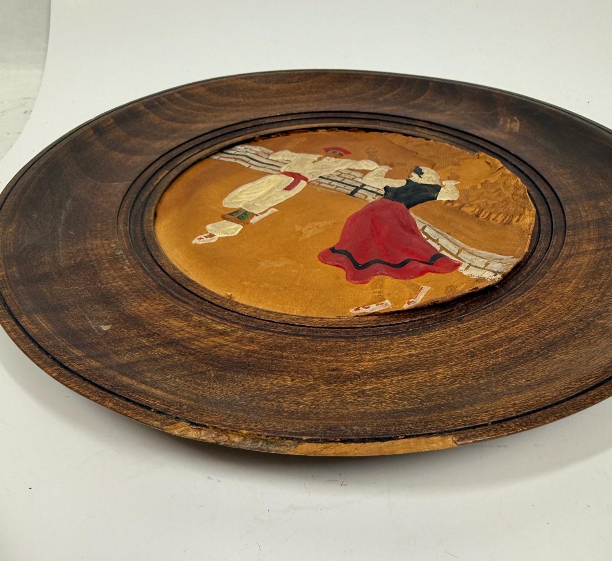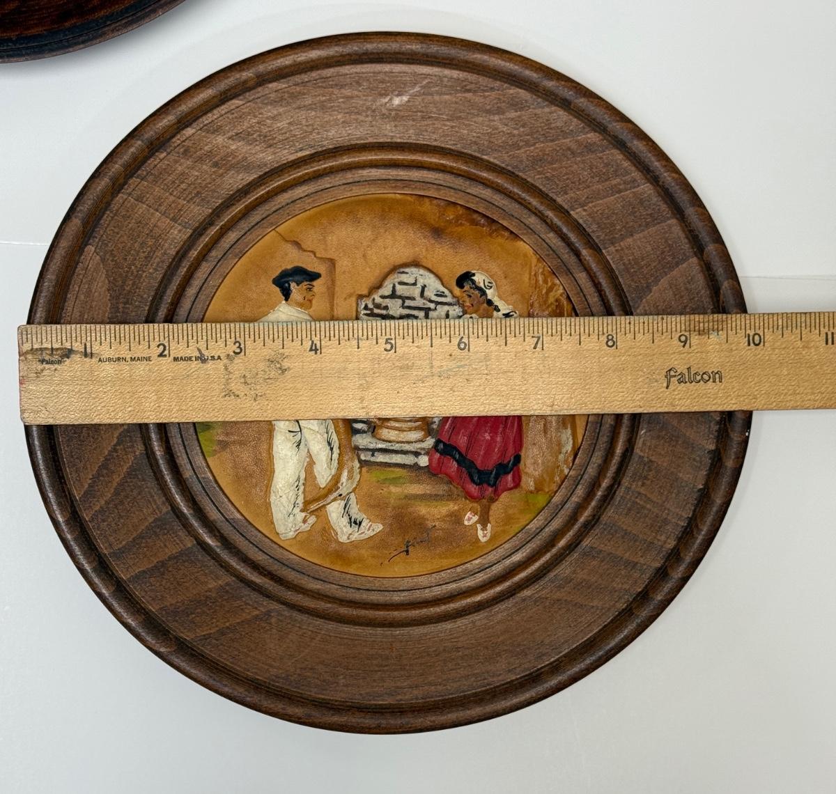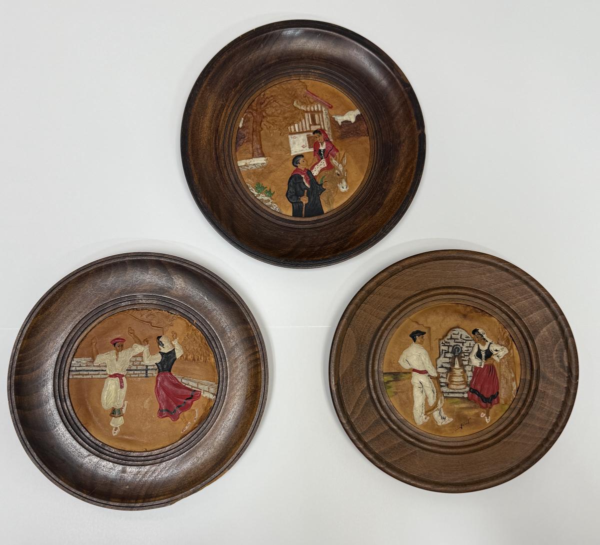 Set of 3 plates showing traditional Basque costumed dancers and villagers. Round wooden plates framing painted, embossed leather works of art. Plates are approx. 9.5" across. Very good condition.