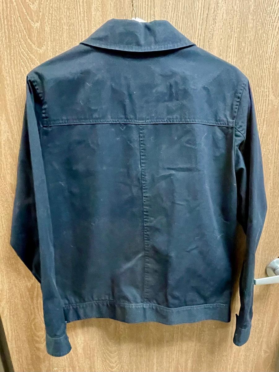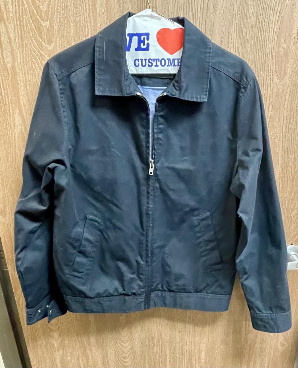 Nice dark blue canvas jacket, size L. Inside sky blue.