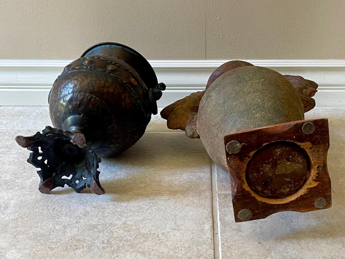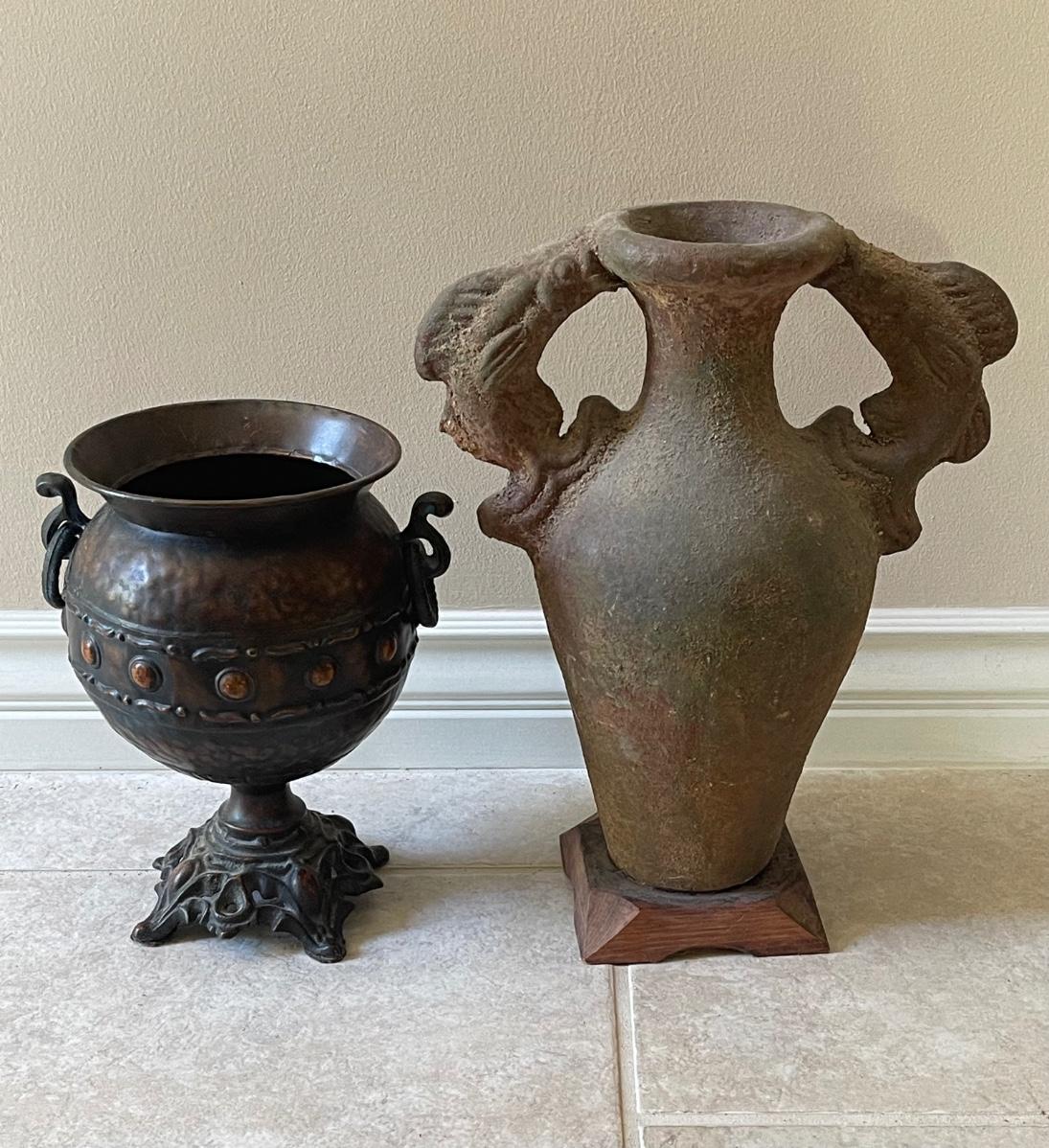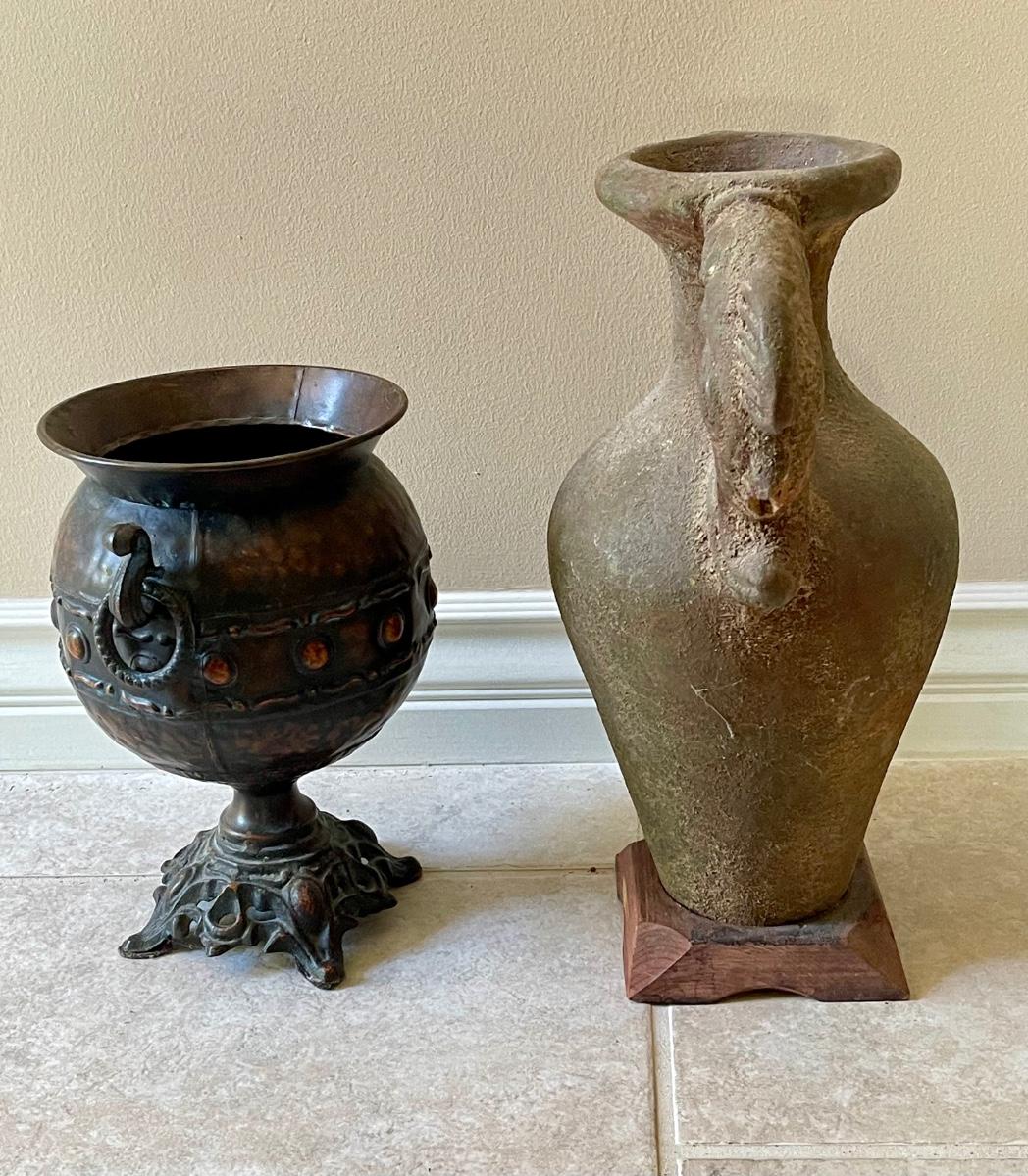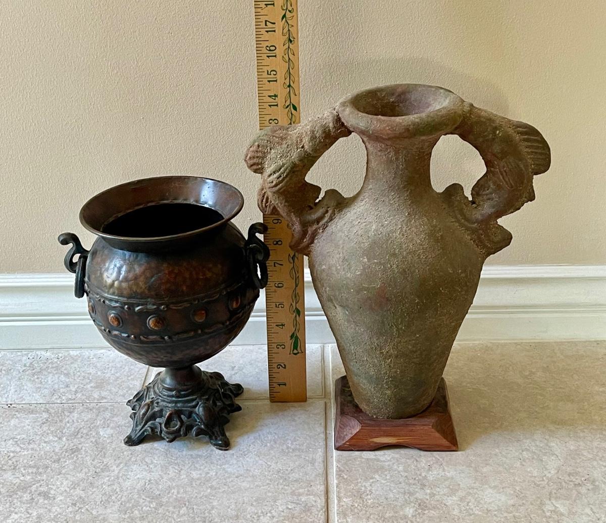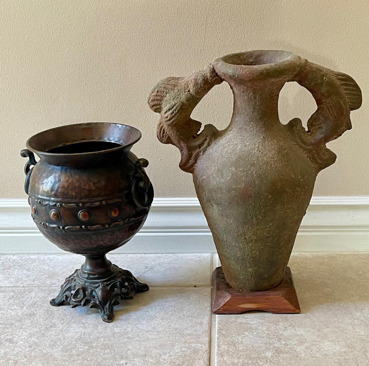 2 Vases - Metal Pedestal Vase & Terra-cotta Grecian Style with Fish shaped handles