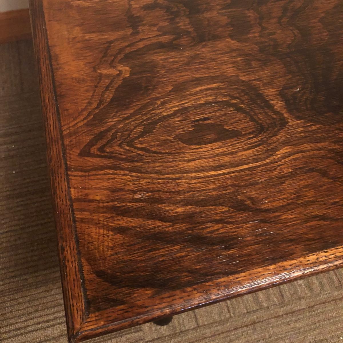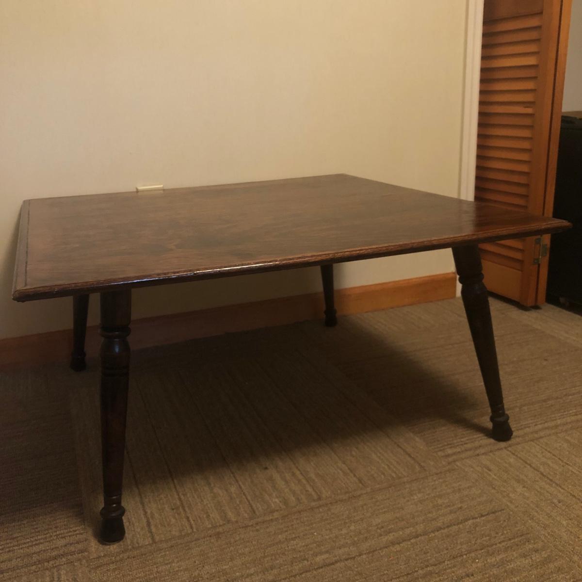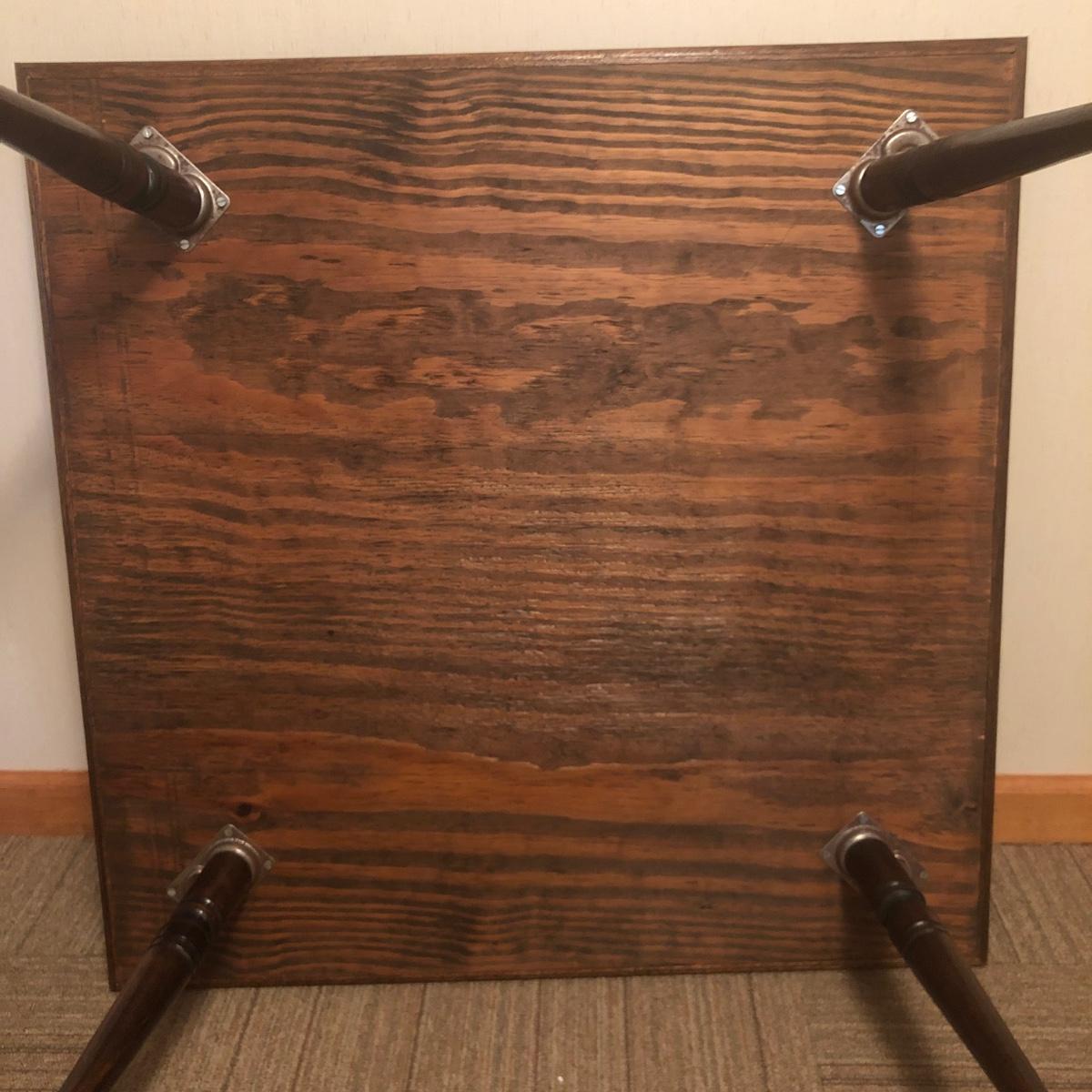 This solid wood coffee table is stained in a dark color and has four carved legs. There is a beautiful pattern of wood grain on the surface and underneath the table, which measures 33.25” x 33” x 16.75”. There are some marks on the table as pictured that are not very noticeable. One of the legs is loose but attached. Local pickup only.