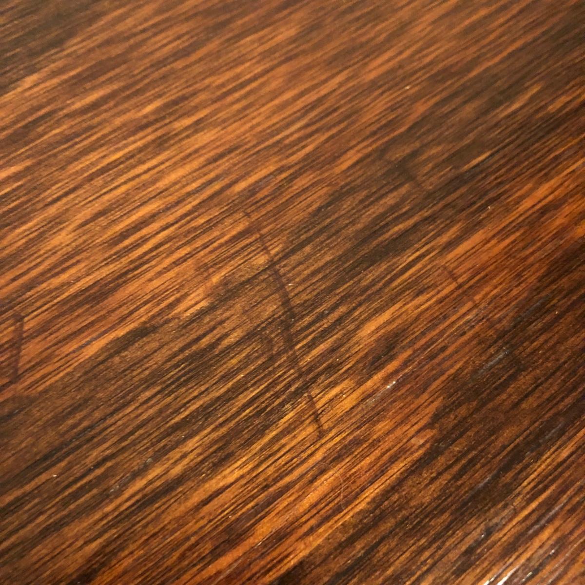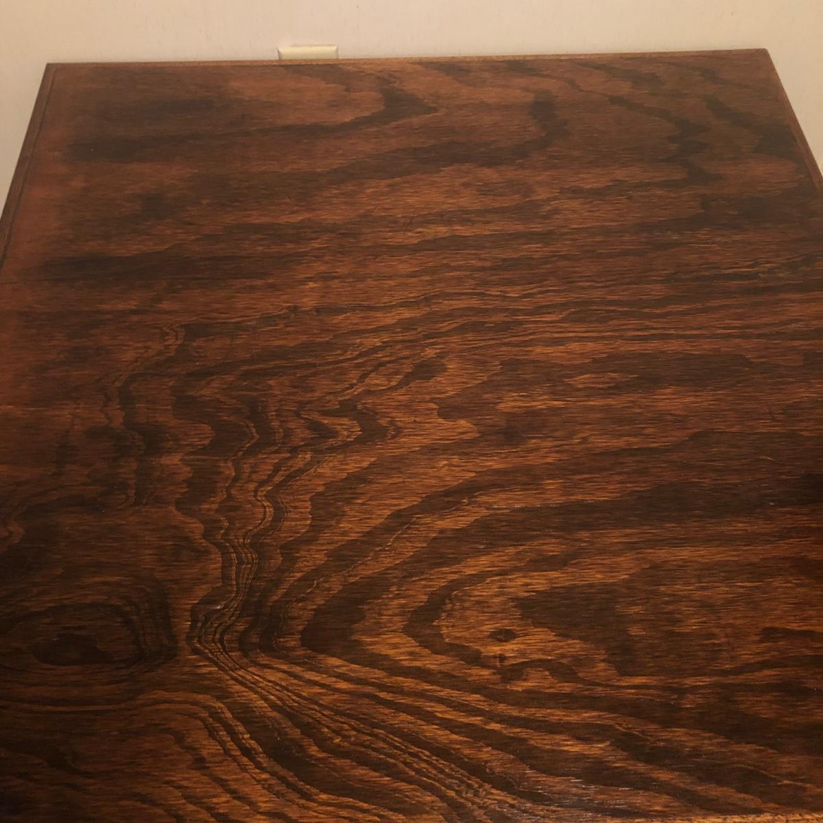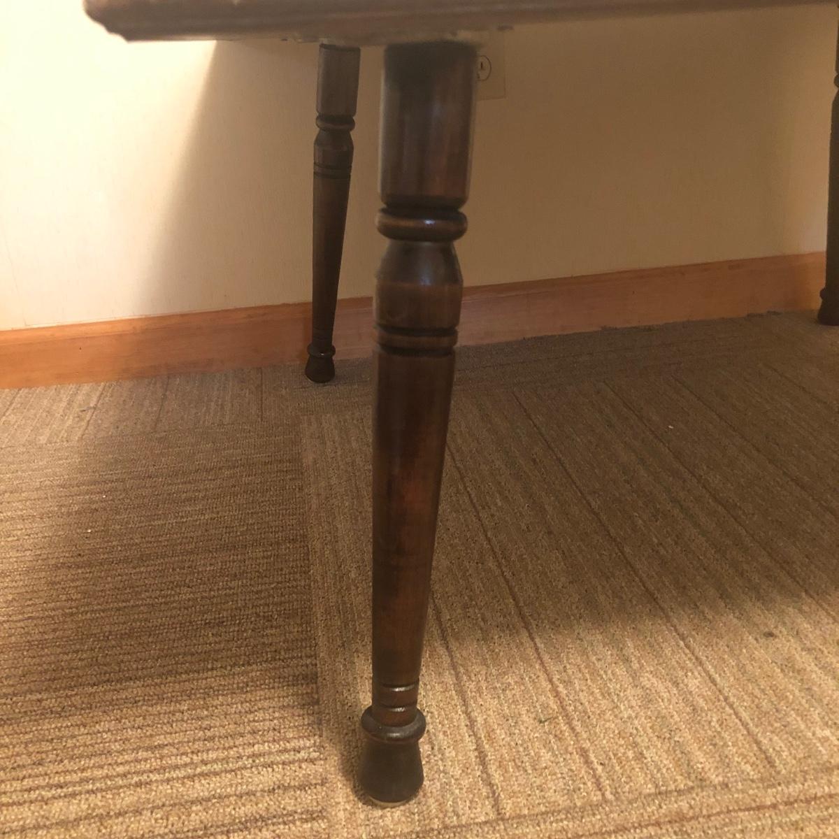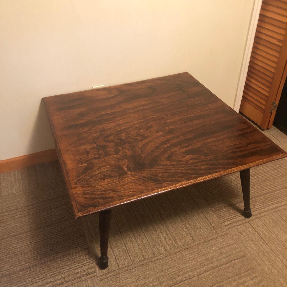 This solid wood coffee table is stained in a dark color and has four carved legs. There is a beautiful pattern of wood grain on the surface and underneath the table, which measures 33.25” x 33” x 16.75”. There are some marks on the table as pictured that are not very noticeable. One of the legs is loose but attached. Local pickup only.