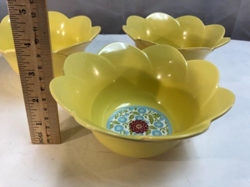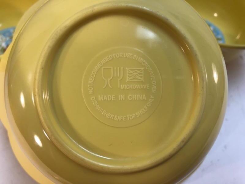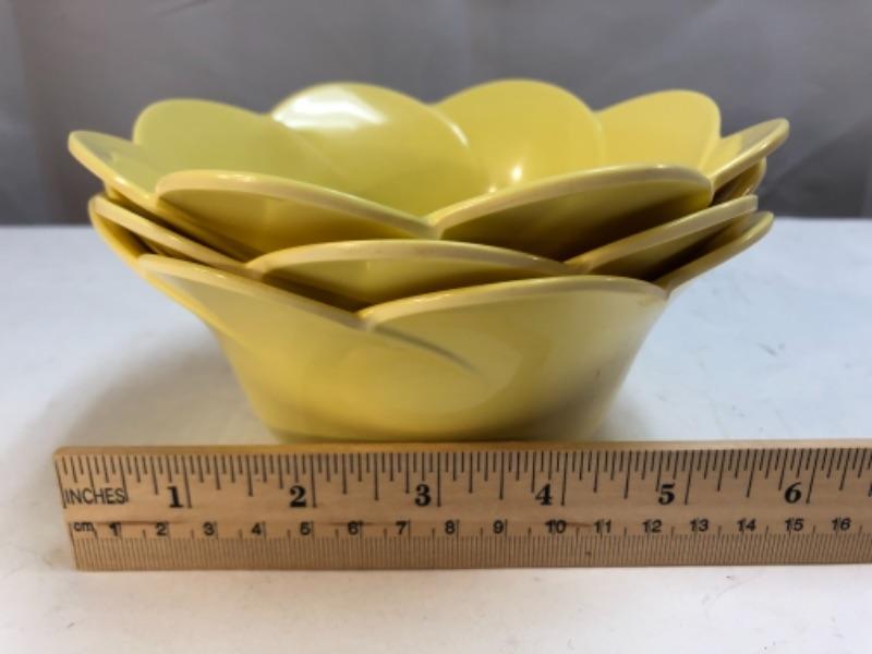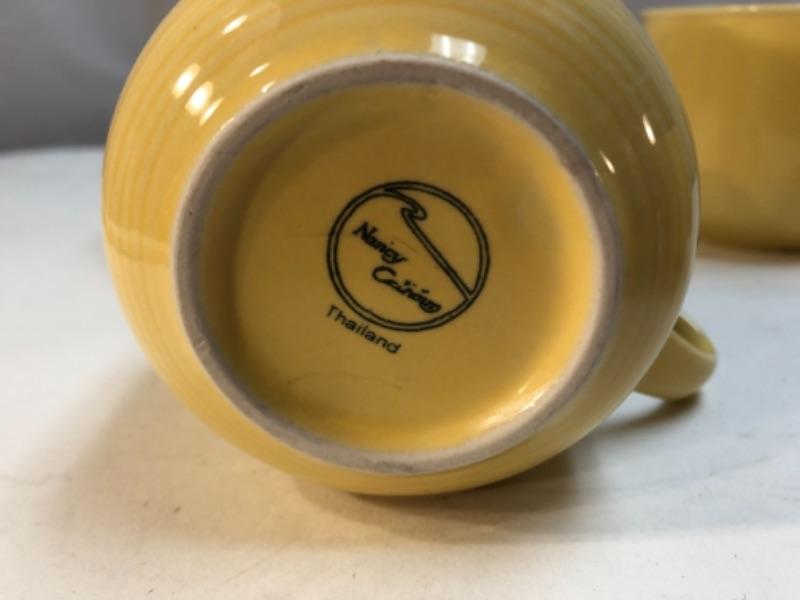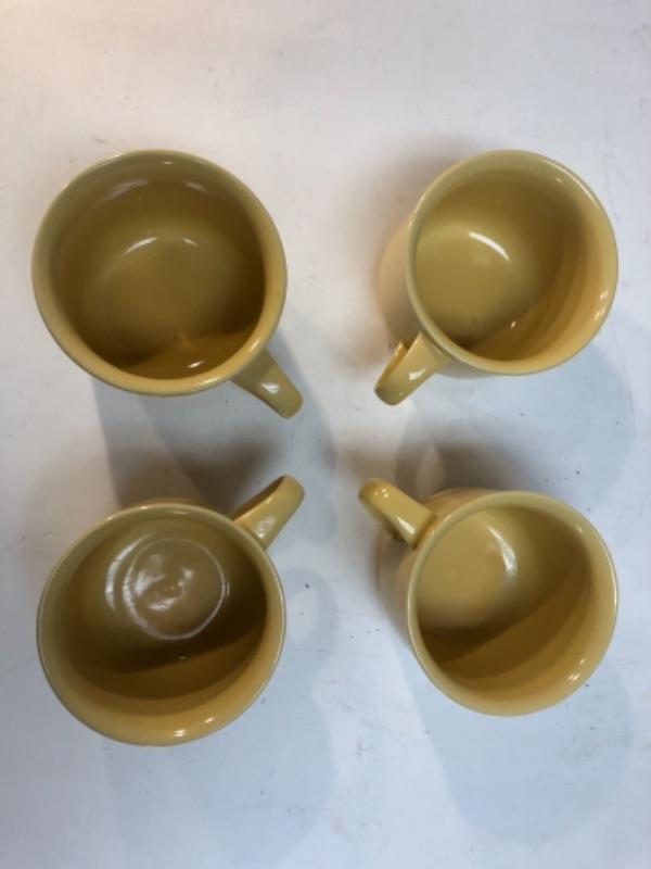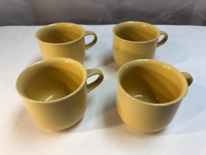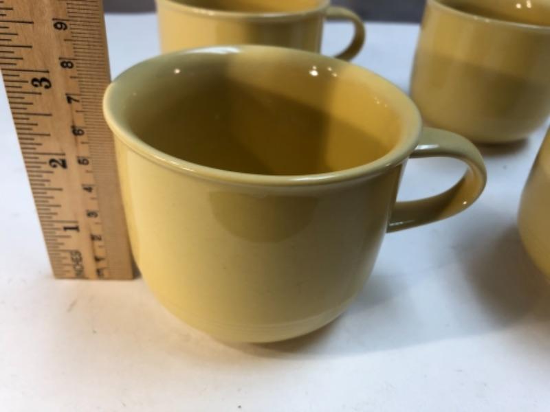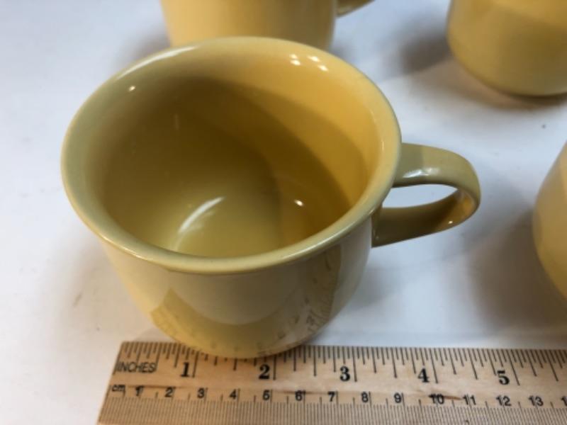 Mustard yellow coffee cups and bowls. Mixed brands. 4 cups and 3 bowls. Cups are ceramic, bowls are melamine.