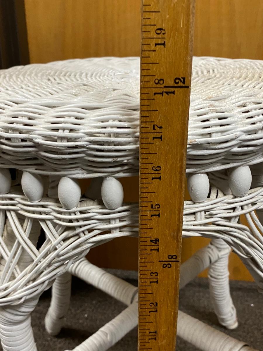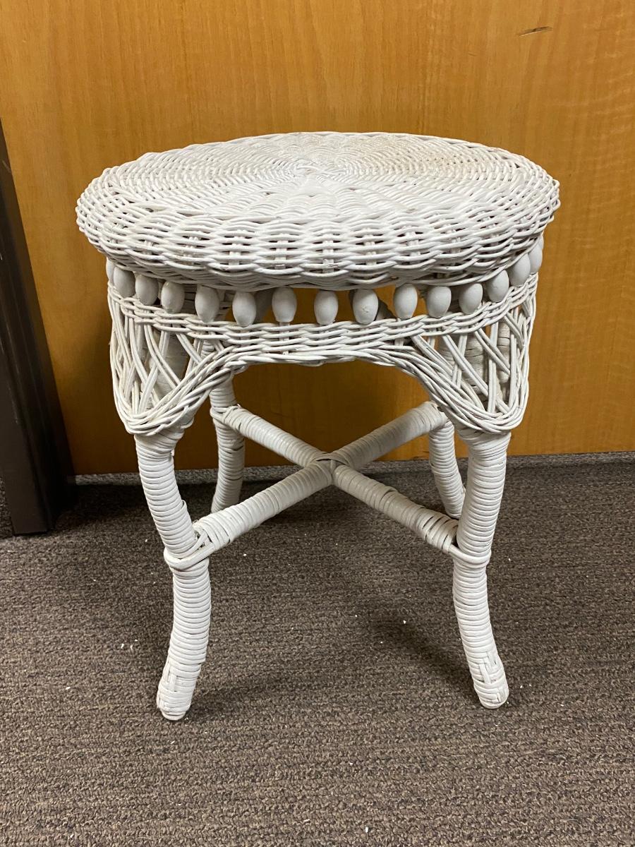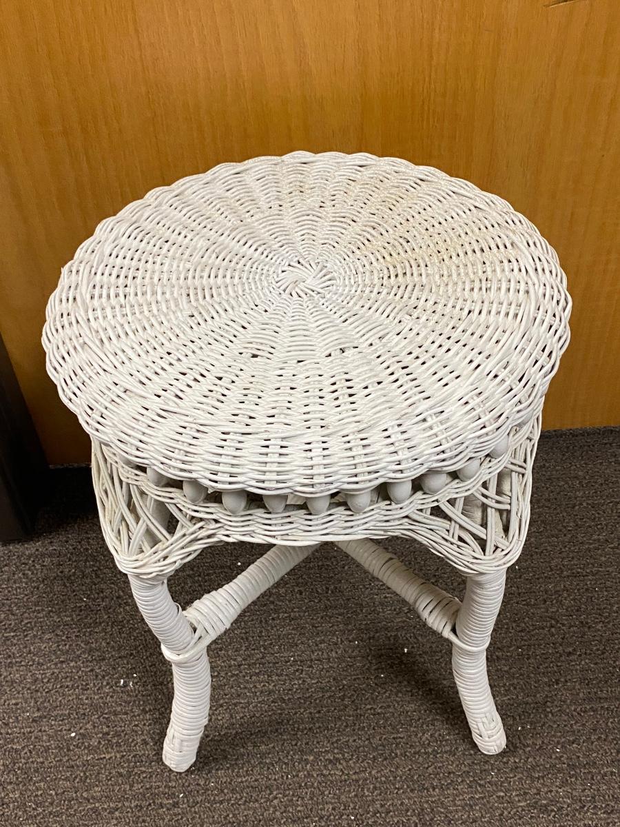 Vintage White Painted Round Wicker Woven Plant Stand Side Table Stool Seat. In good condition, sturdy. Light surface wear to paint, can easily be repainted as desired. About 18" tall and 14" diameter.