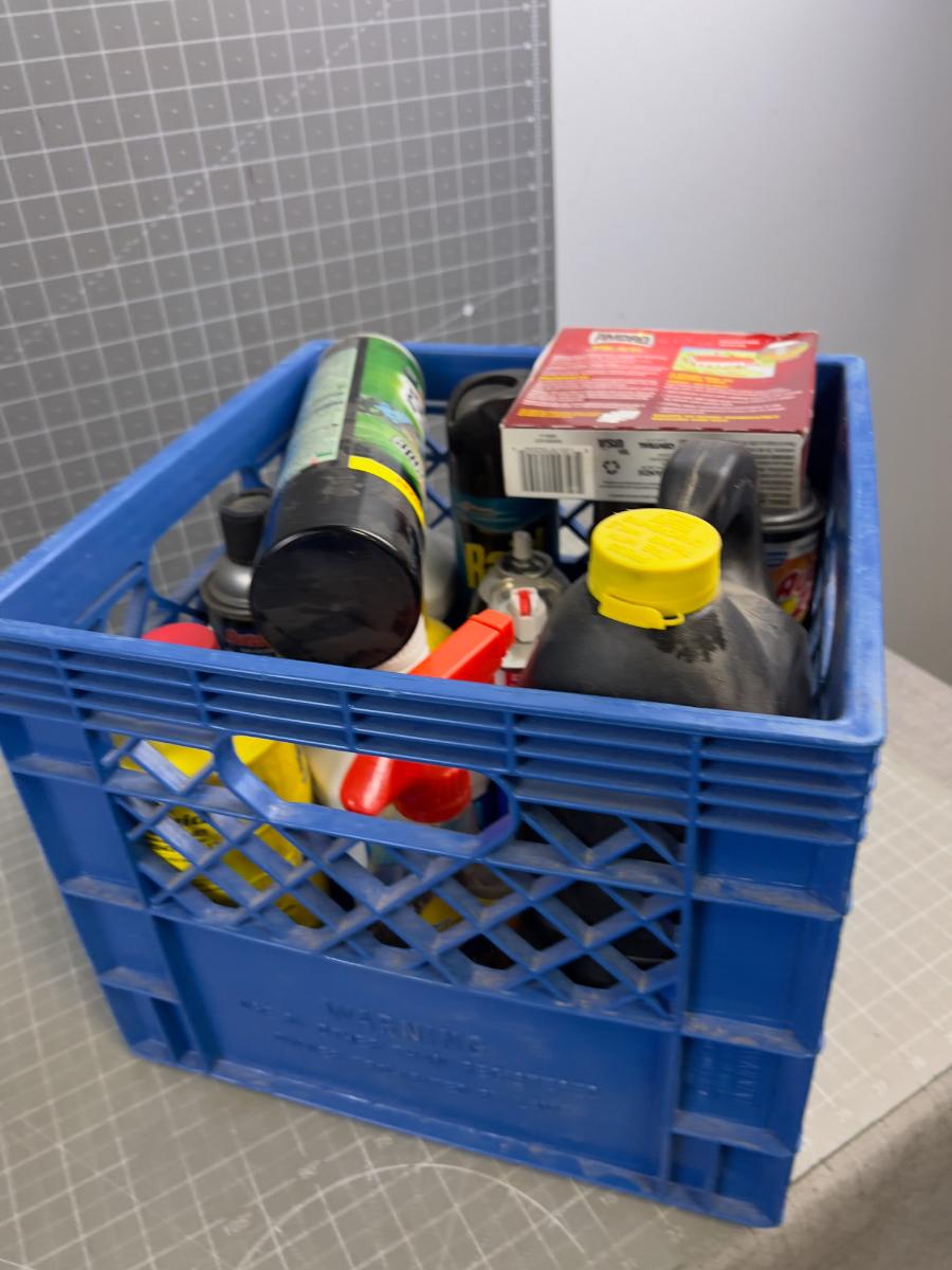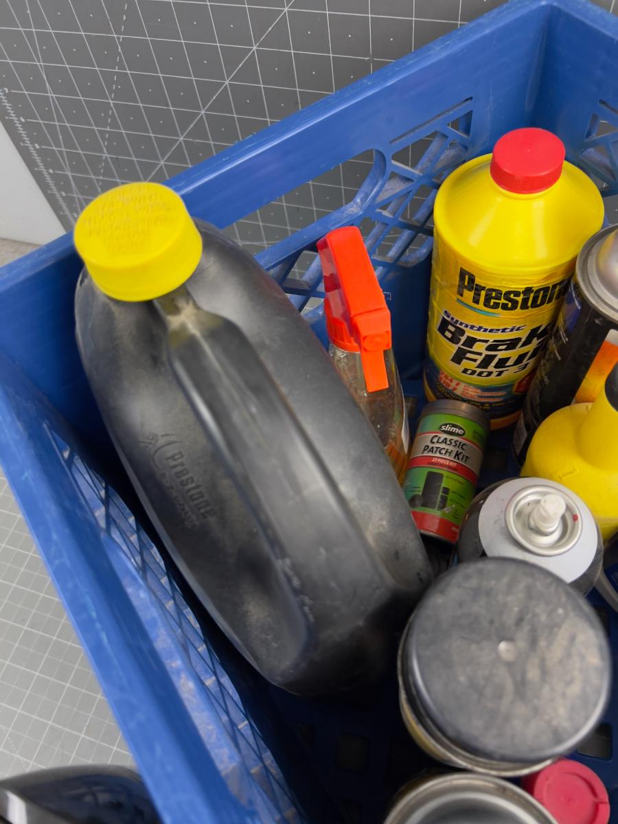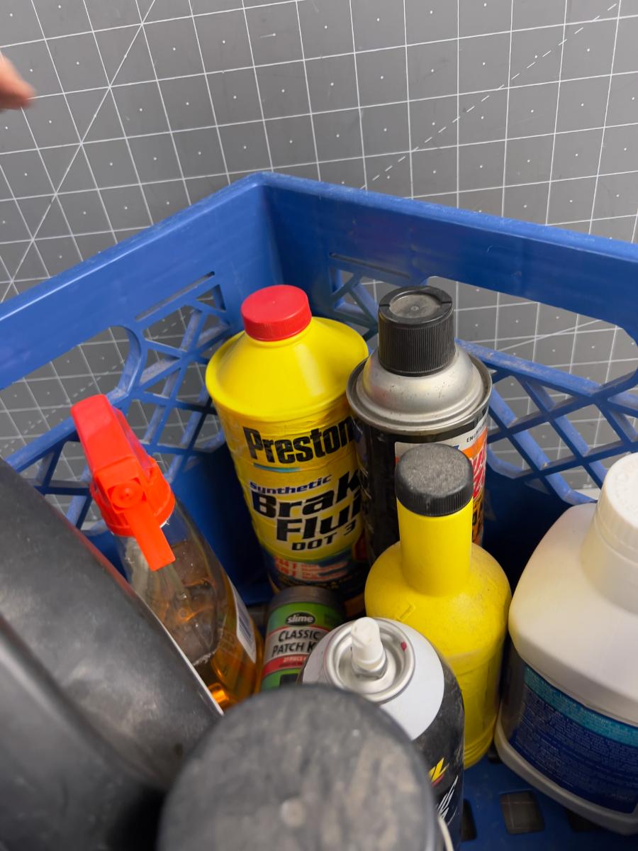 Tub of Garage FLUIDS: Brake Fluid, Liquid Sand Paper, etc.