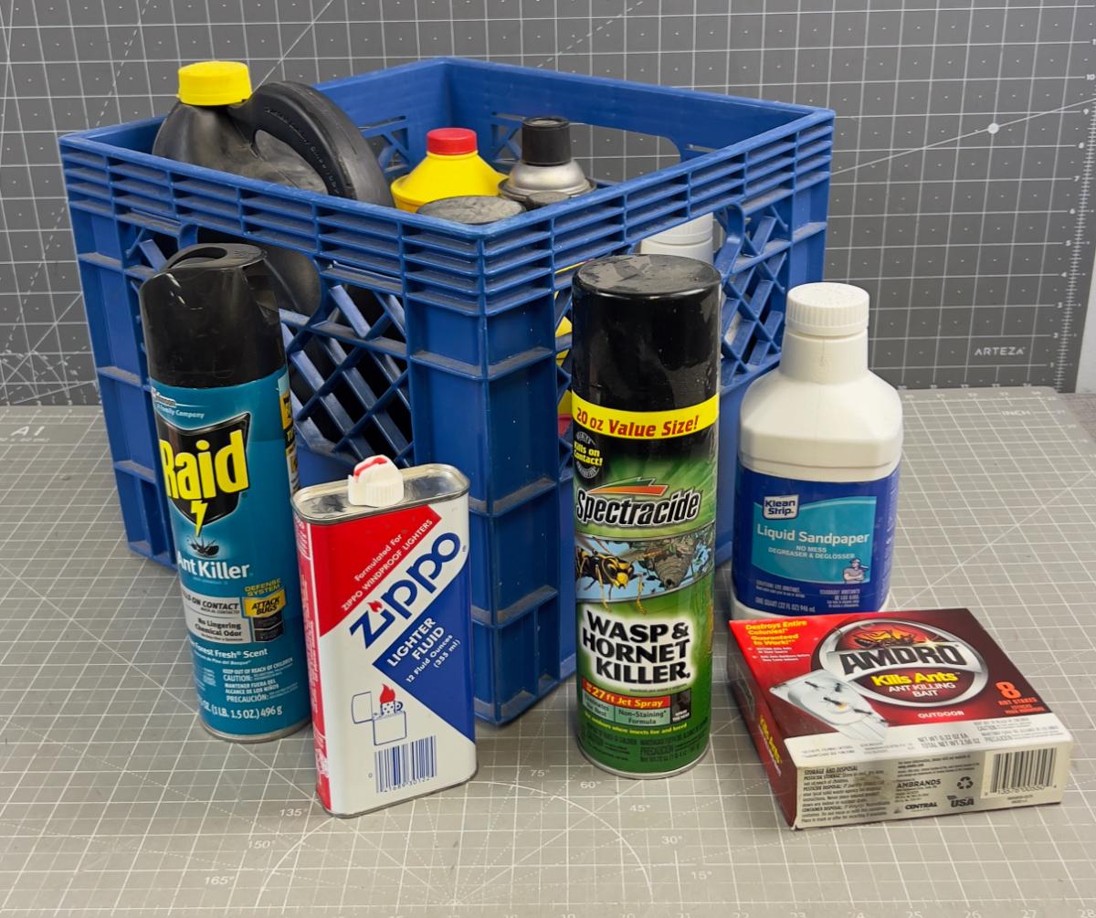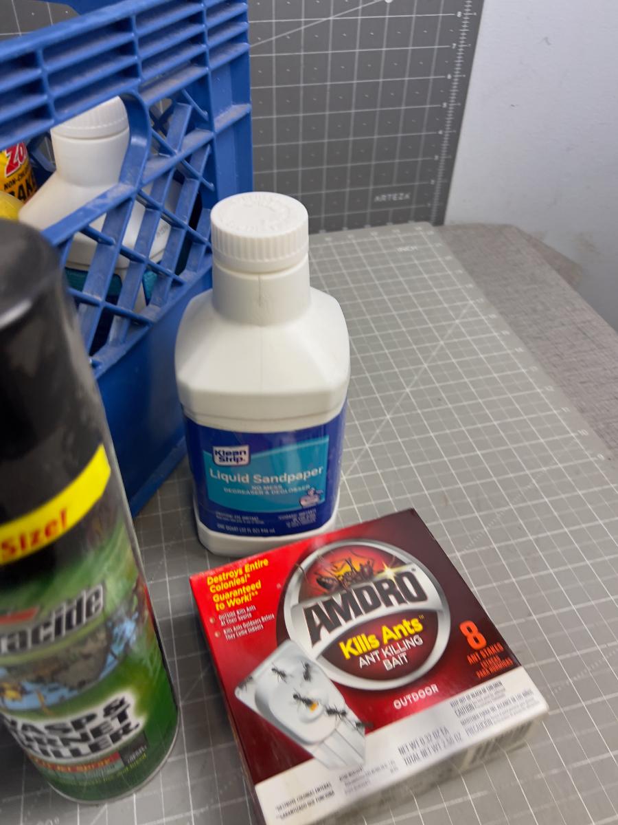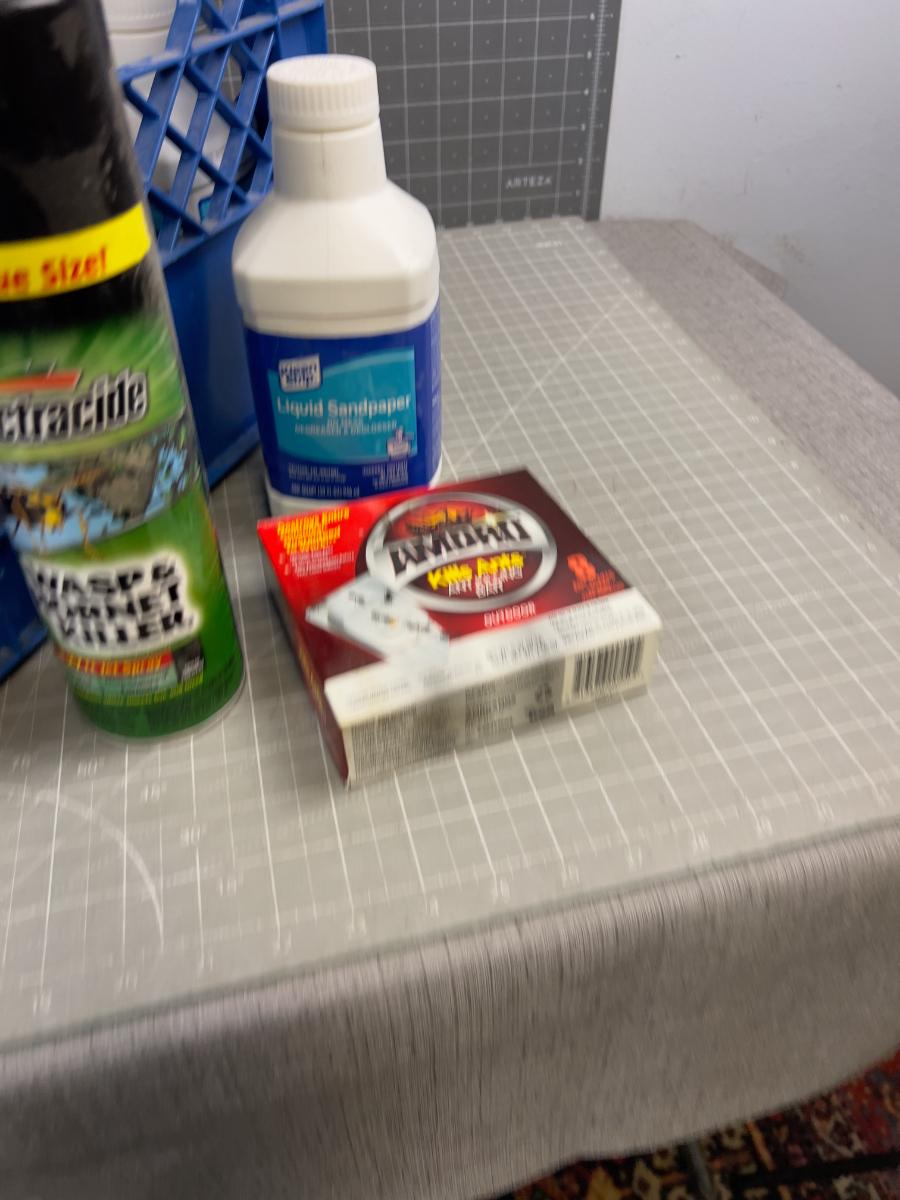 Tub of Garage FLUIDS: Brake Fluid, Liquid Sand Paper, etc.