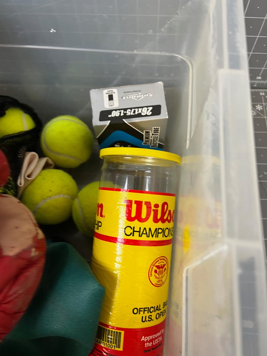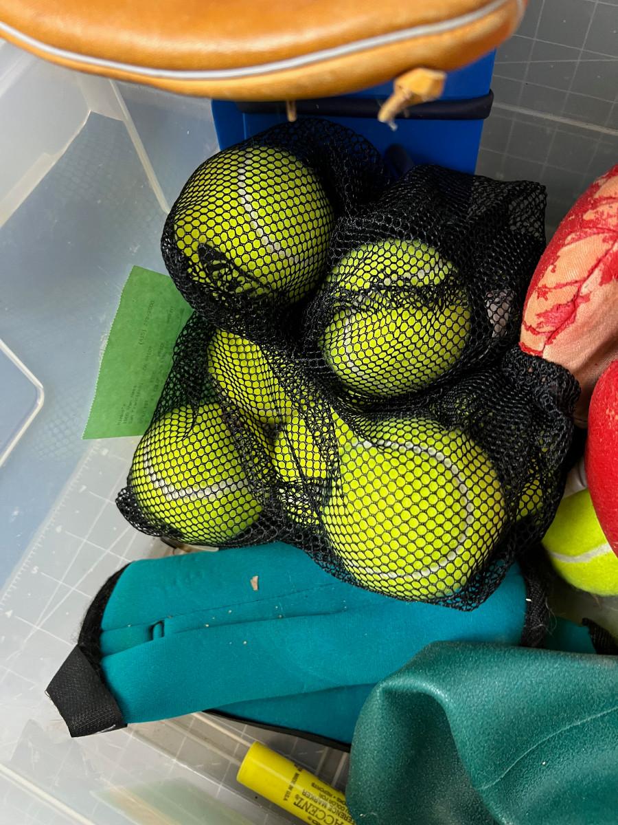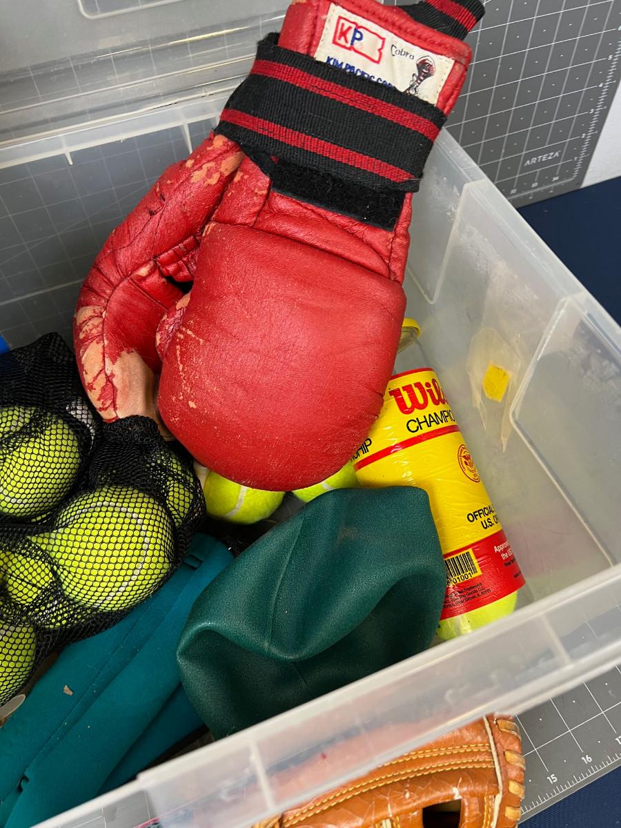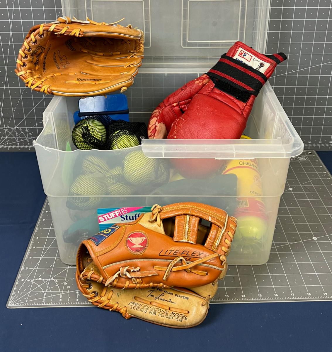 Tub of Outdoor Sport Item: Tennis Ball, Mitt, Boxing Glove