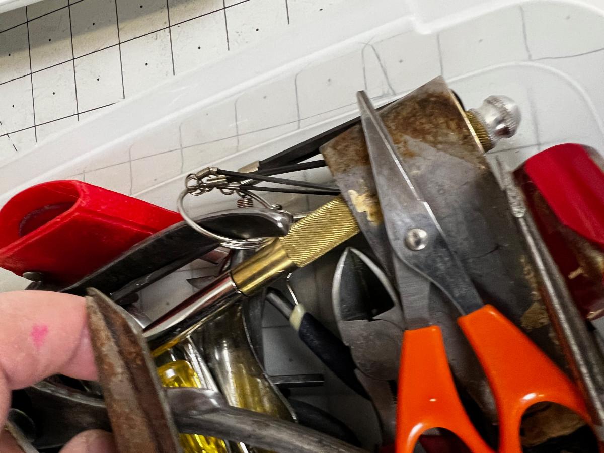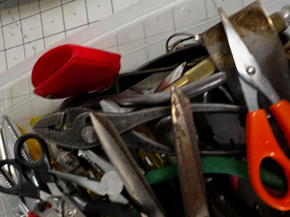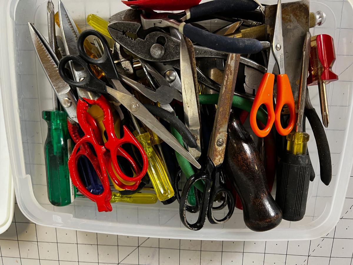 Tub of Tools: Screwdriveivers, Putty knife, Plyers and wire cutters