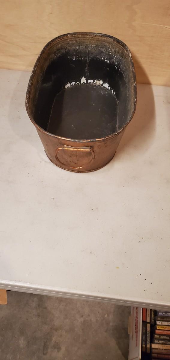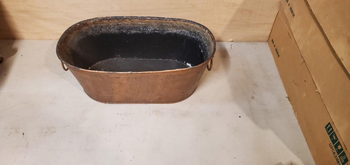 18 in long x10 in wide this metal tub has a brushed copper look with handles on both ends