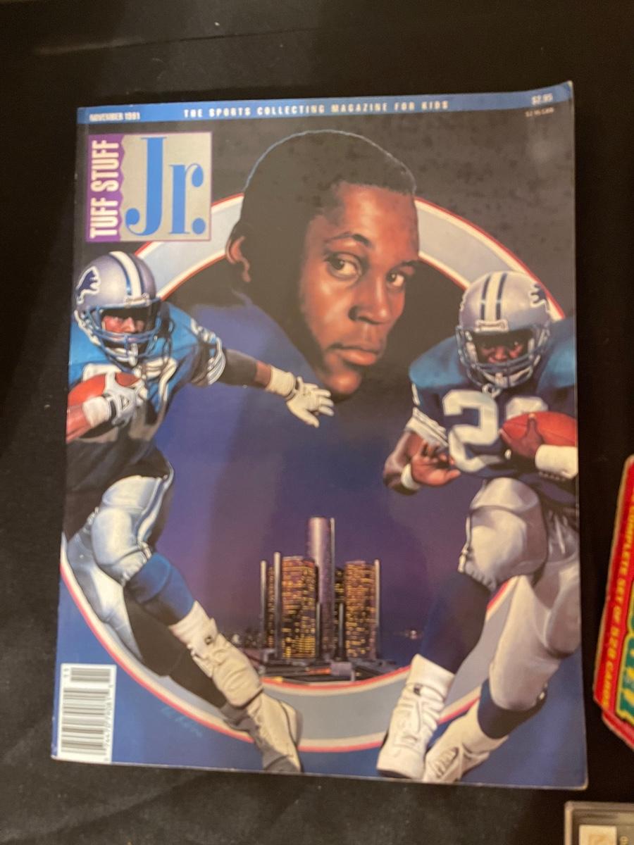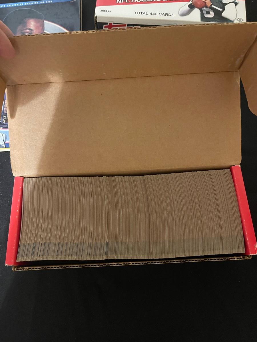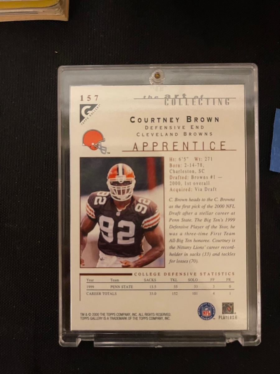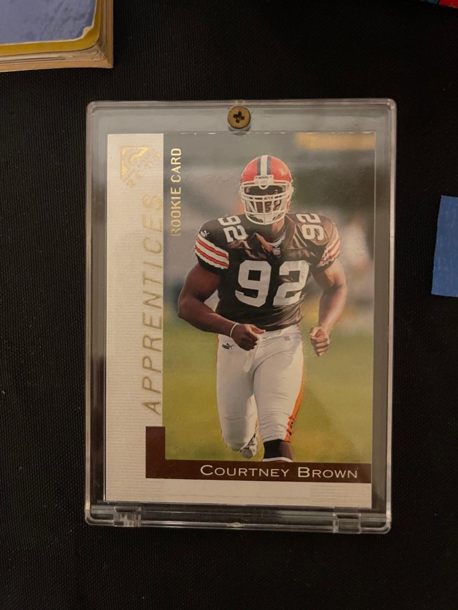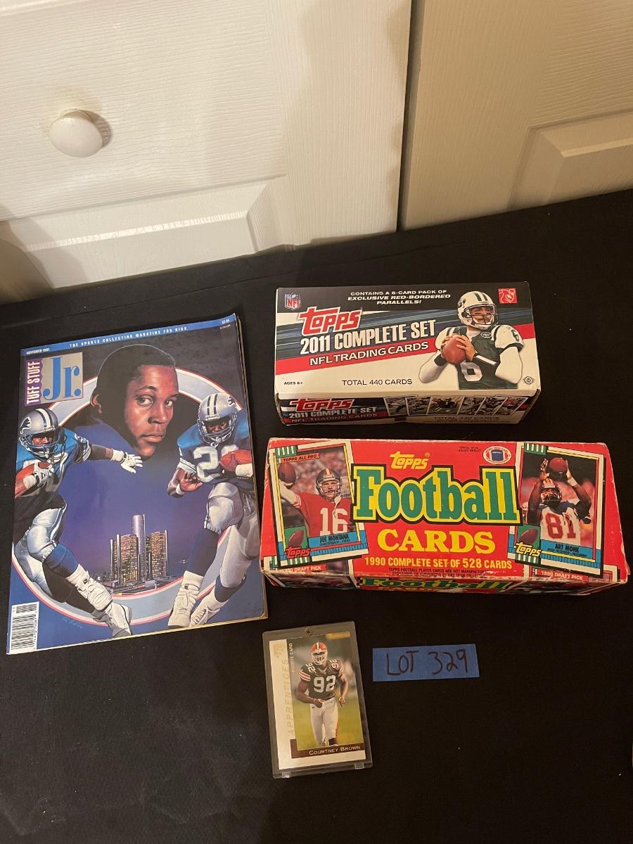 Tuff Stuff Jr. 1991 magazine, Courtney Brown Rookie card, 1990 Topps football cards, 2011 Topps NFL trading cards.