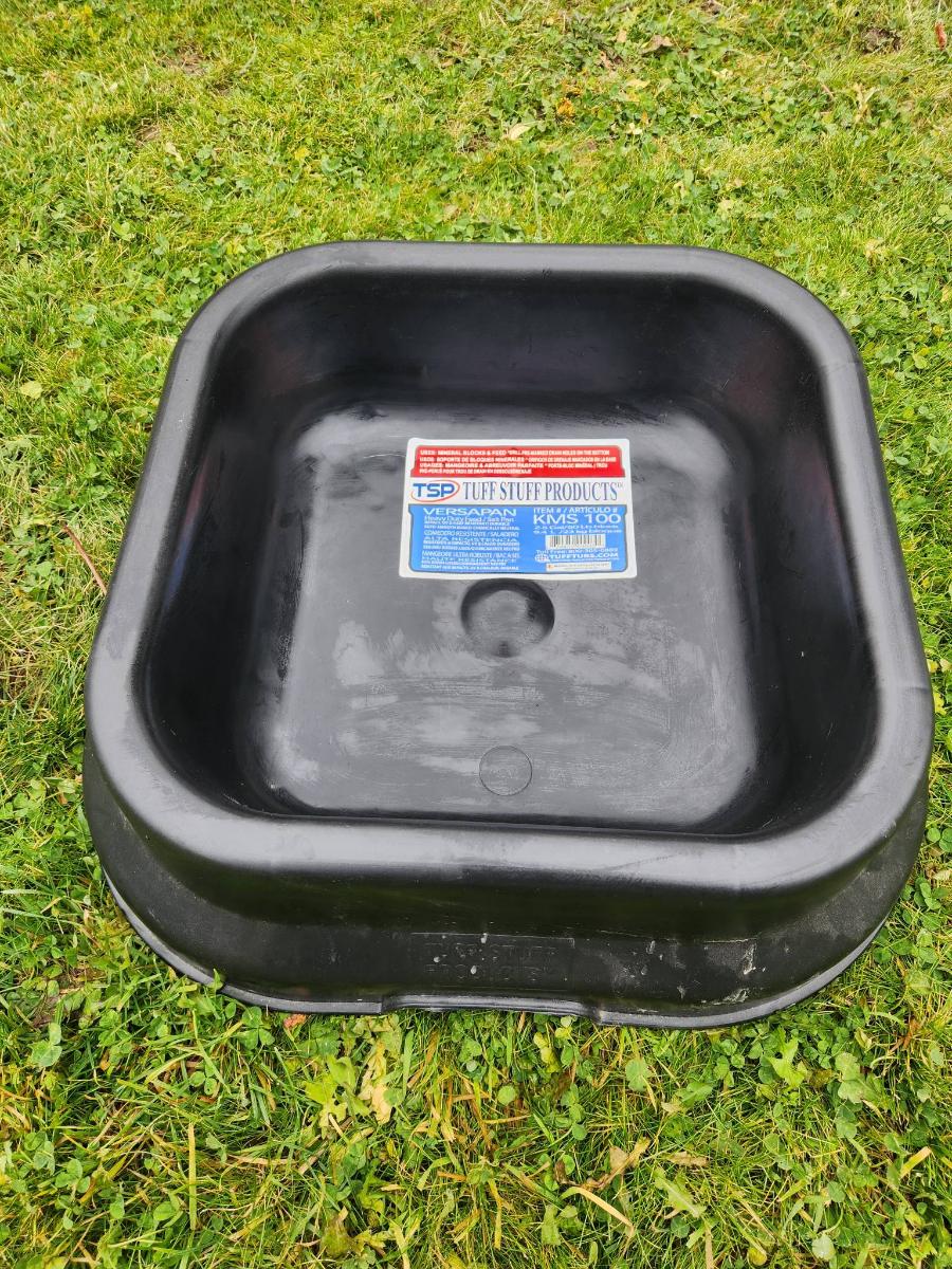 Tuff Stuff Products Versapan KMS100 pan designed for versatile fluid containment. Made of durable, high-density polyethylene, suitable for oil and fluid changes. Features a wide, stable base and reinforced side handles for easy handling. Measures 4.25 gallons (16.09 liters) capacity per the label. Ideal for automotive and general maintenance applications.