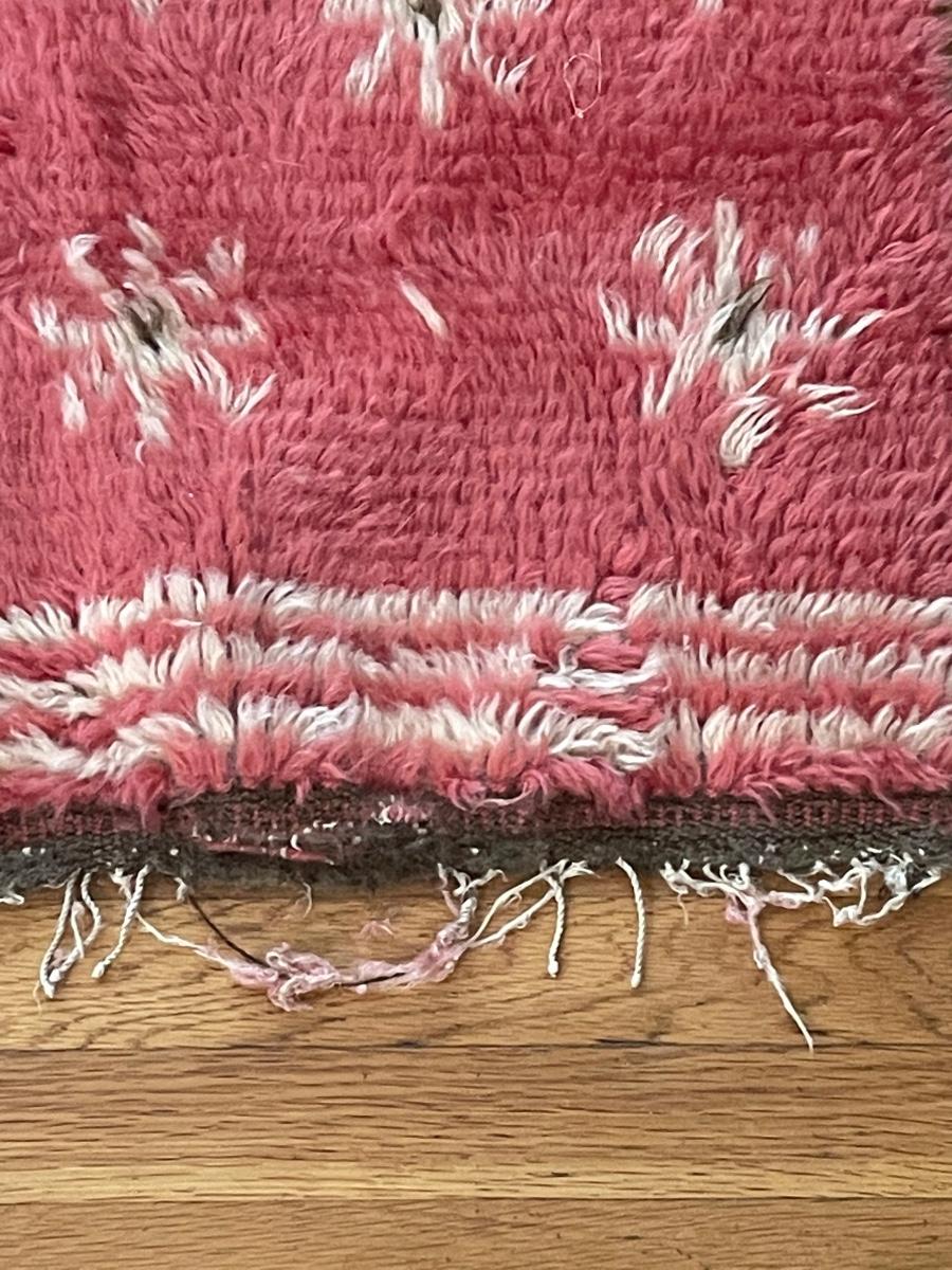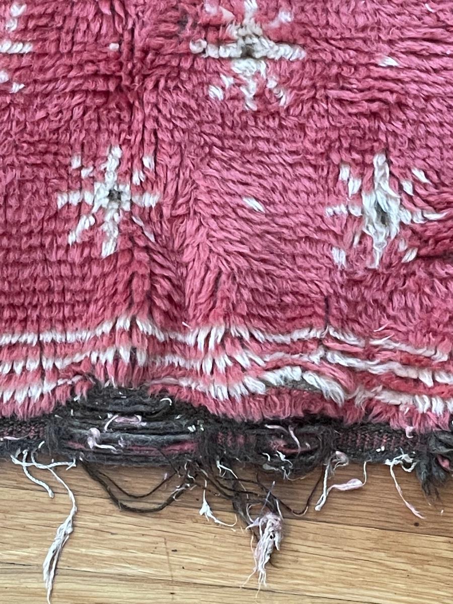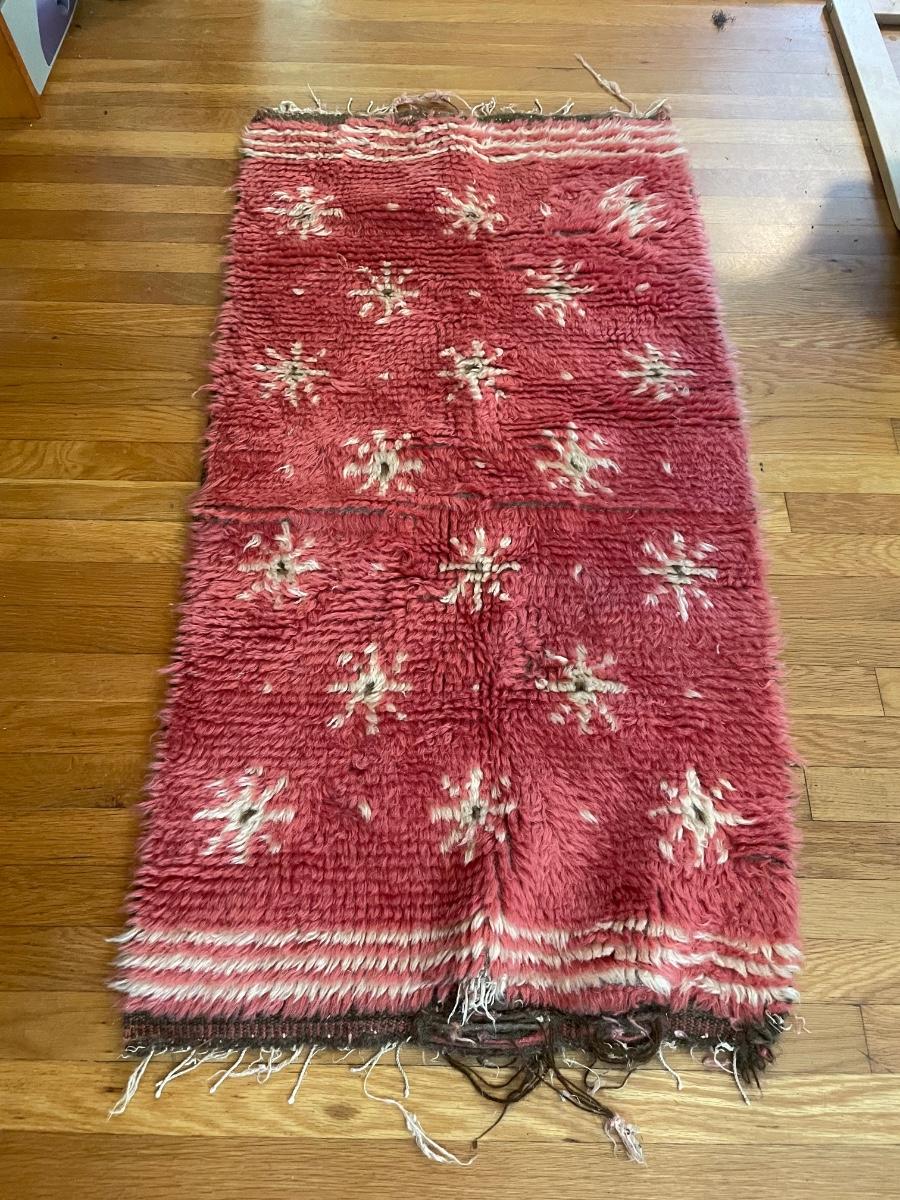 This lovely rug is a dark pink color with cream and brown accents. There is some fraying on the one end, see images but otherwise it is in good condition.It measures 27” x 52”.