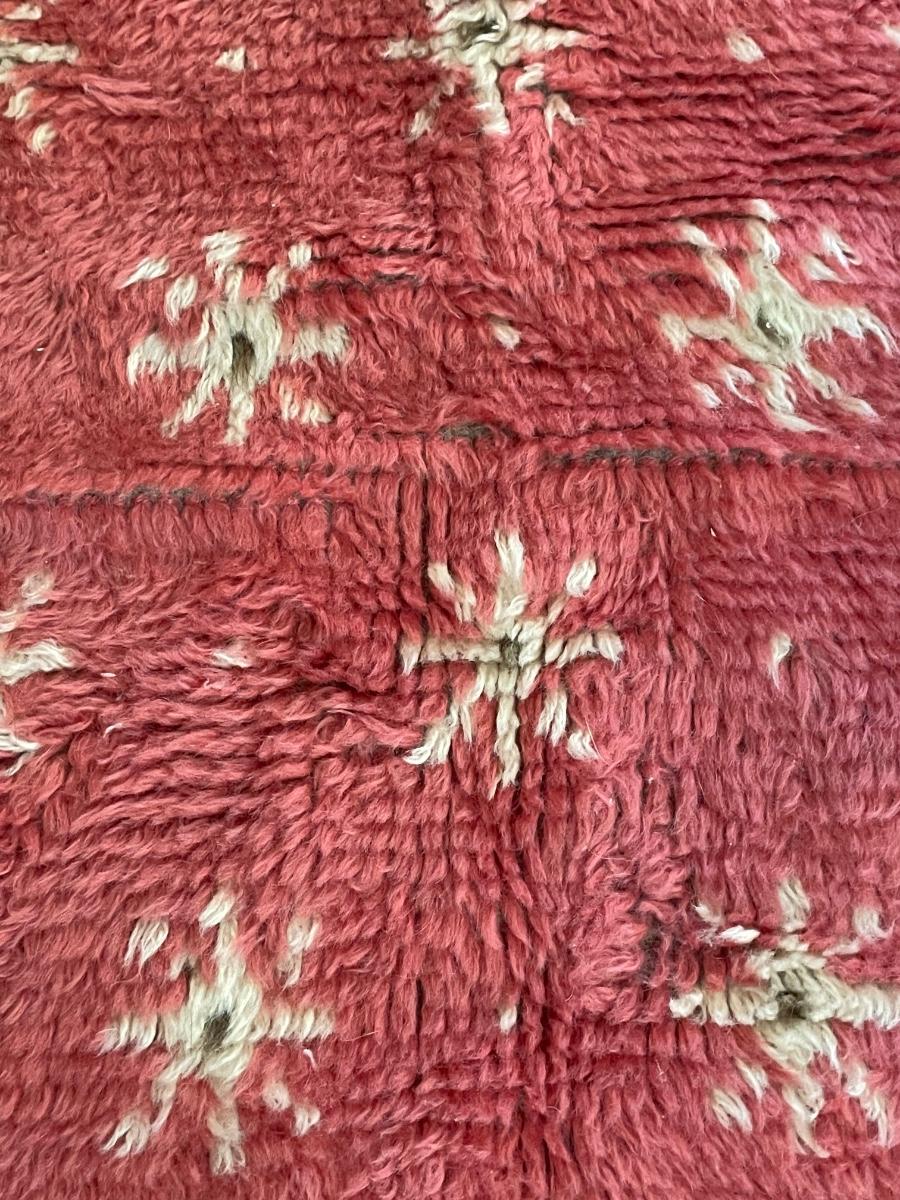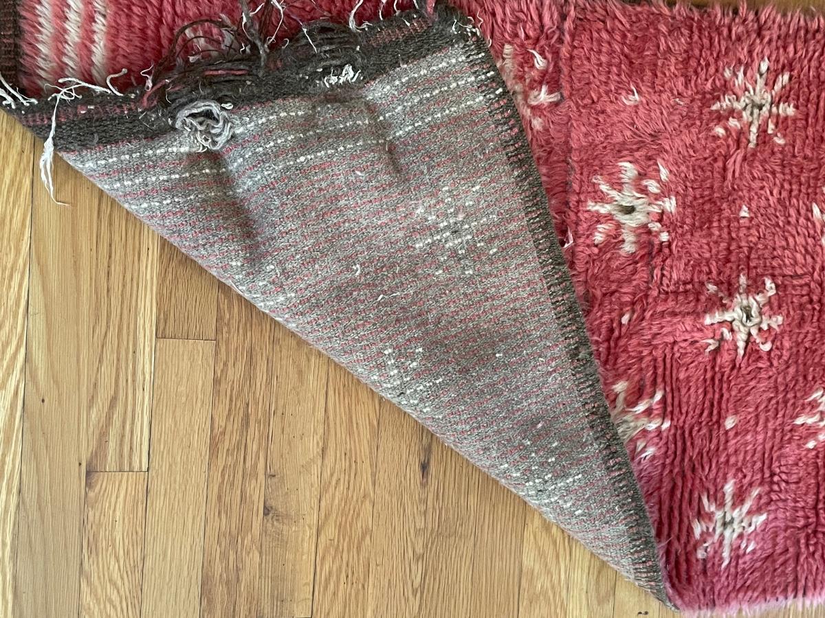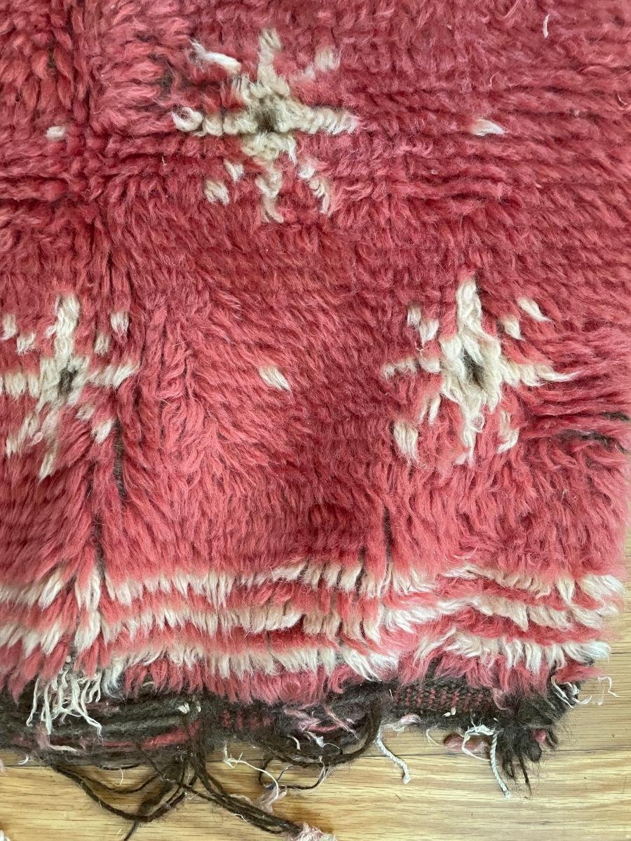 This lovely rug is a dark pink color with cream and brown accents. There is some fraying on the one end, see images but otherwise it is in good condition.It measures 27” x 52”.