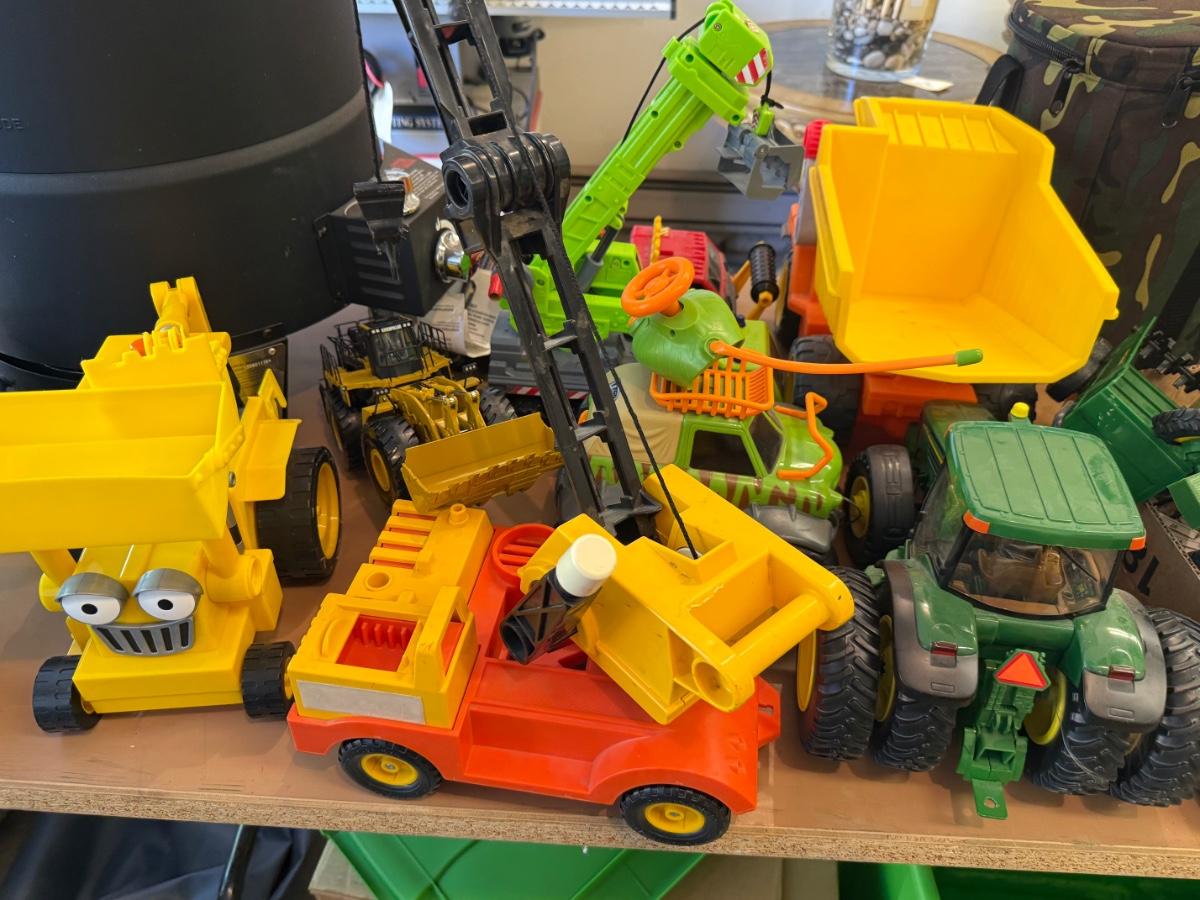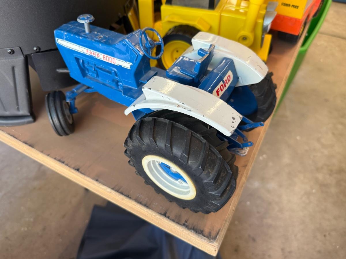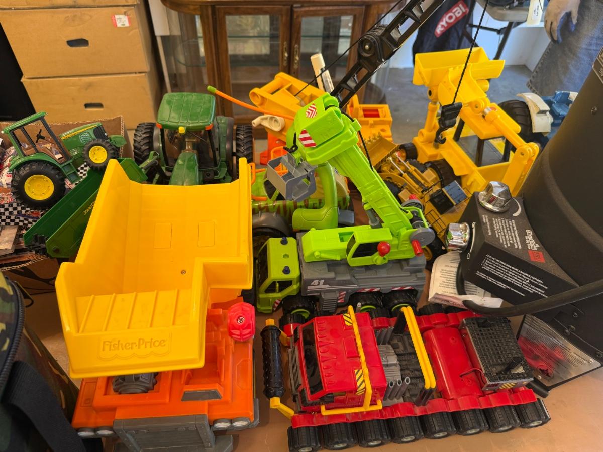 Lots of plastic Toy Tractors & Cranes as shown some John Deere, Fisher Price, Ford 8000 Metal tractor and many others, some make sounds & includes large green lidded tub