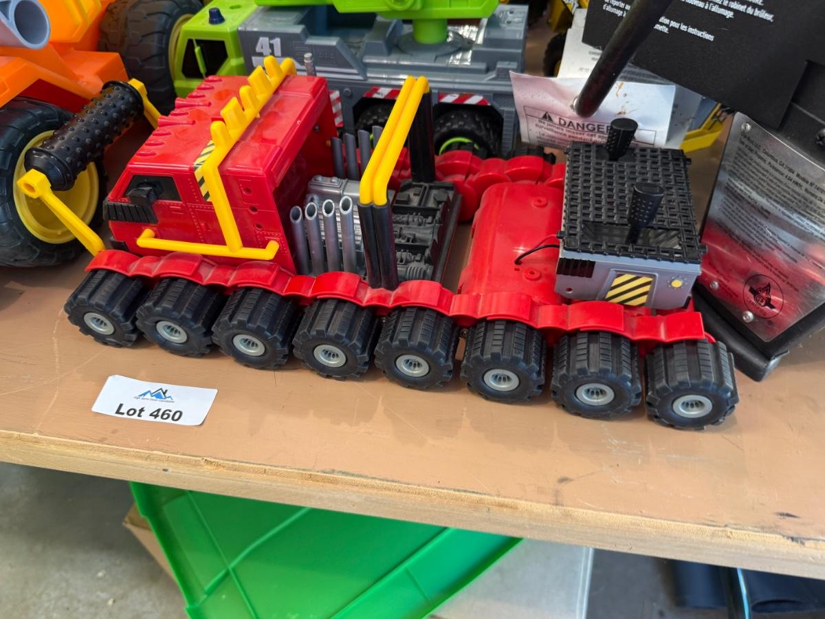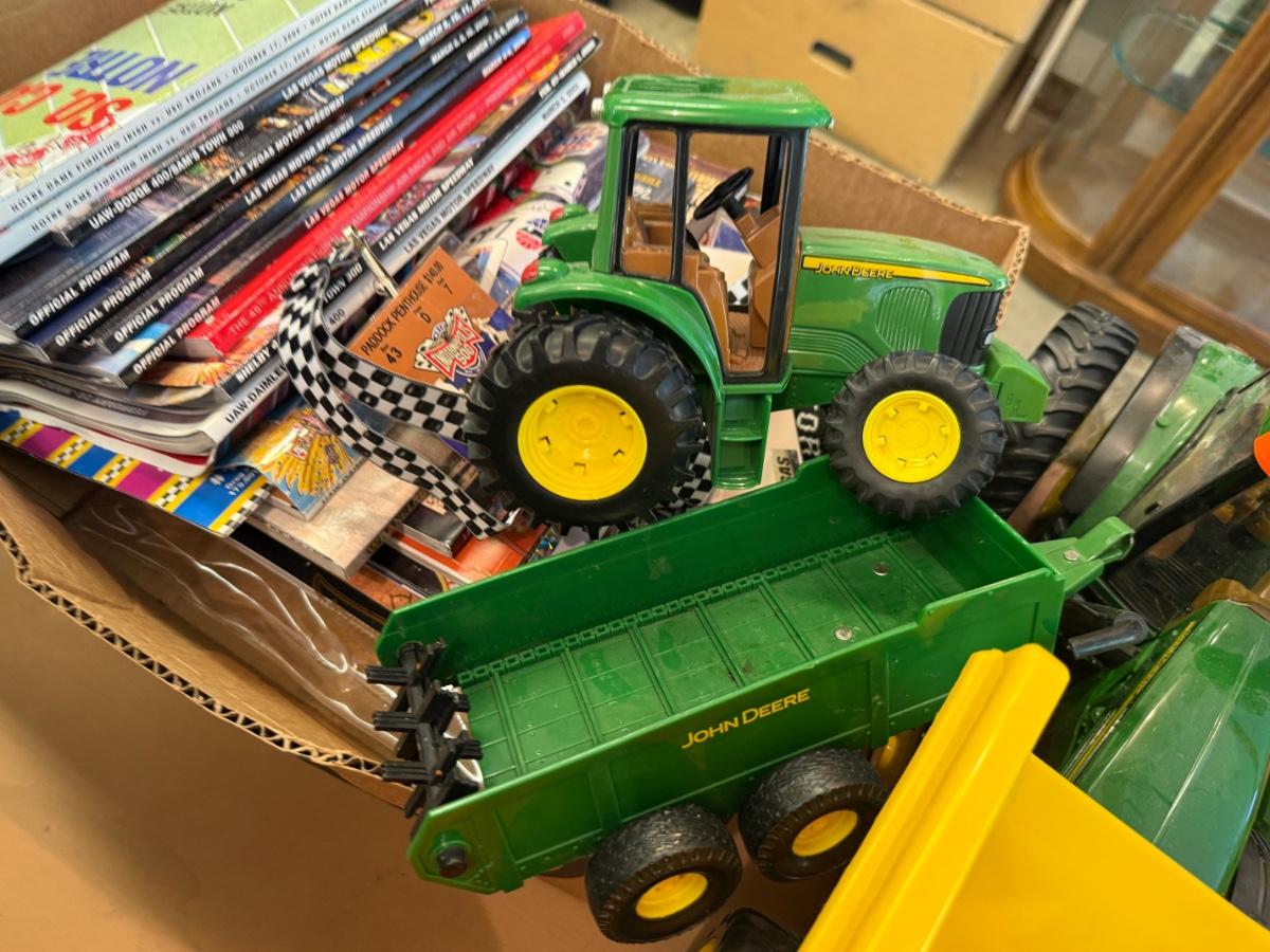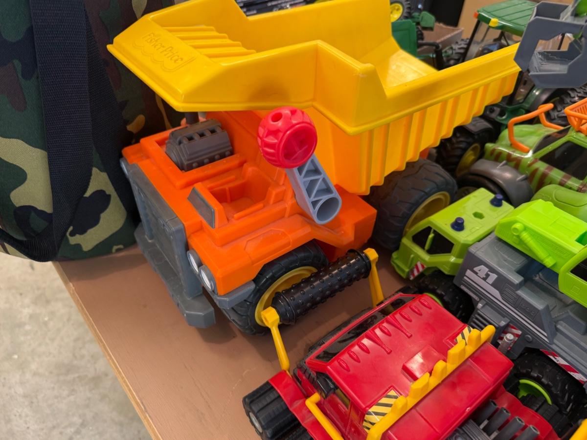 Lots of plastic Toy Tractors & Cranes as shown some John Deere, Fisher Price, Ford 8000 Metal tractor and many others, some make sounds & includes large green lidded tub