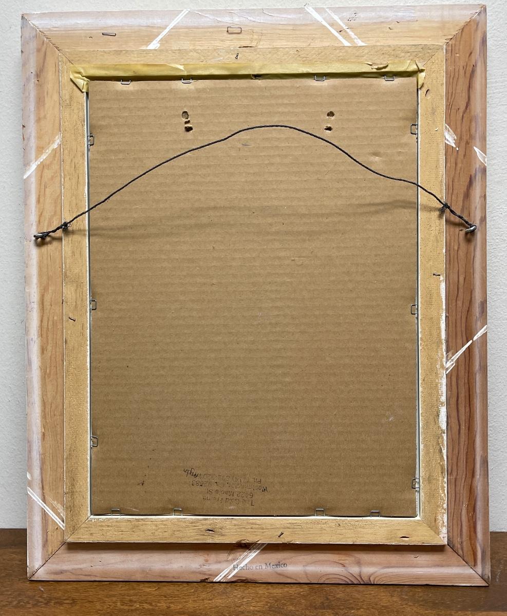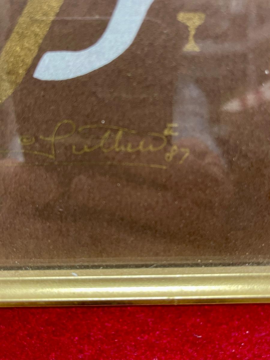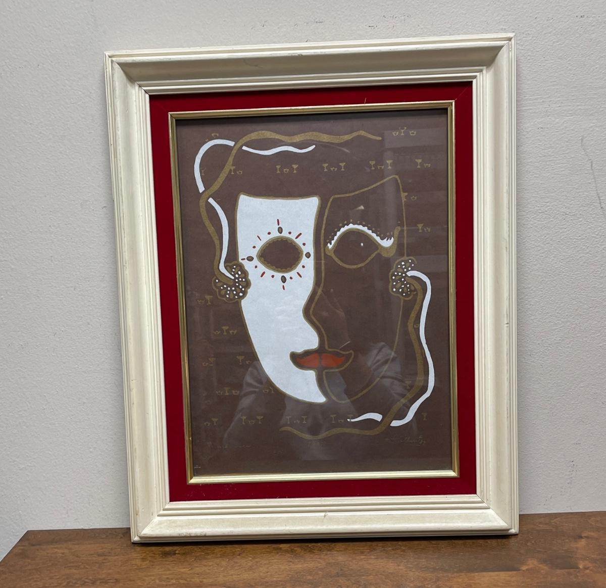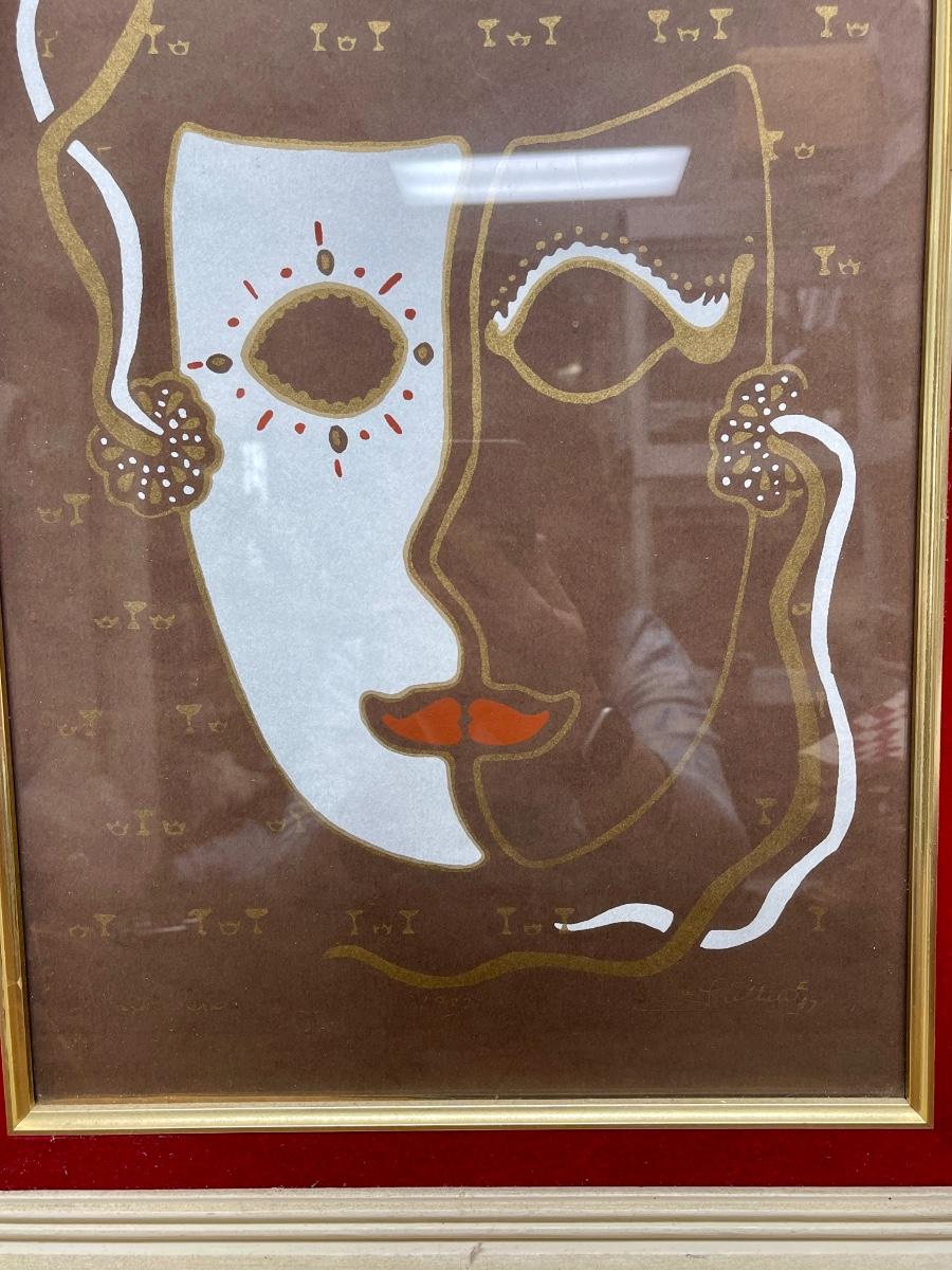 Abstract image of a masquerade mask on a dark background with a repeating pattern of gold crowns and wine glasses. Signed "Luthile 87" Good condition, framed size approx. 17" x 21".