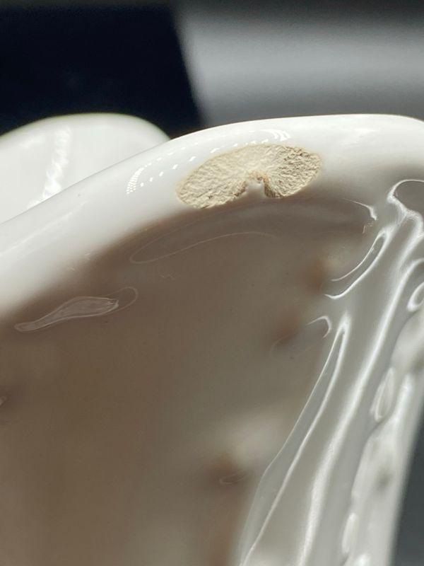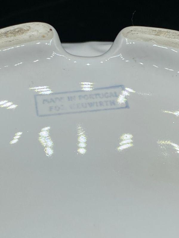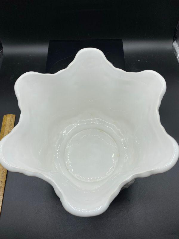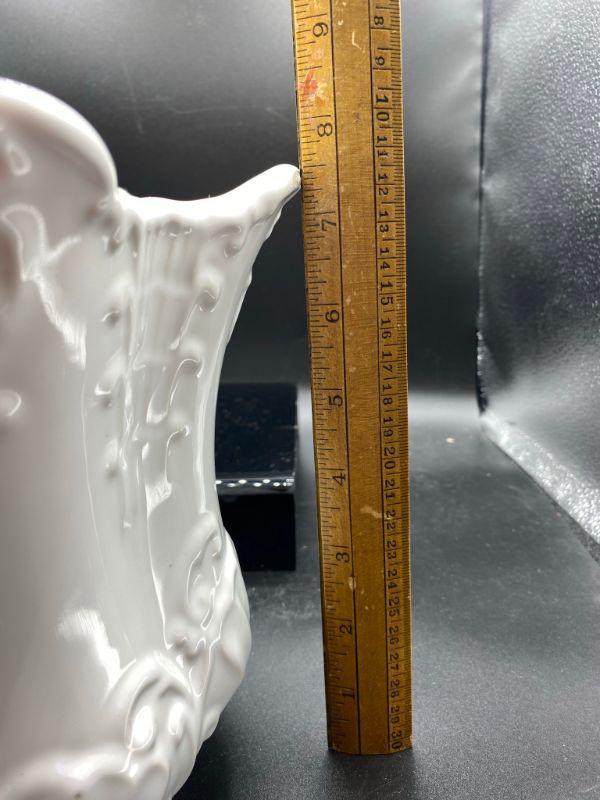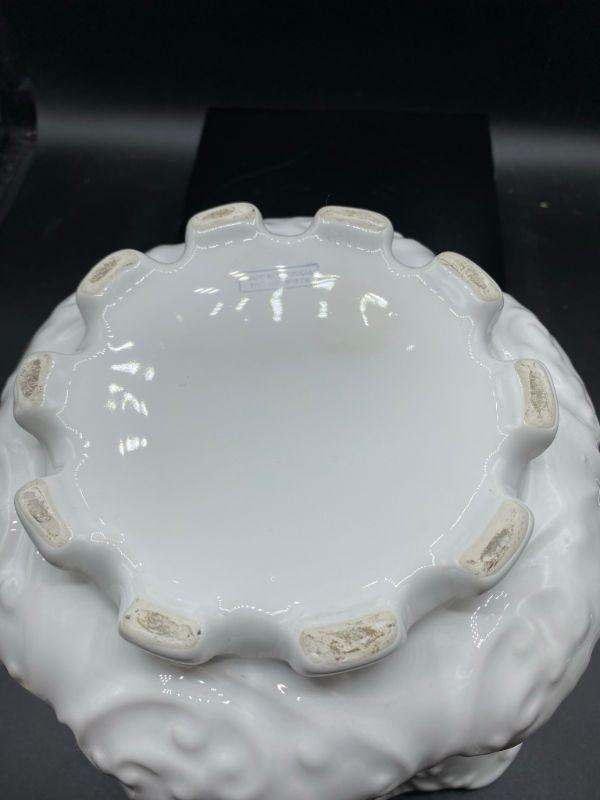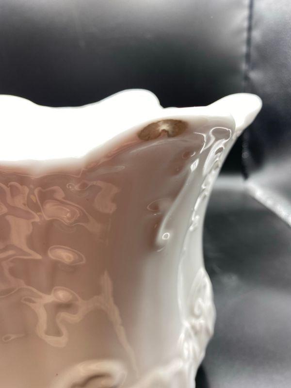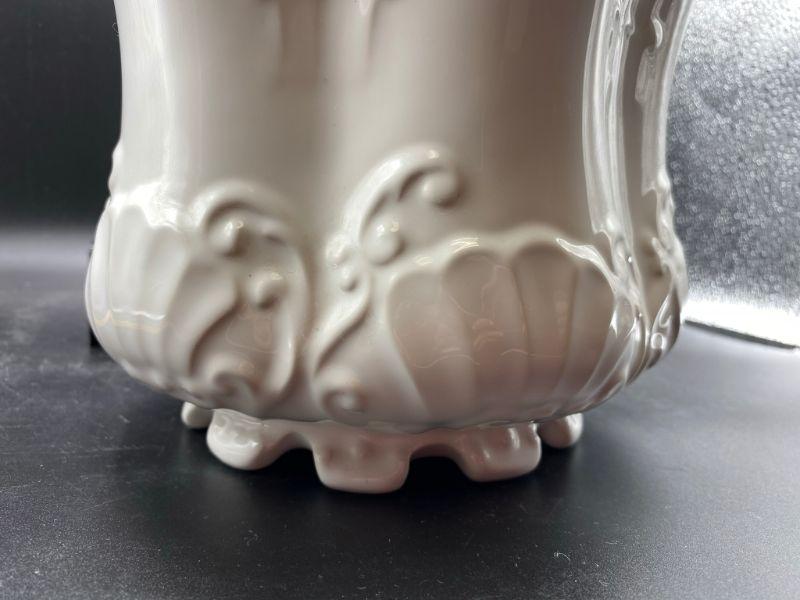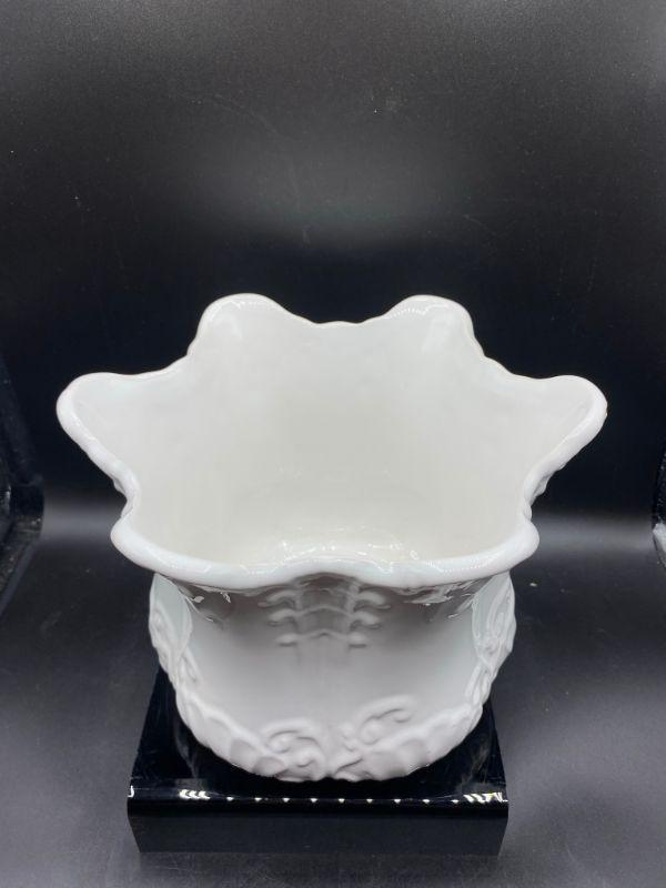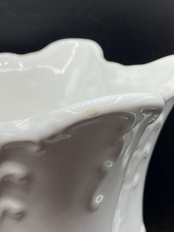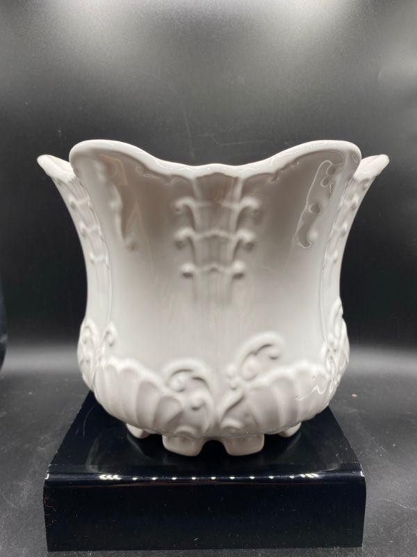 White tulip shaped planter pot. Made in Portugal for Neuwirth. Has decorative scrolls and scallops embossed around the outside. Minor chip in the edge. Displays lovely. About 7.5" tall.