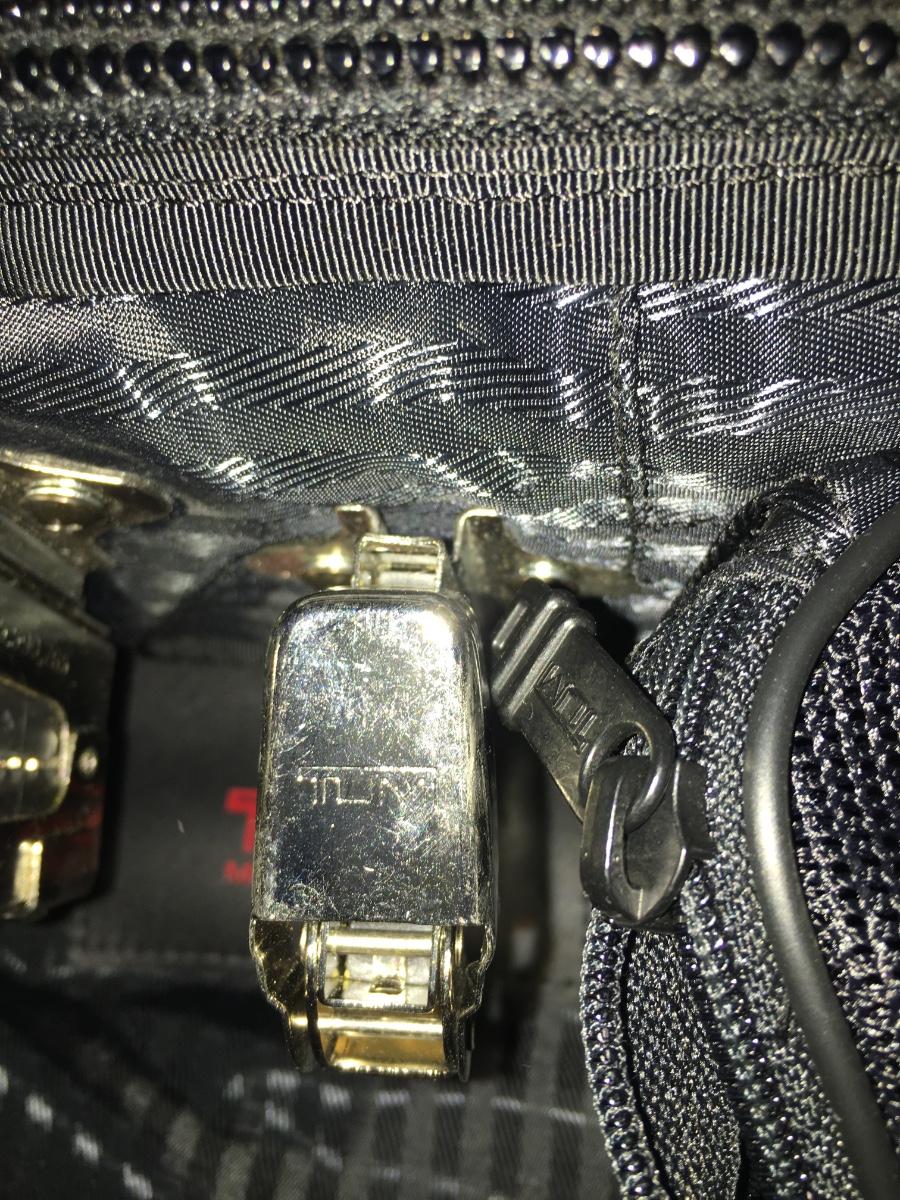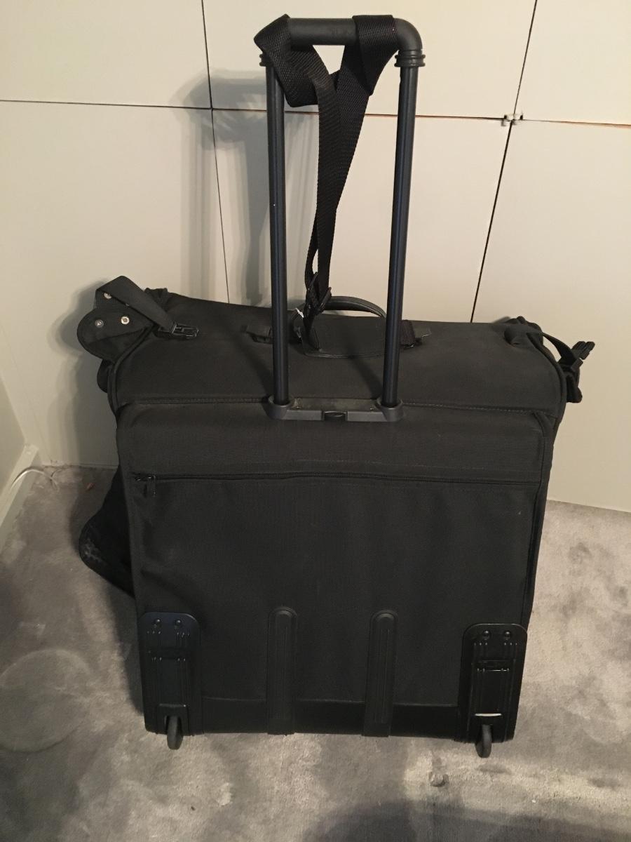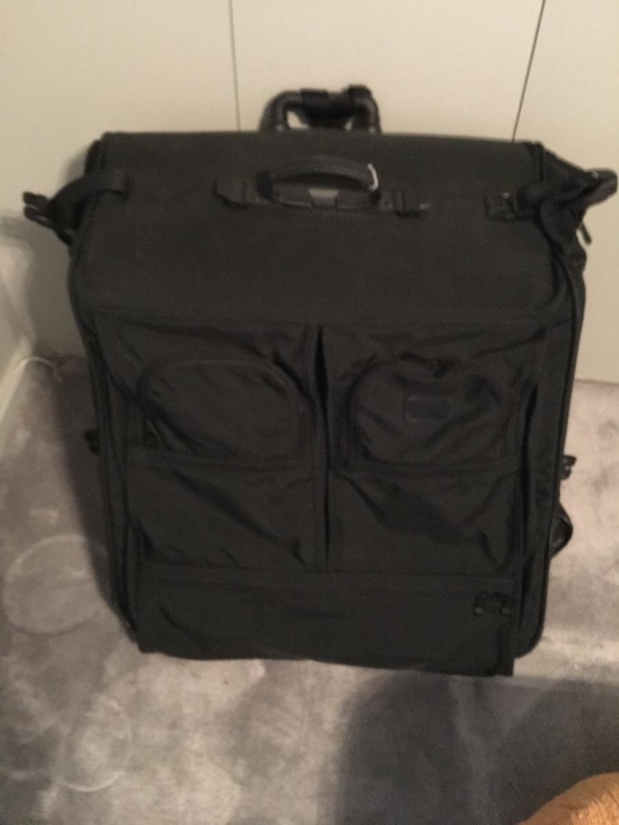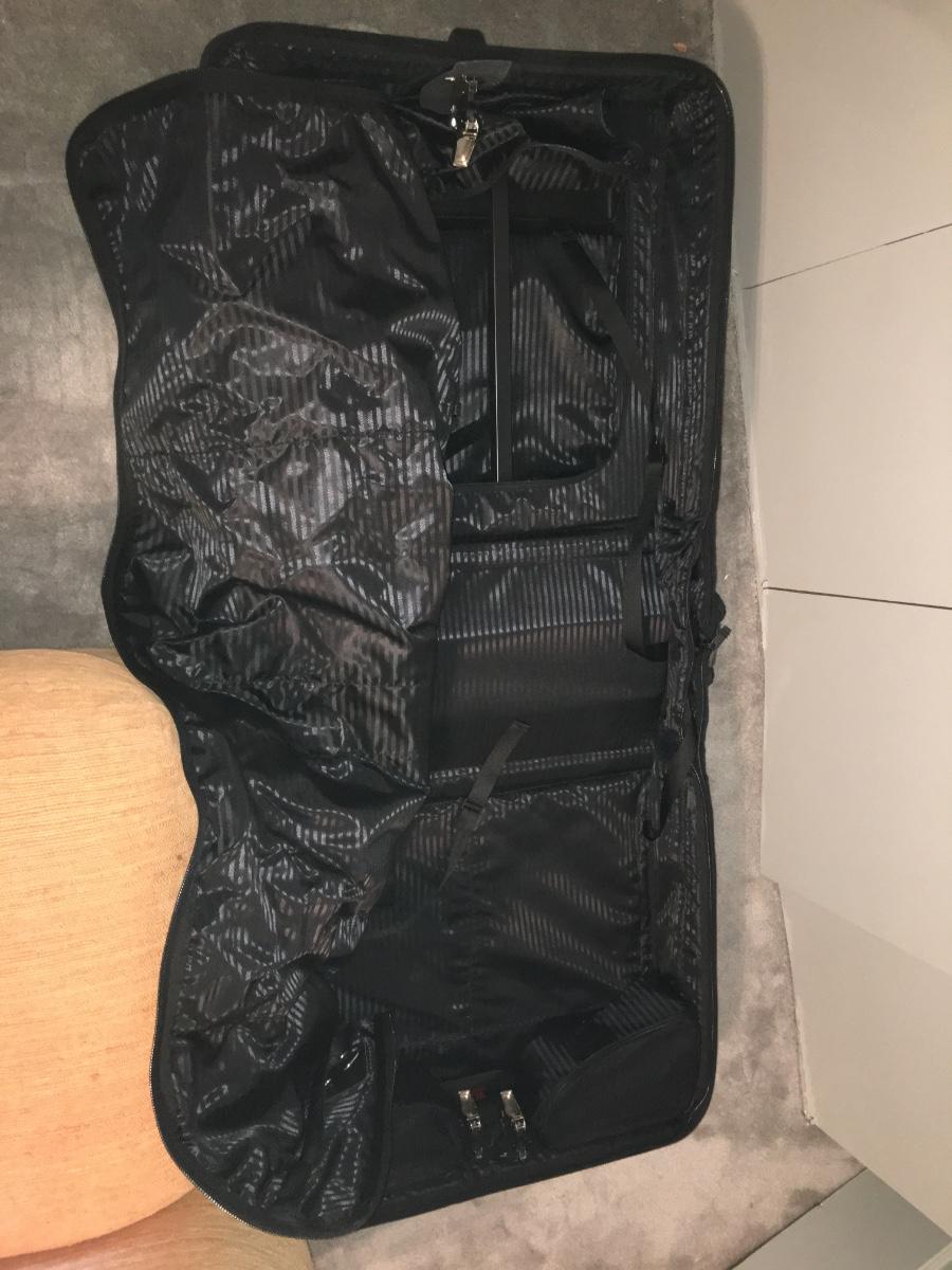 Extra large nylon Tumi garment bag, 2 wheeled and collapsible handle. Snaps close on the sides.. So many pockets. Working ziippers. Can pack everything and the kitchen sink.