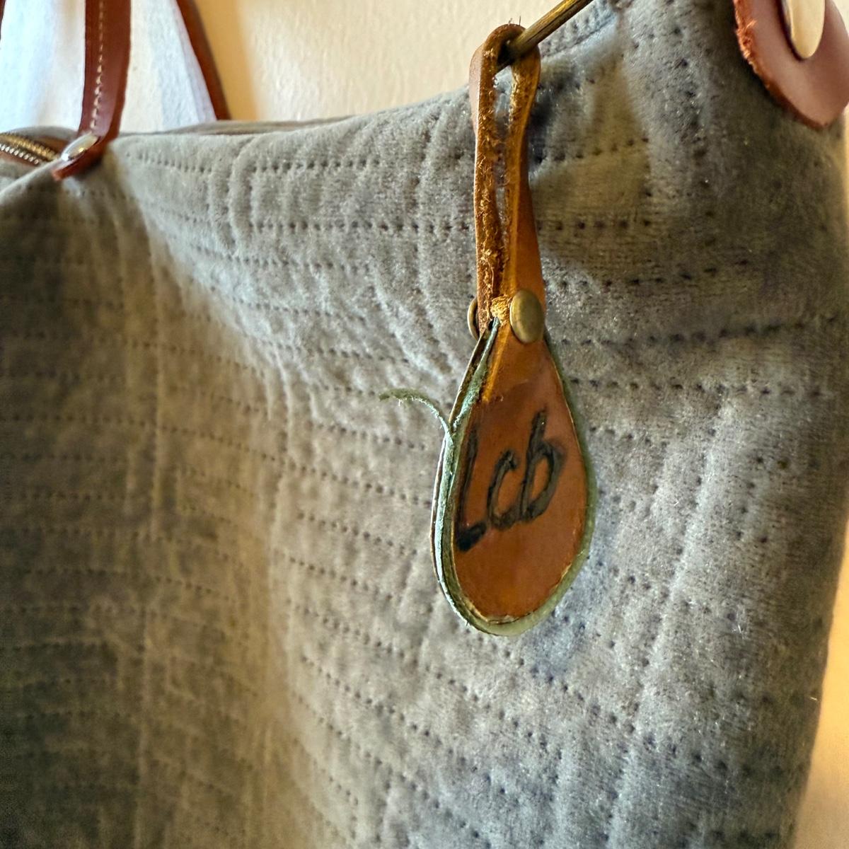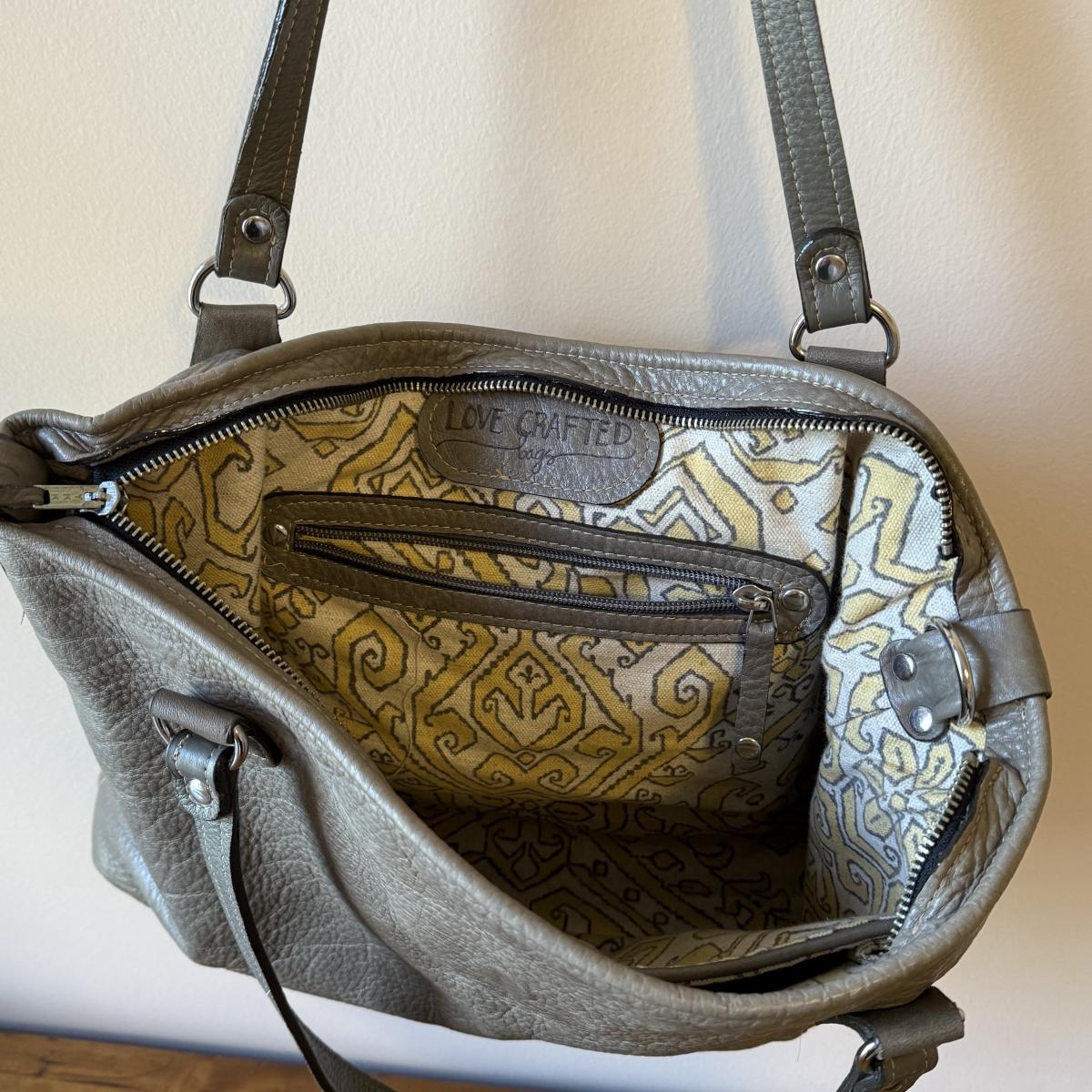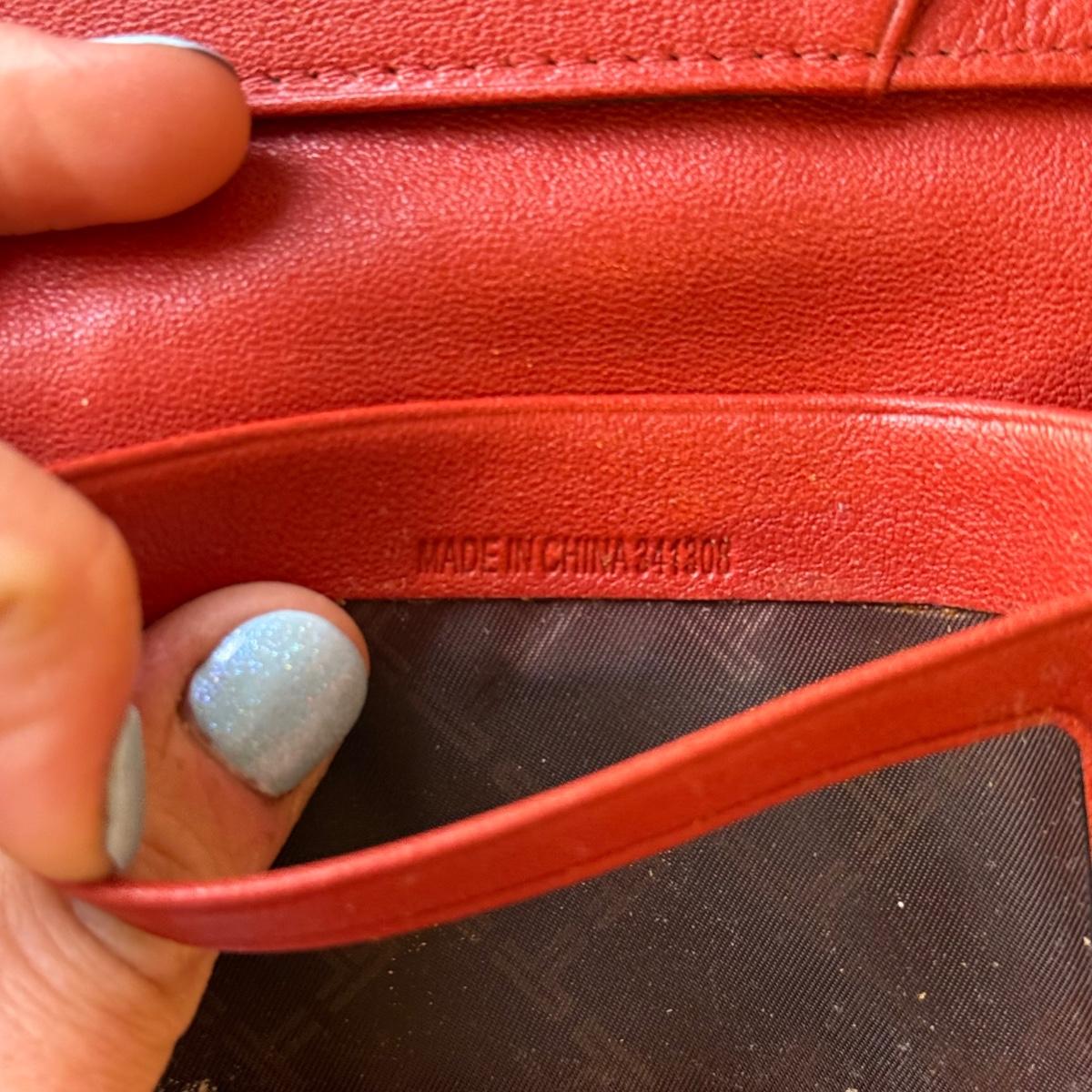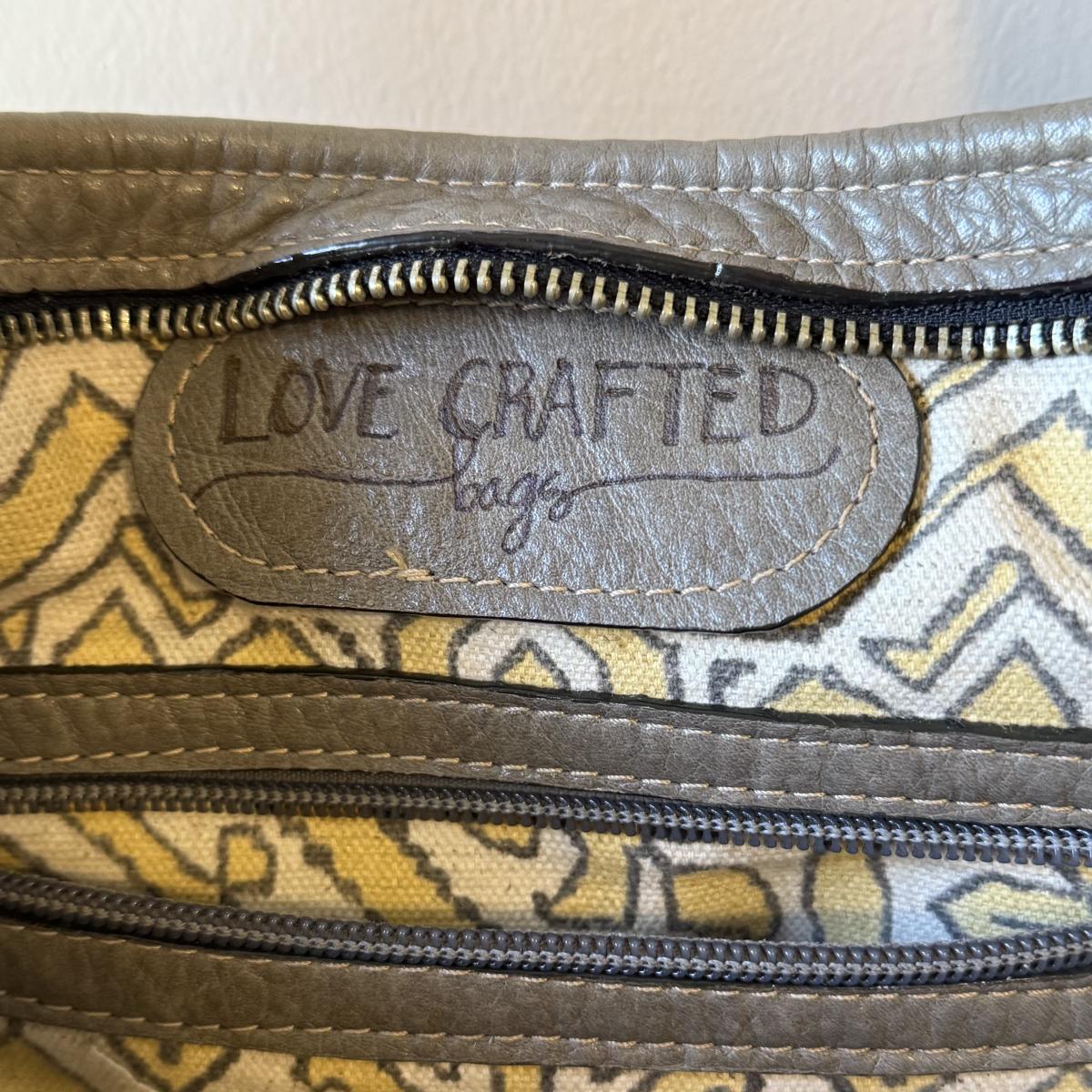 Four items total in this lot, including two wallets and two handbags. Both wallets and the Love Crafted handbag are leather or leather-like, and the larger unmarked bag is a very soft velvet fabric. The velvet bag is 18” x 14”. It has a zipper and short leather straps. The Love Crafted bag has a gorgeous gemstone accent on its magnetic clasp. The GA brand wallet comes in what appears to be its original box and it appears to be unused. The Tumi wallet has what looks like glue deteriorating around the front card window, see photos.