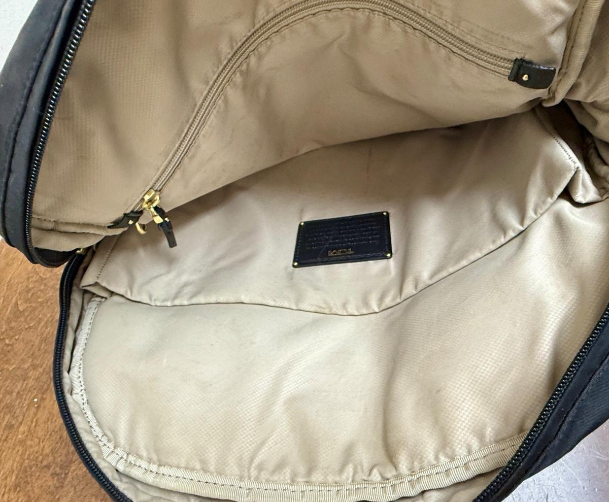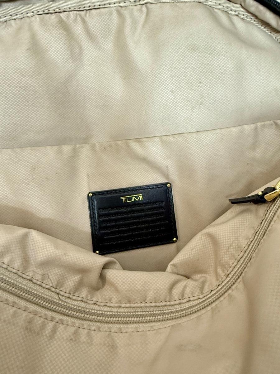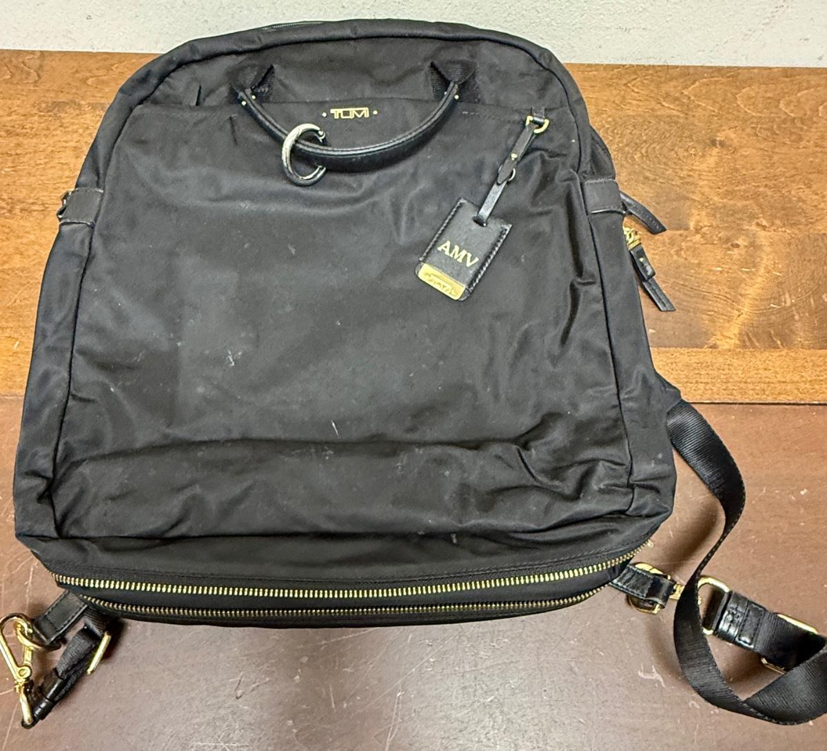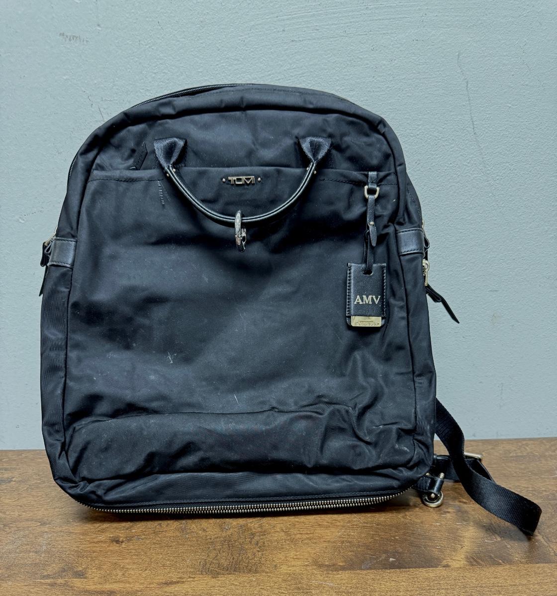 Has backpack straps that can be tucked away, 2 luggage handles at the top. Designed to hold a 15" laptop and accessories. Some scuff marks on the outside, but in overall good used condition. Approx. 15" x 15".