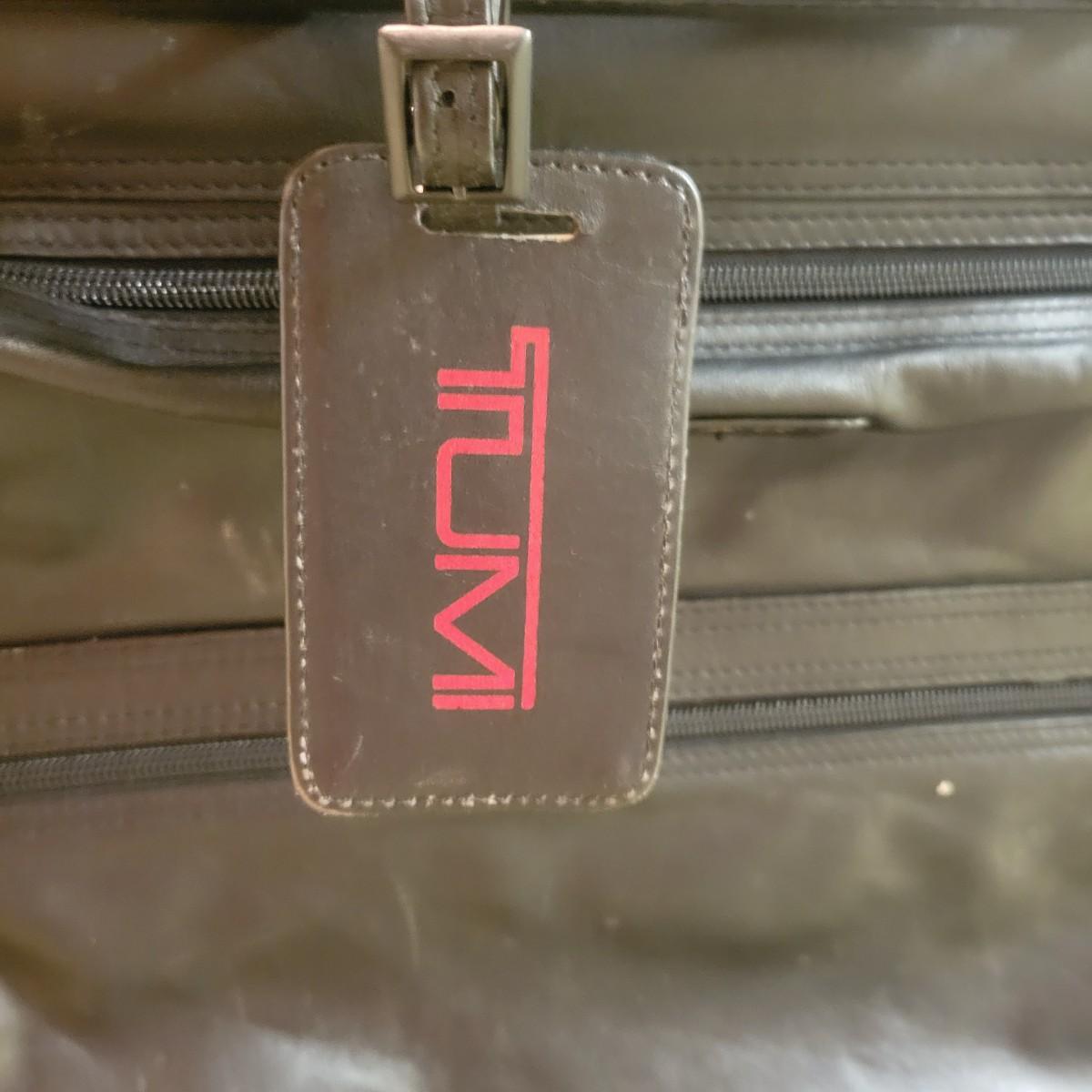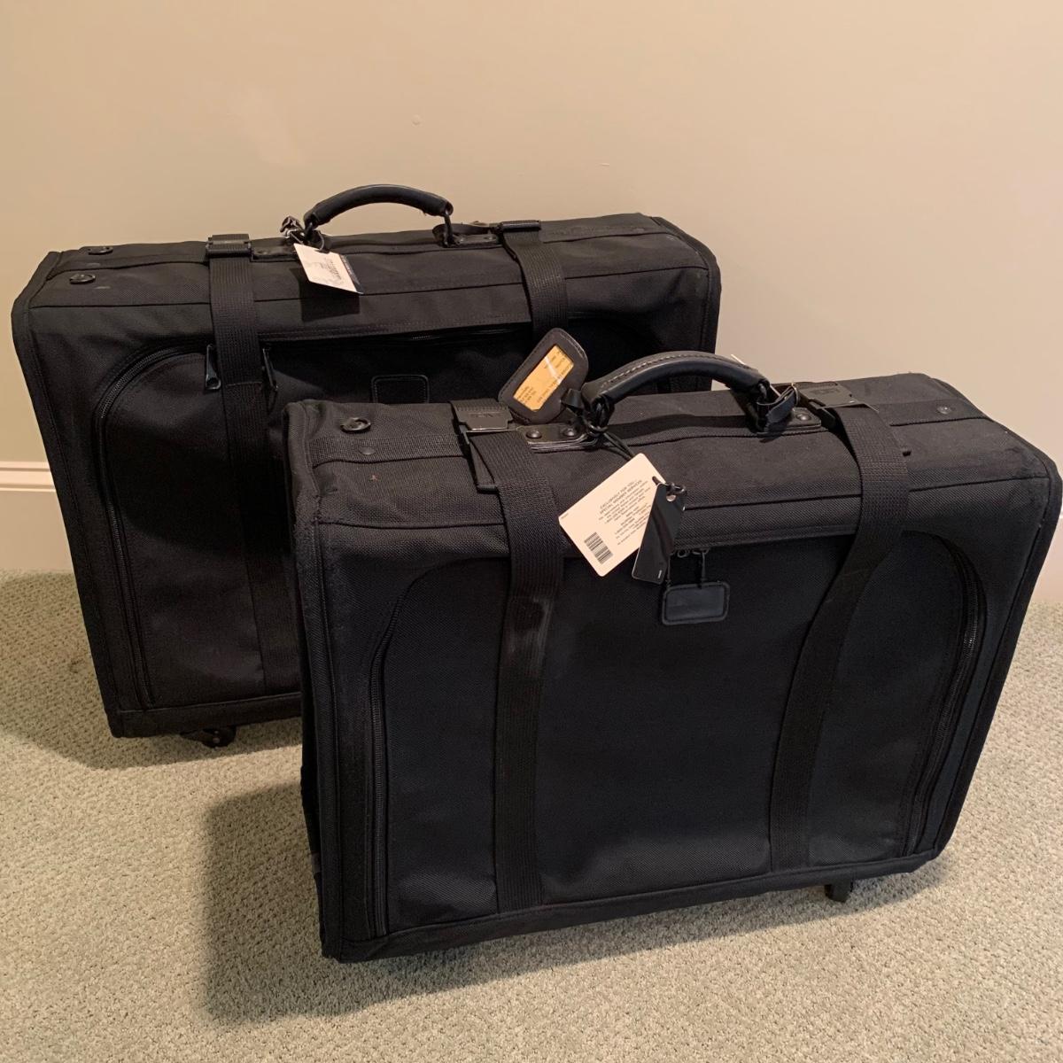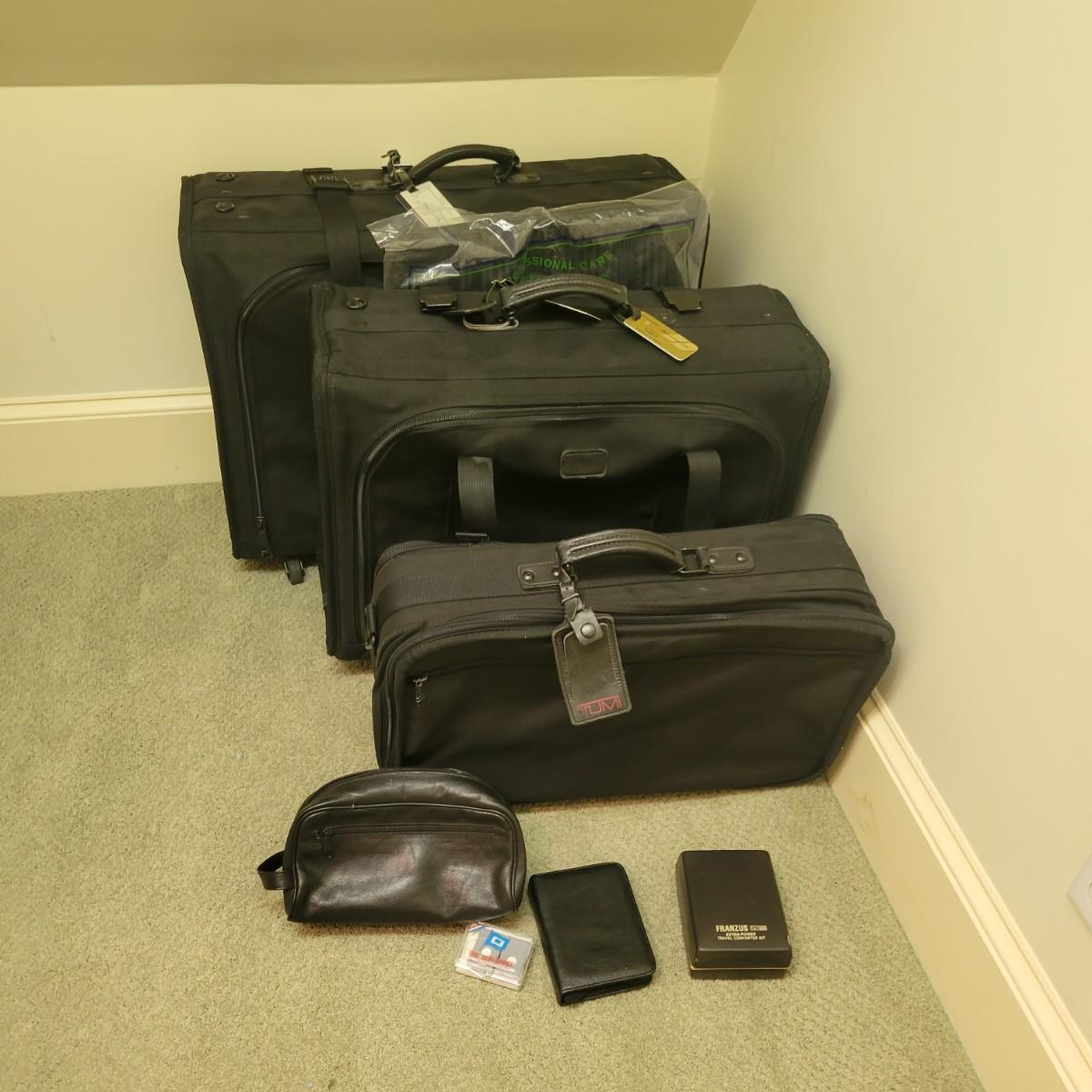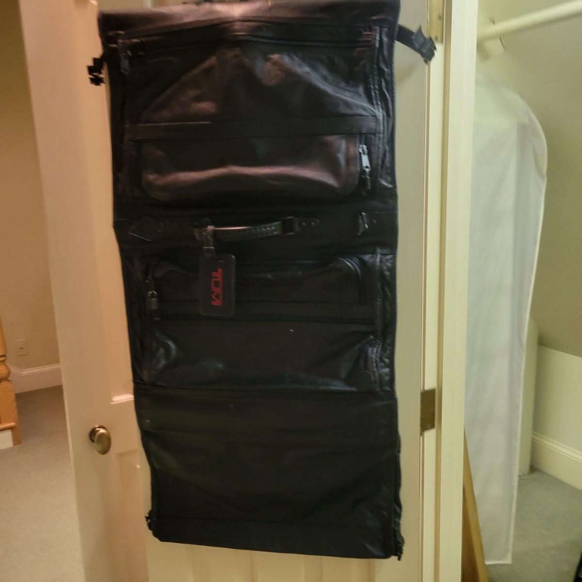 Set of wheeled TUMI garment bags. Lot includes two wheeled garment luggage bags with hanging sweater bag. Largest piece measures, 27” x 10” x 21”H. Also included is a Tumi leather garment bag and a Tumi fabric suitcase. A Franzus travel inverter kit, a leather dop kit and a leather week pill case. Please see photos for more details. Local pickup only.