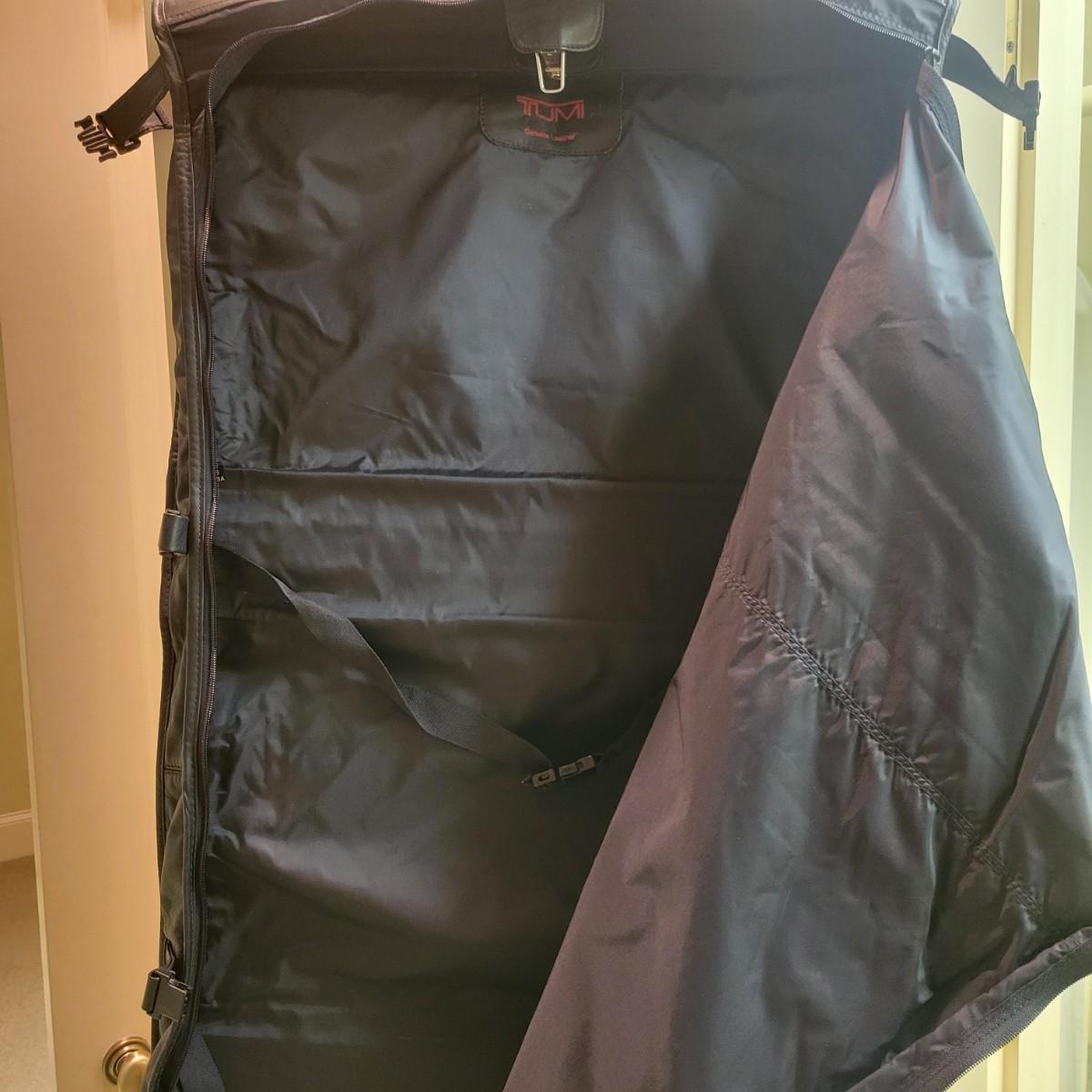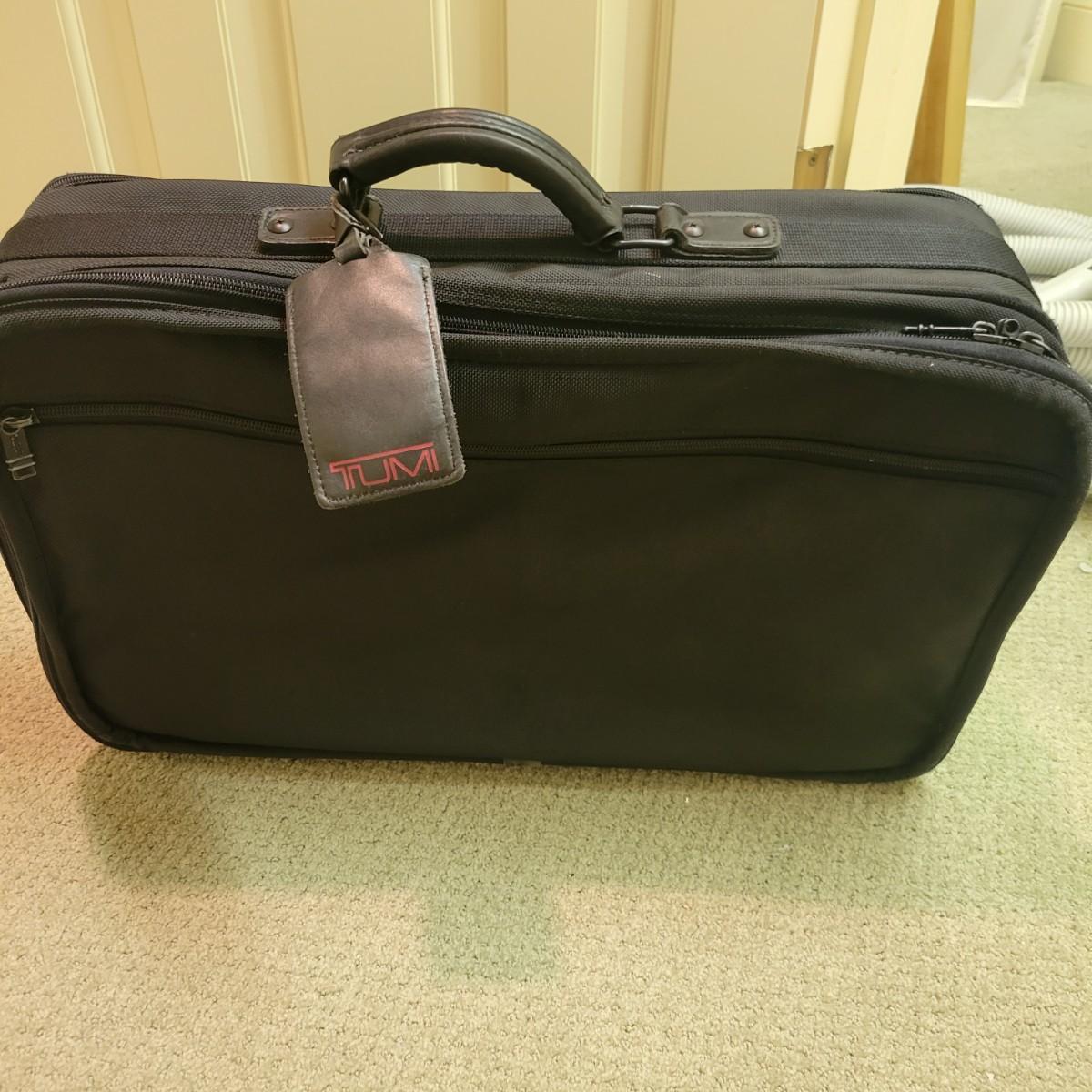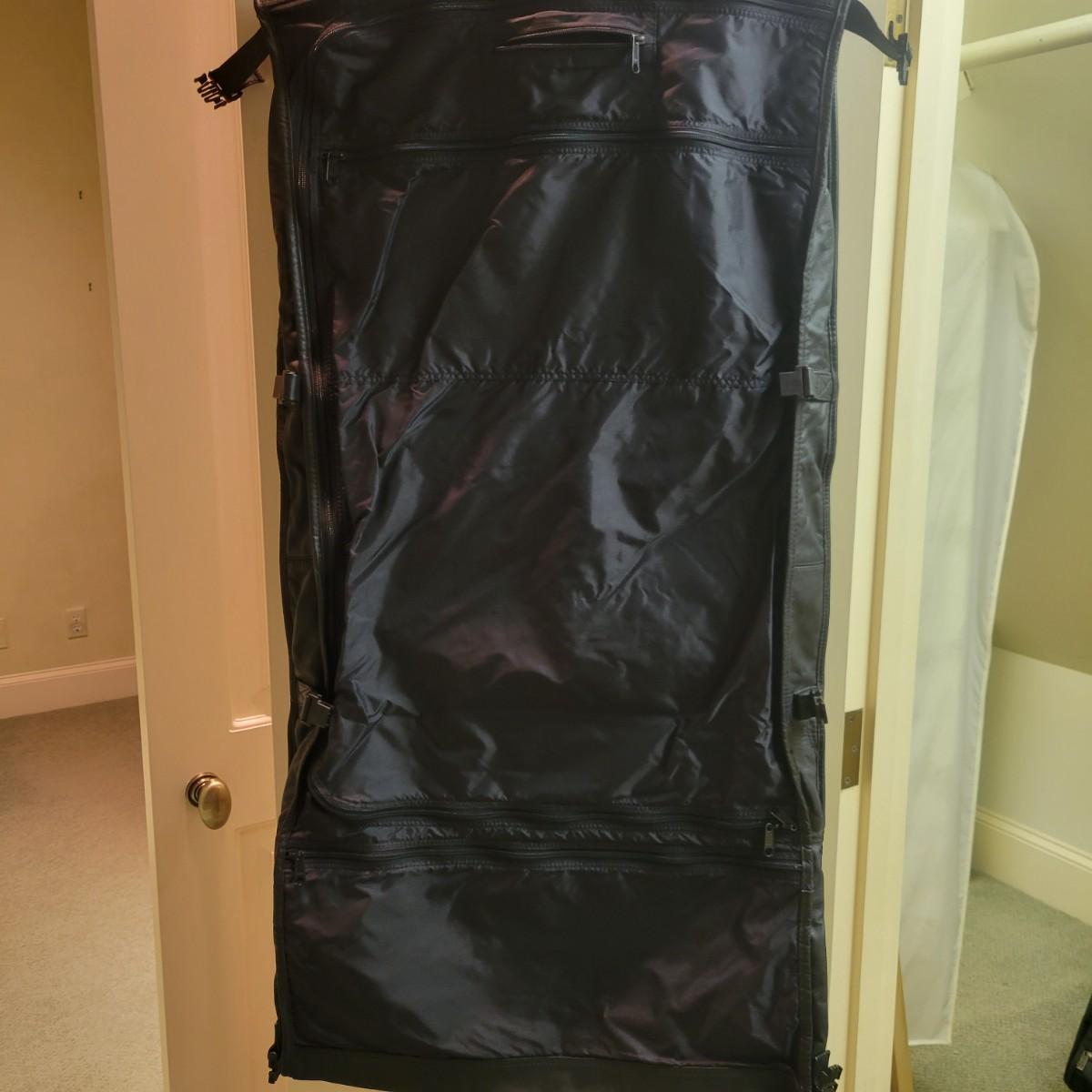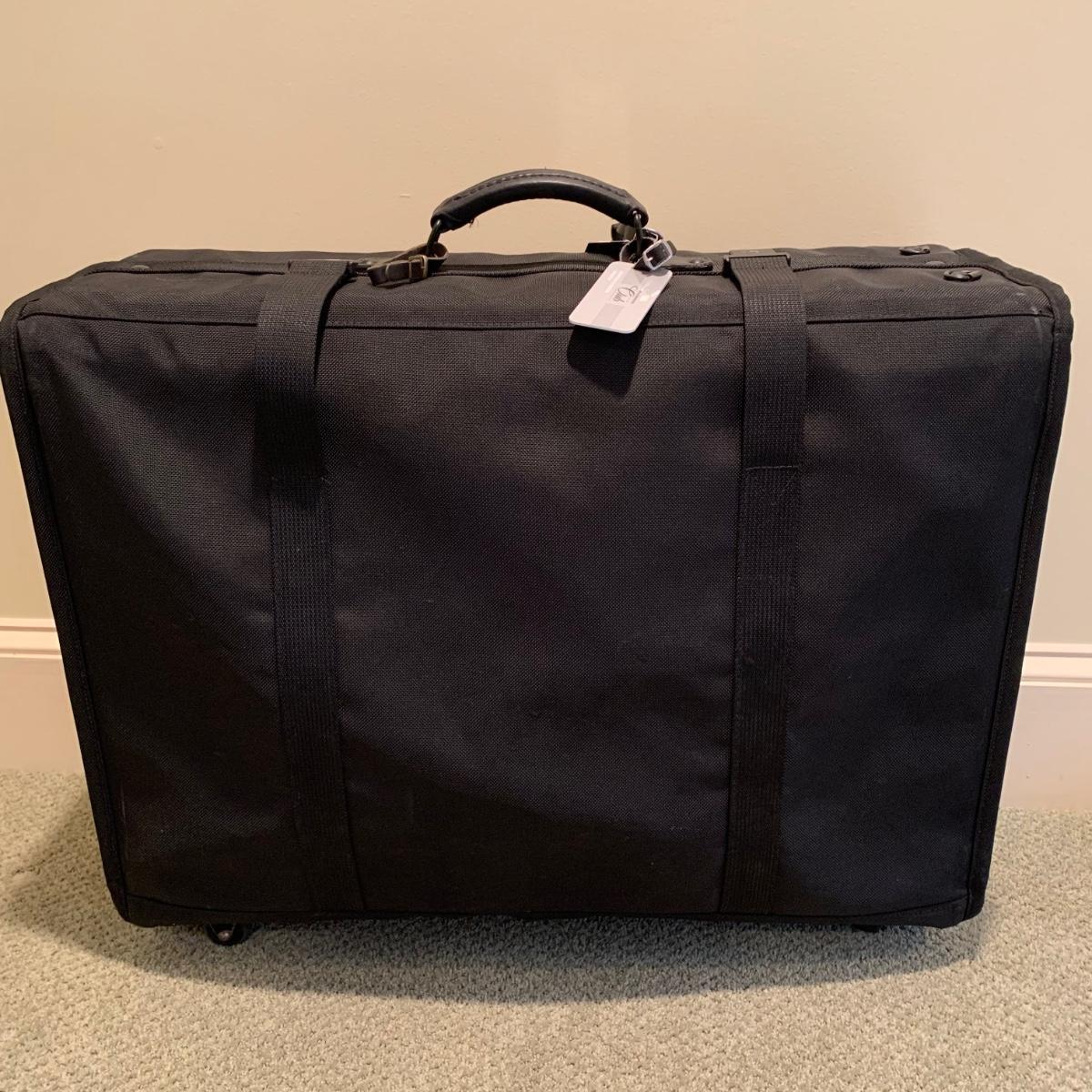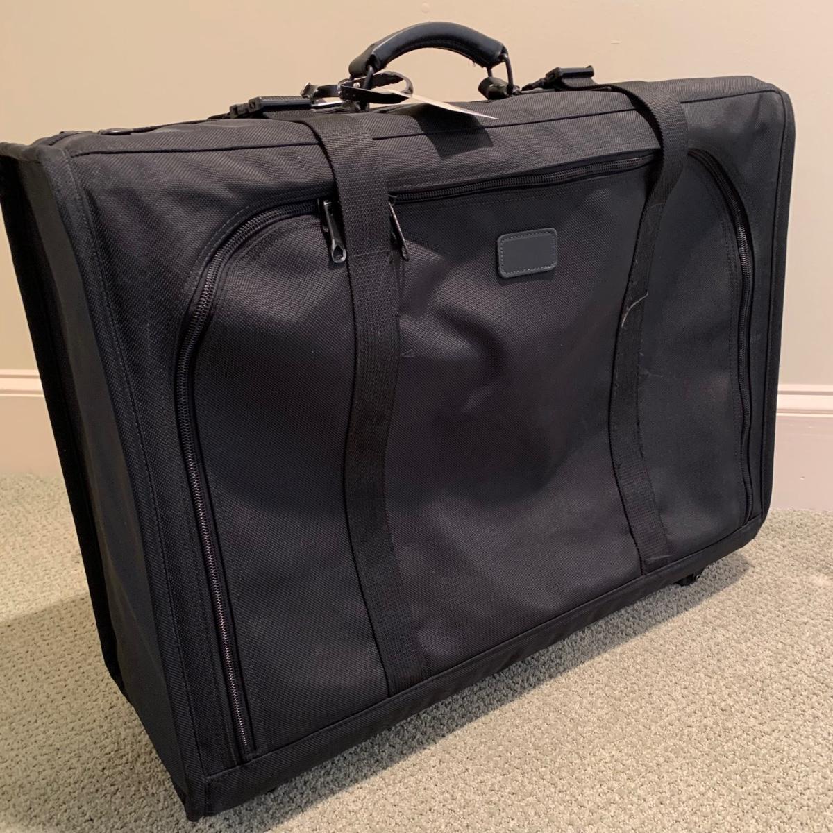 Set of wheeled TUMI garment bags. Lot includes two wheeled garment luggage bags with hanging sweater bag. Largest piece measures, 27” x 10” x 21”H. Also included is a Tumi leather garment bag and a Tumi fabric suitcase. A Franzus travel inverter kit, a leather dop kit and a leather week pill case. Please see photos for more details. Local pickup only.