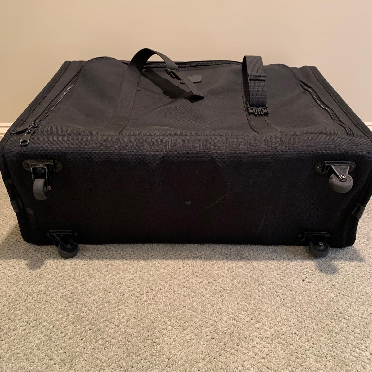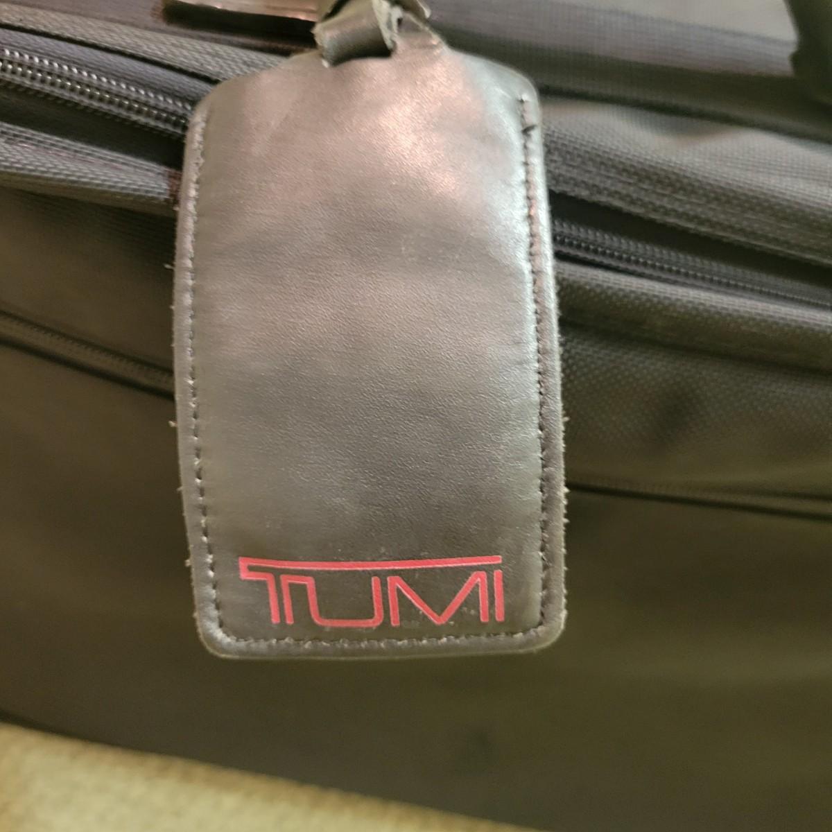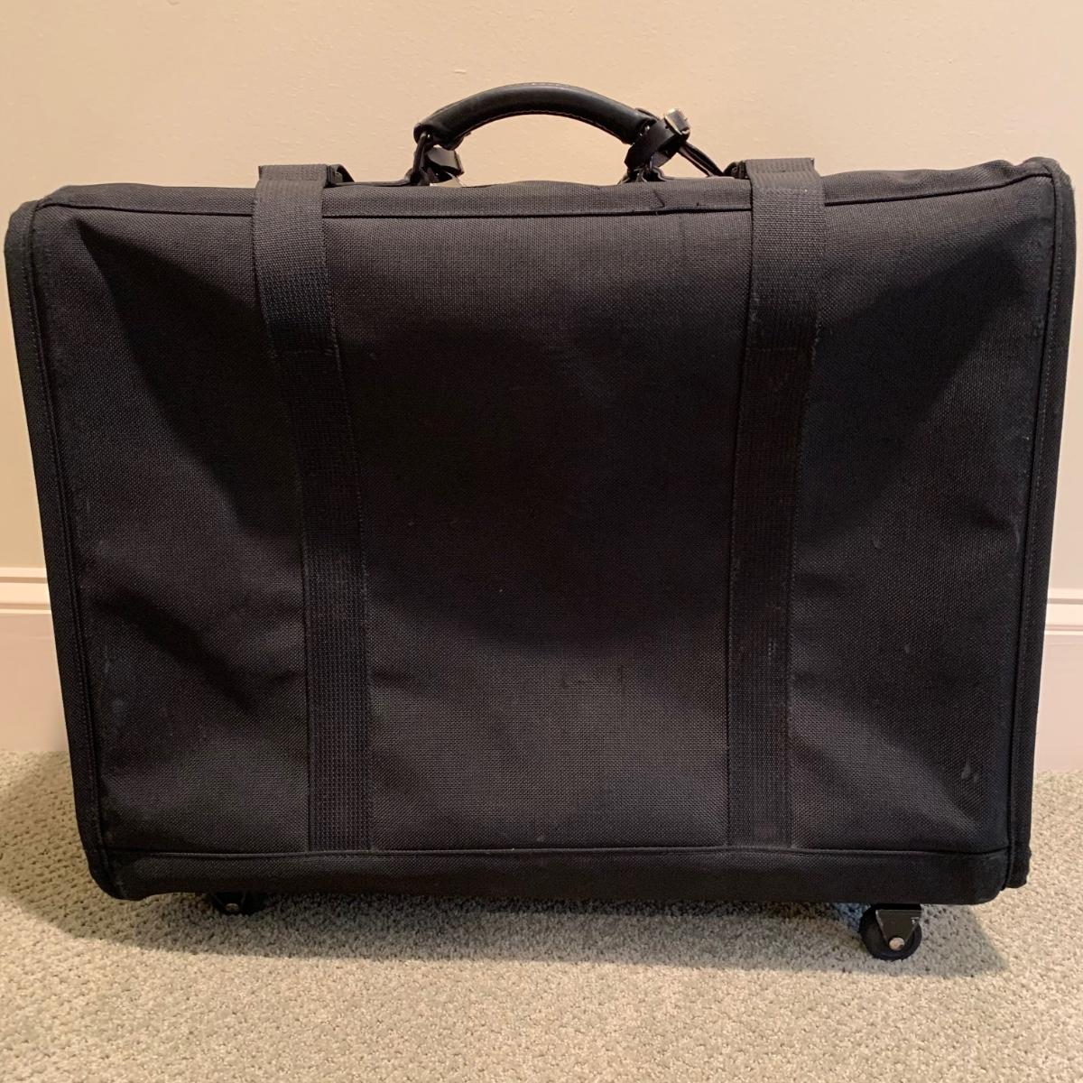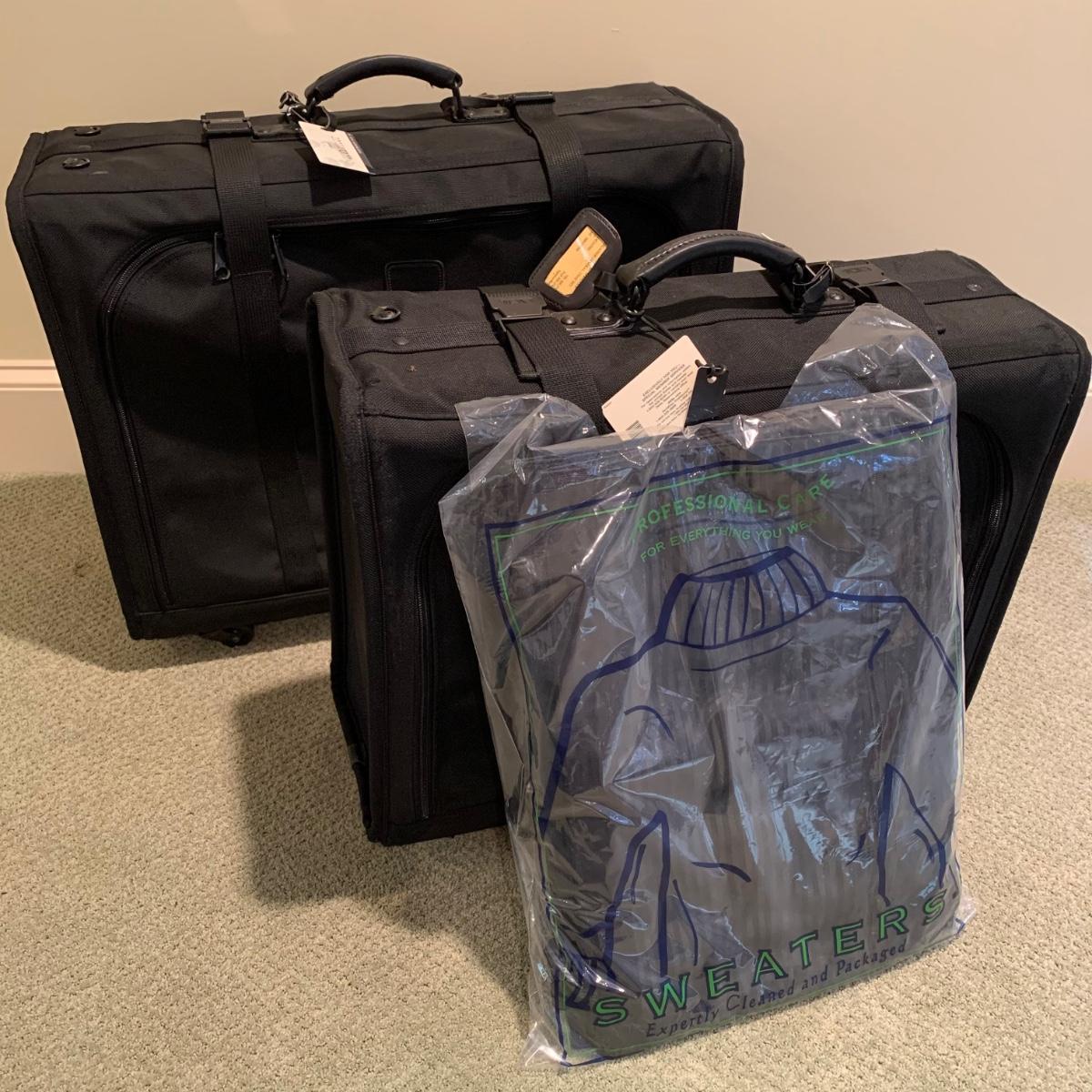 Set of wheeled TUMI garment bags. Lot includes two wheeled garment luggage bags with hanging sweater bag. Largest piece measures, 27” x 10” x 21”H. Also included is a Tumi leather garment bag and a Tumi fabric suitcase. A Franzus travel inverter kit, a leather dop kit and a leather week pill case. Please see photos for more details. Local pickup only.