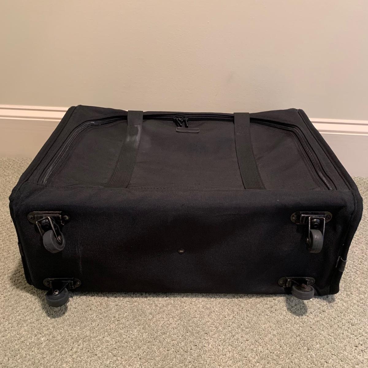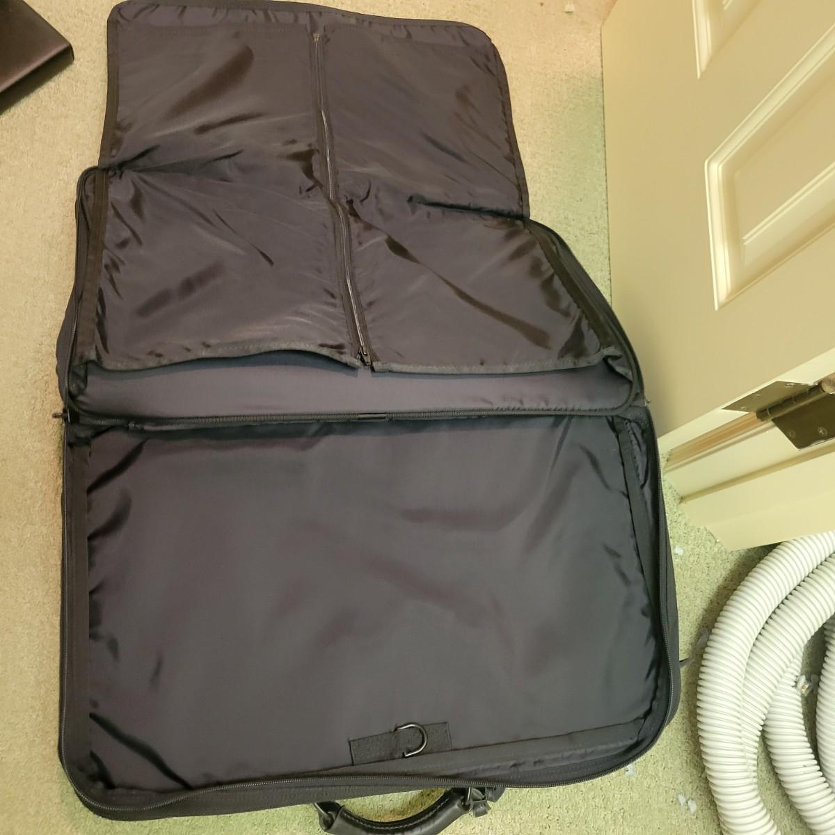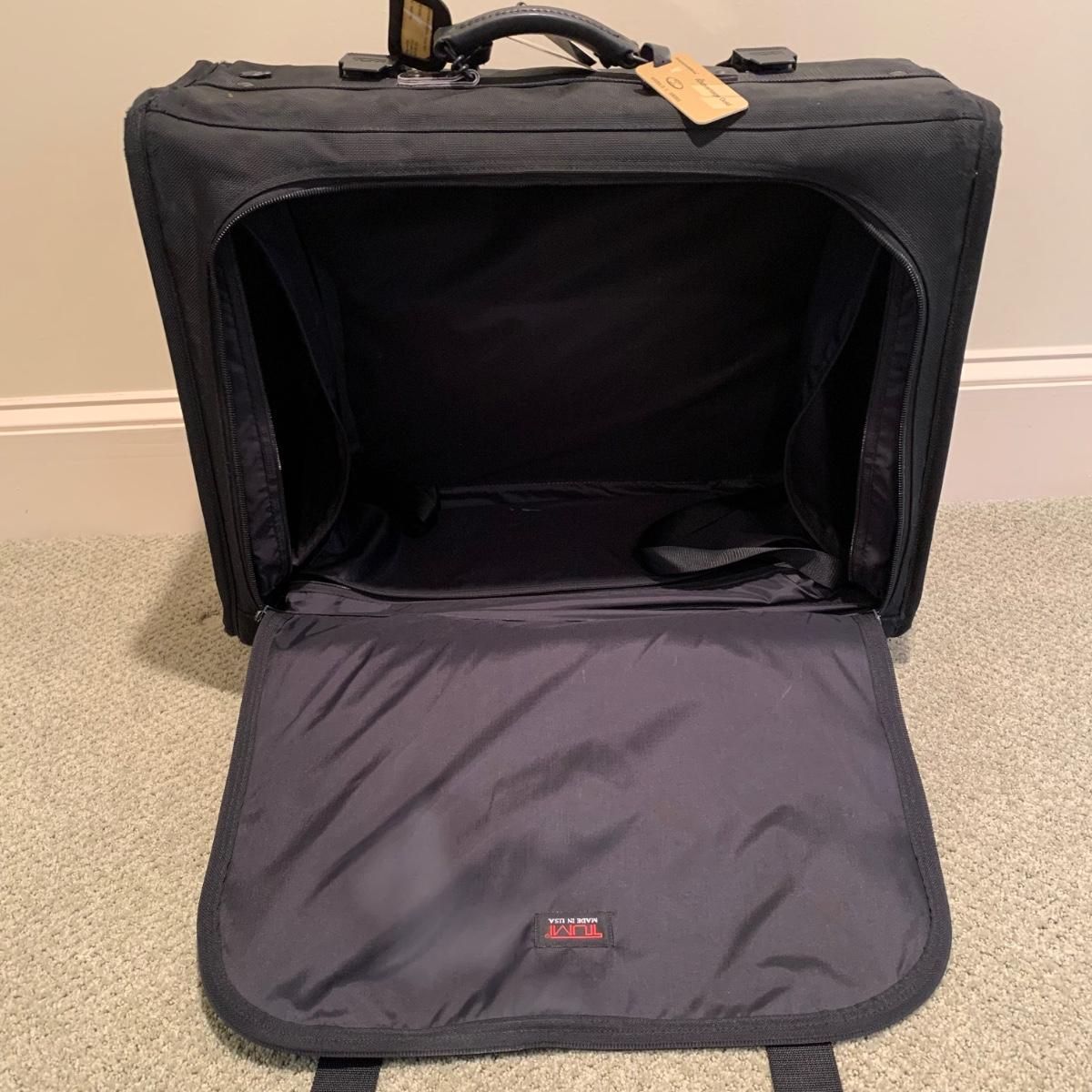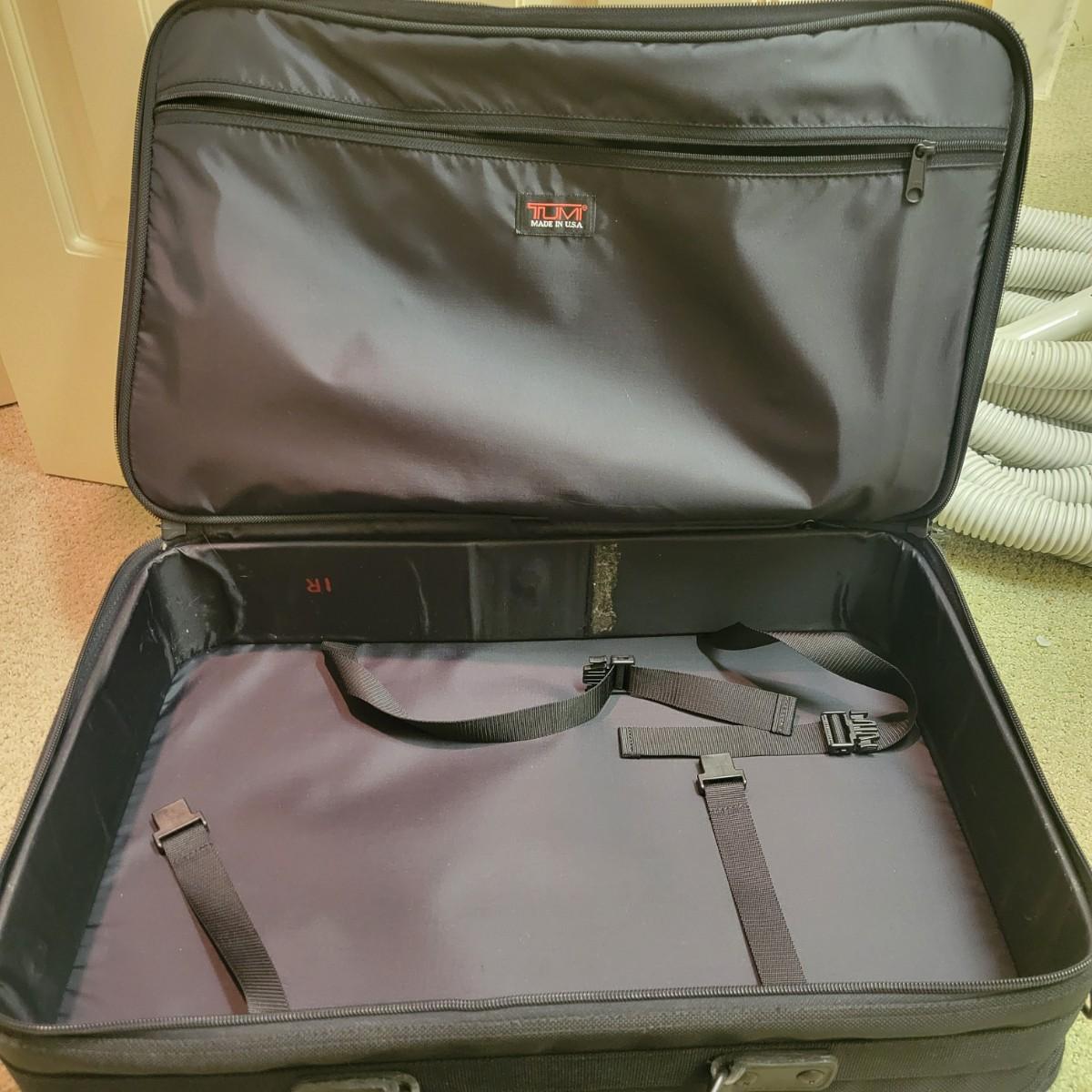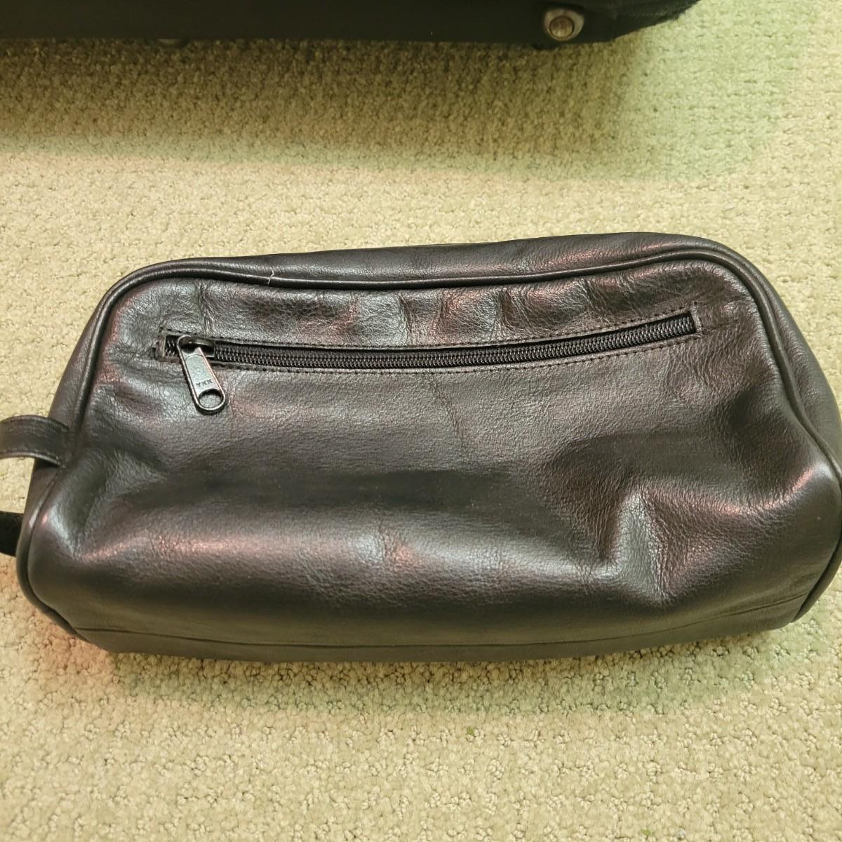 Set of wheeled TUMI garment bags. Lot includes two wheeled garment luggage bags with hanging sweater bag. Largest piece measures, 27” x 10” x 21”H. Also included is a Tumi leather garment bag and a Tumi fabric suitcase. A Franzus travel inverter kit, a leather dop kit and a leather week pill case. Please see photos for more details. Local pickup only.