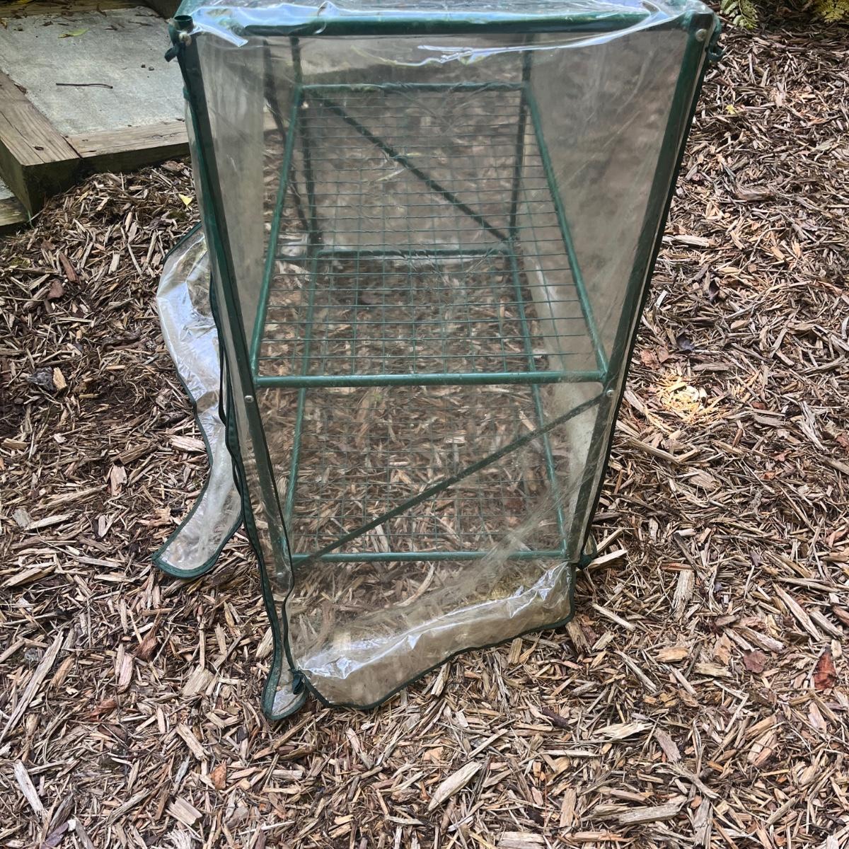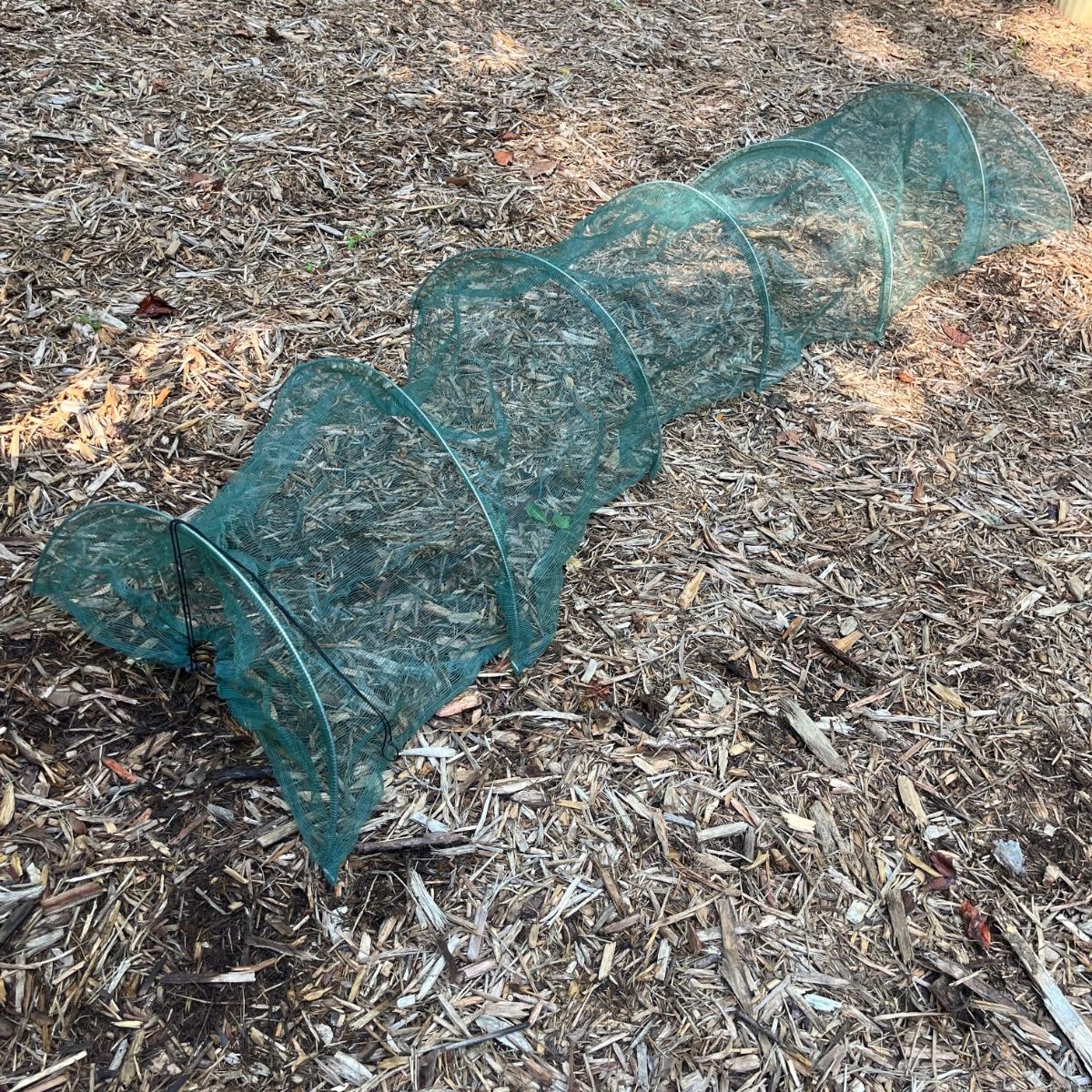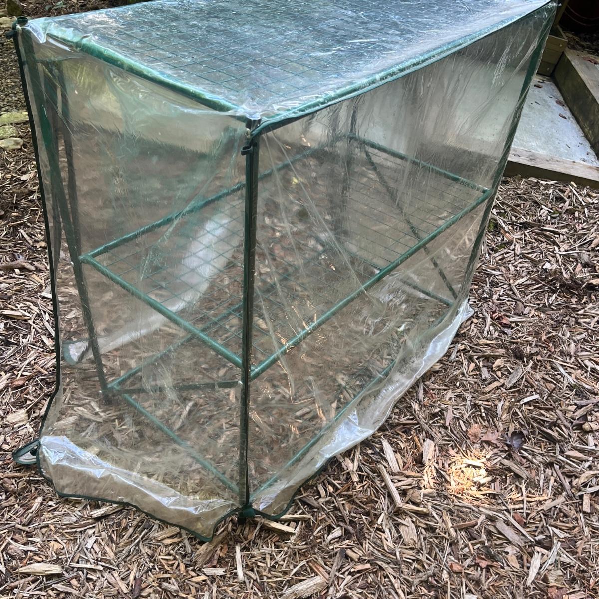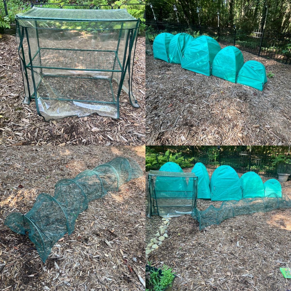 Lot includes a Tunnel shadow net that measures 106” x 24” x 13”H, Nuvue Winter shrub covers with largest measuring 36” x 36” x 42”H and a metal framed mini greenhouse that measures 39” x 20” x 36”H. Two shrub covers have small tears, see pictures.