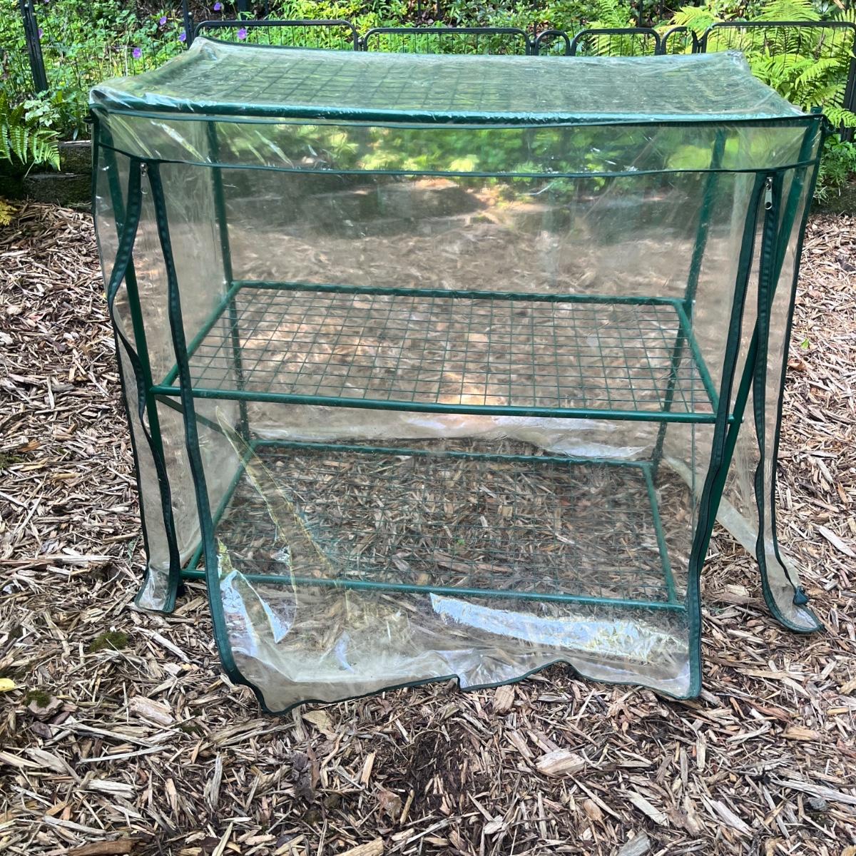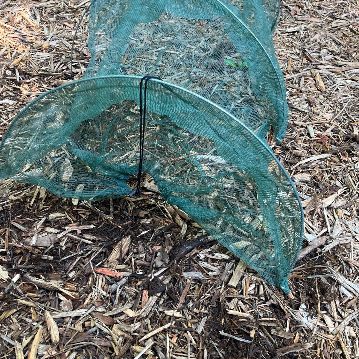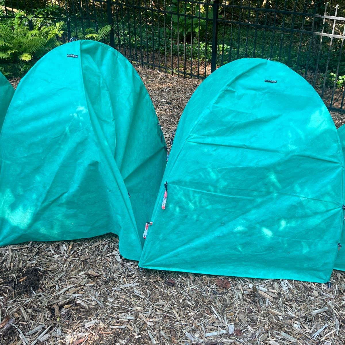 Lot includes a Tunnel shadow net that measures 106” x 24” x 13”H, Nuvue Winter shrub covers with largest measuring 36” x 36” x 42”H and a metal framed mini greenhouse that measures 39” x 20” x 36”H. Two shrub covers have small tears, see pictures.