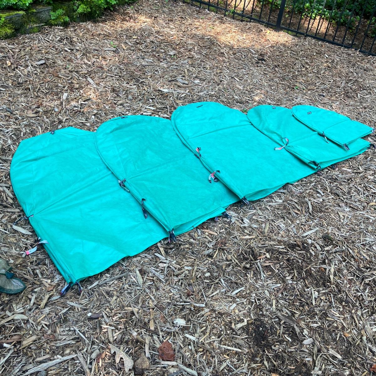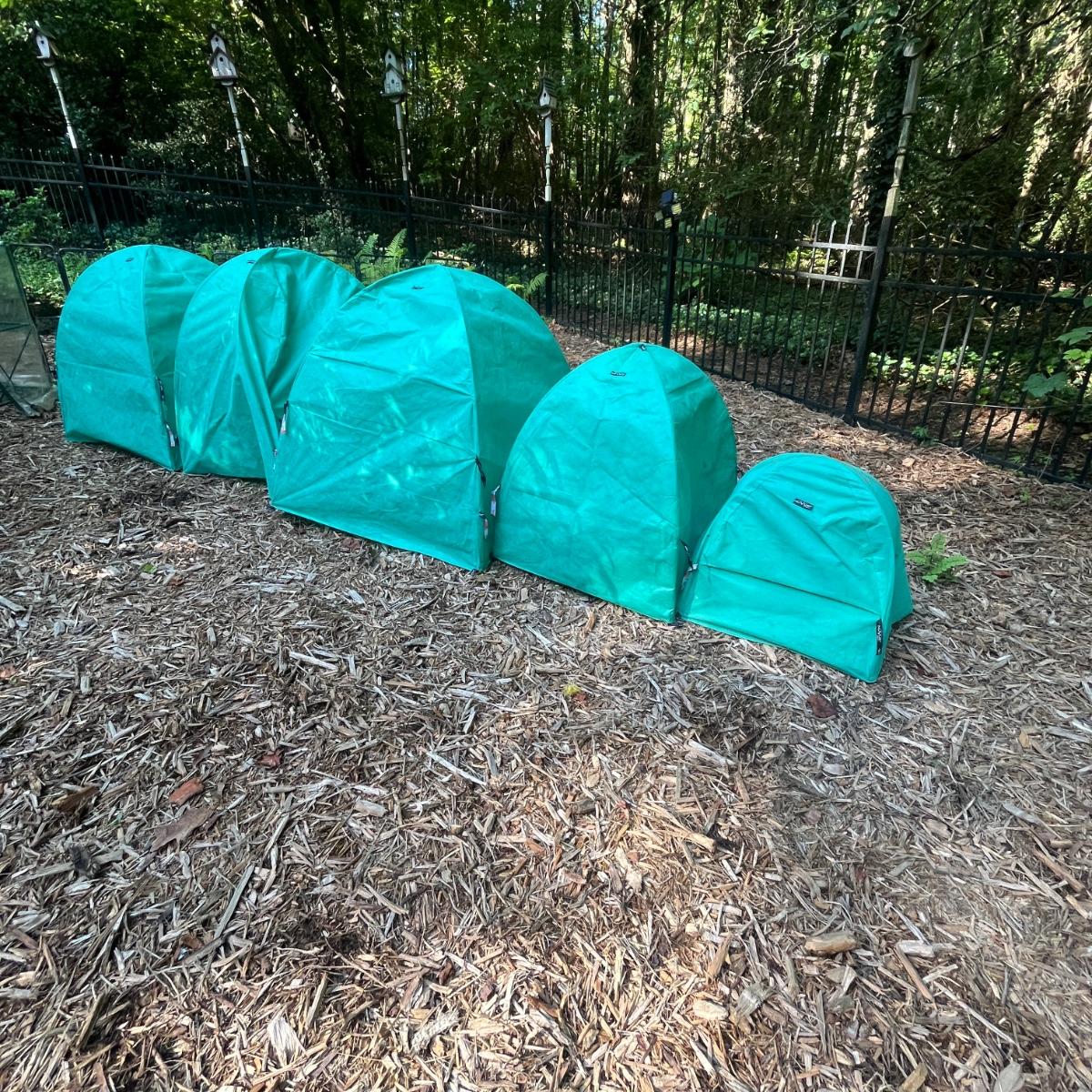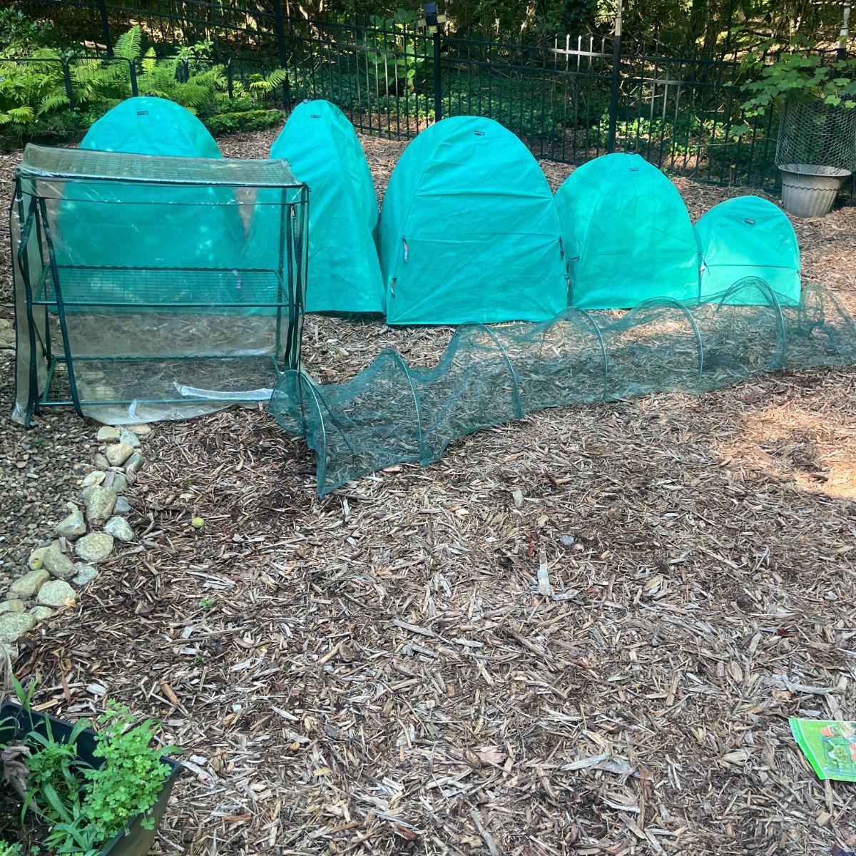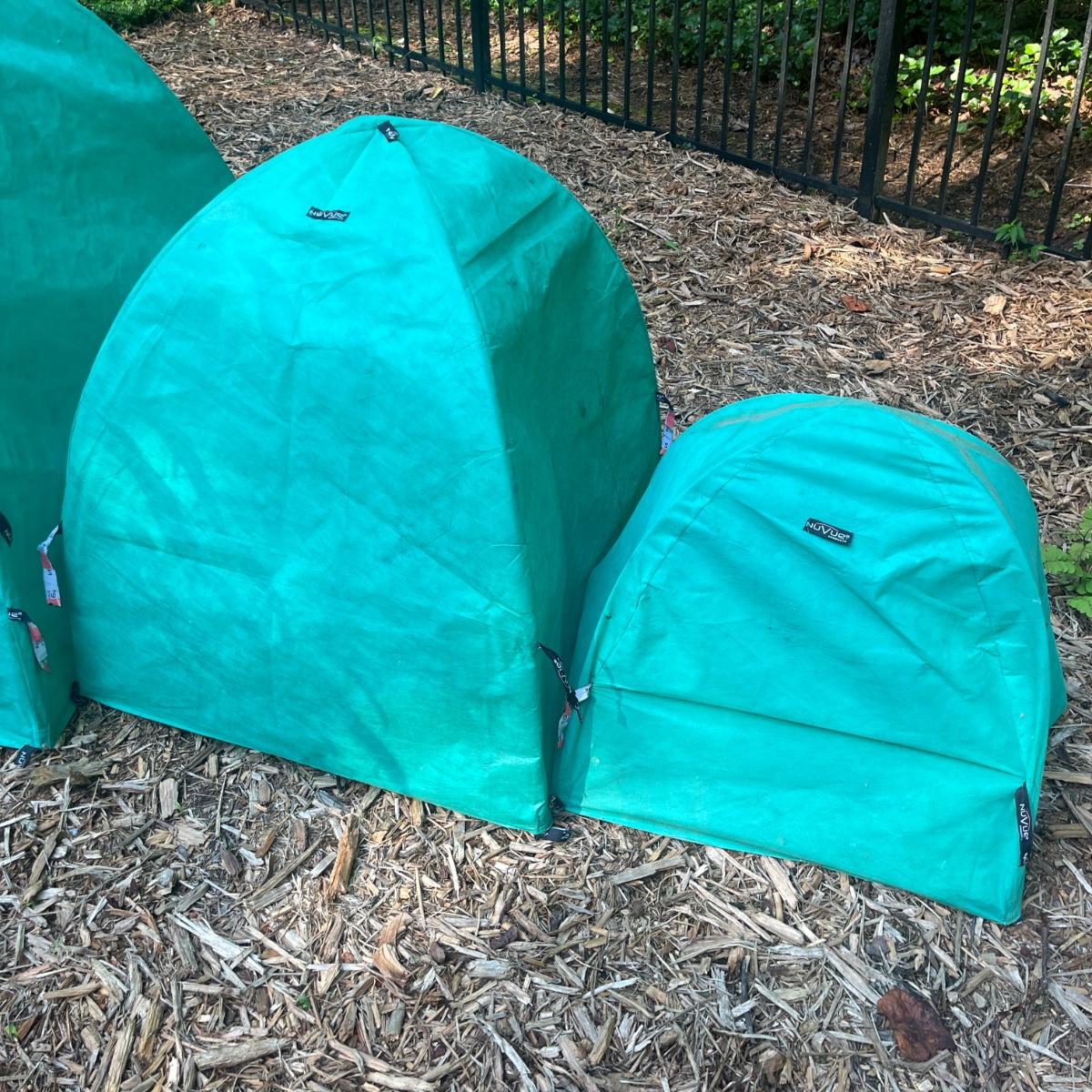 Lot includes a Tunnel shadow net that measures 106” x 24” x 13”H, Nuvue Winter shrub covers with largest measuring 36” x 36” x 42”H and a metal framed mini greenhouse that measures 39” x 20” x 36”H. Two shrub covers have small tears, see pictures.