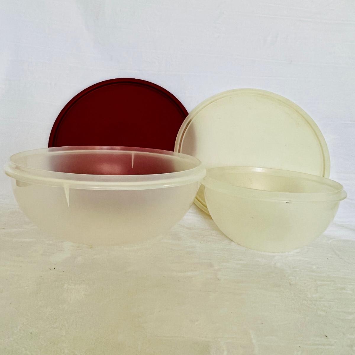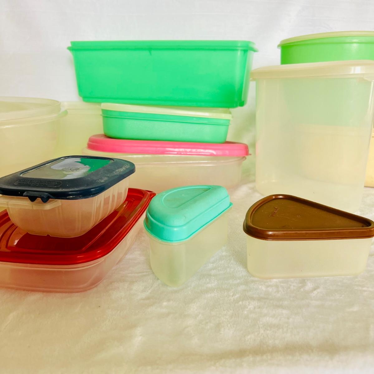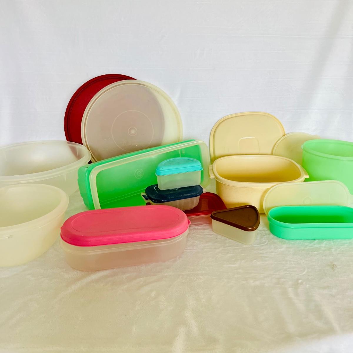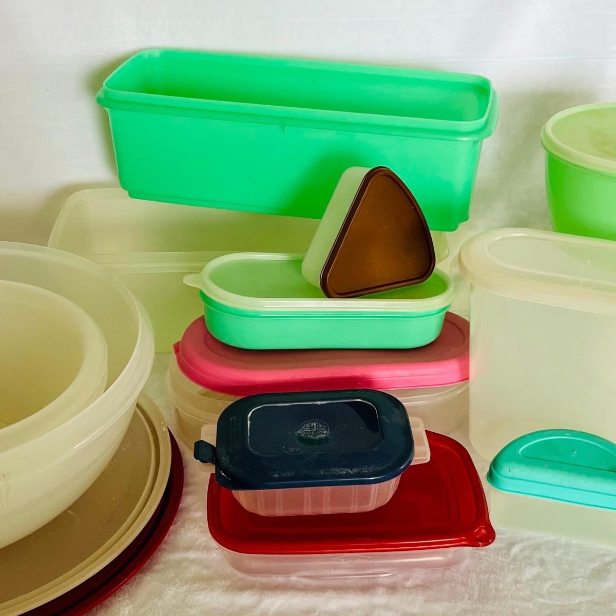 Lot includes a mixture of Tupperware Bowls and plastic containers with lids, a salad crisper, dip tray with cover, paper plate holders, measuring cups and more.