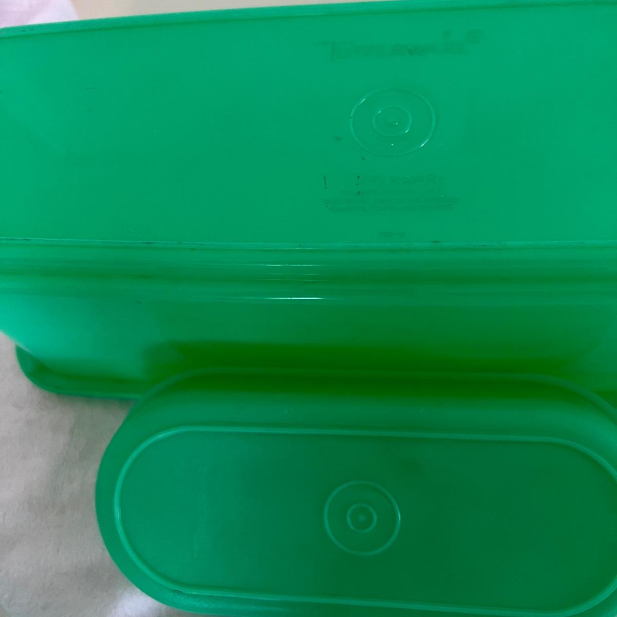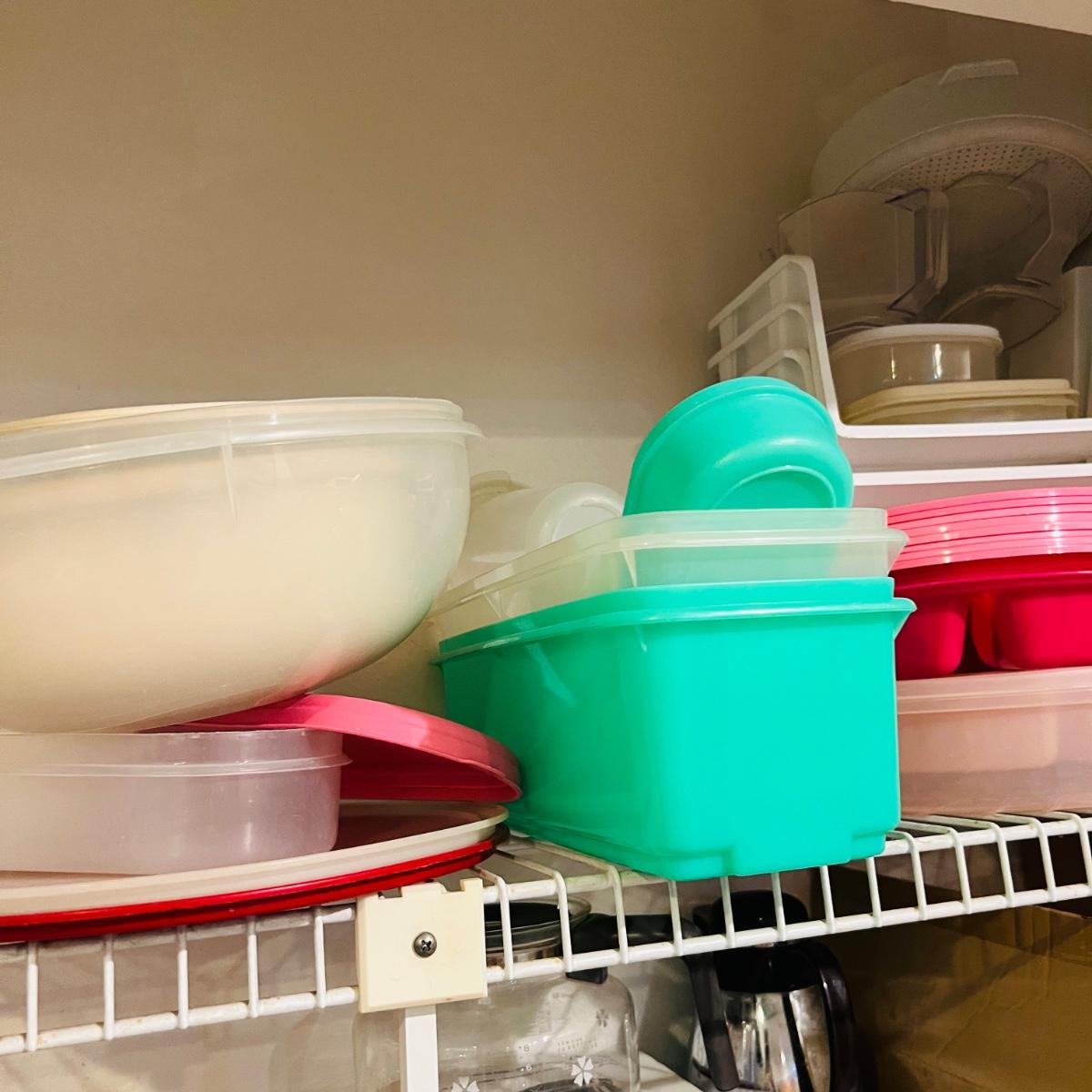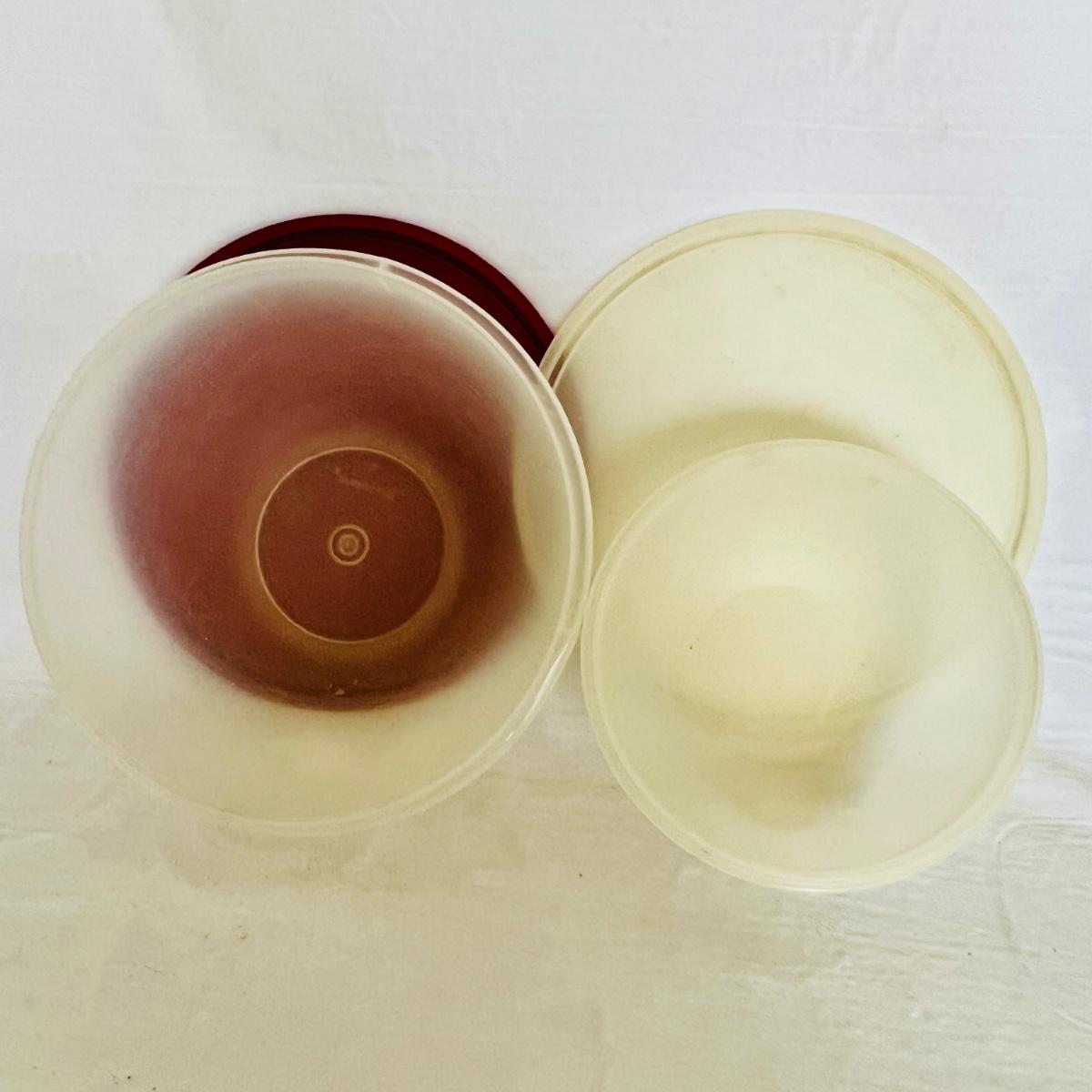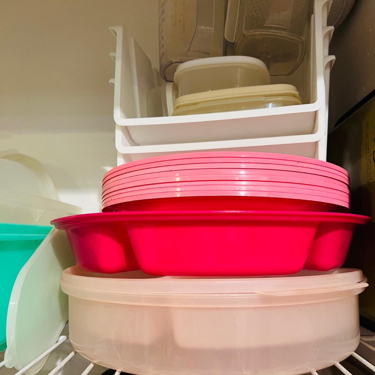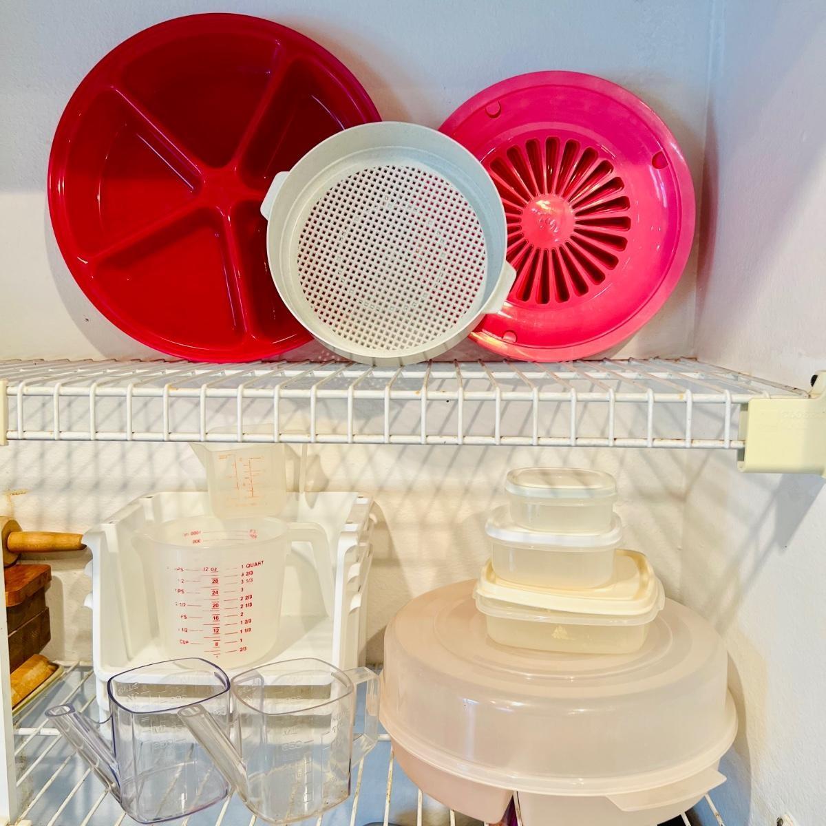 Lot includes a mixture of Tupperware Bowls and plastic containers with lids, a salad crisper, dip tray with cover, paper plate holders, measuring cups and more.