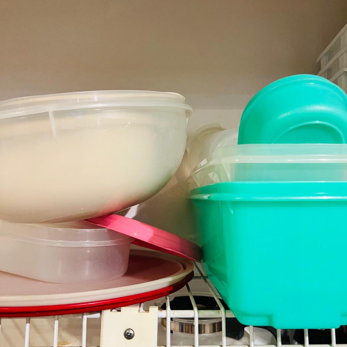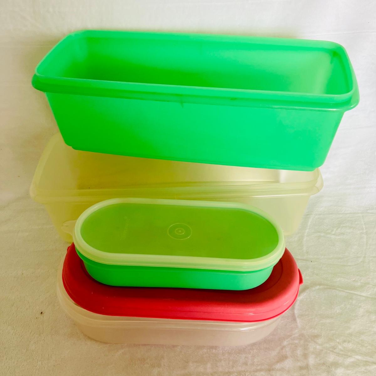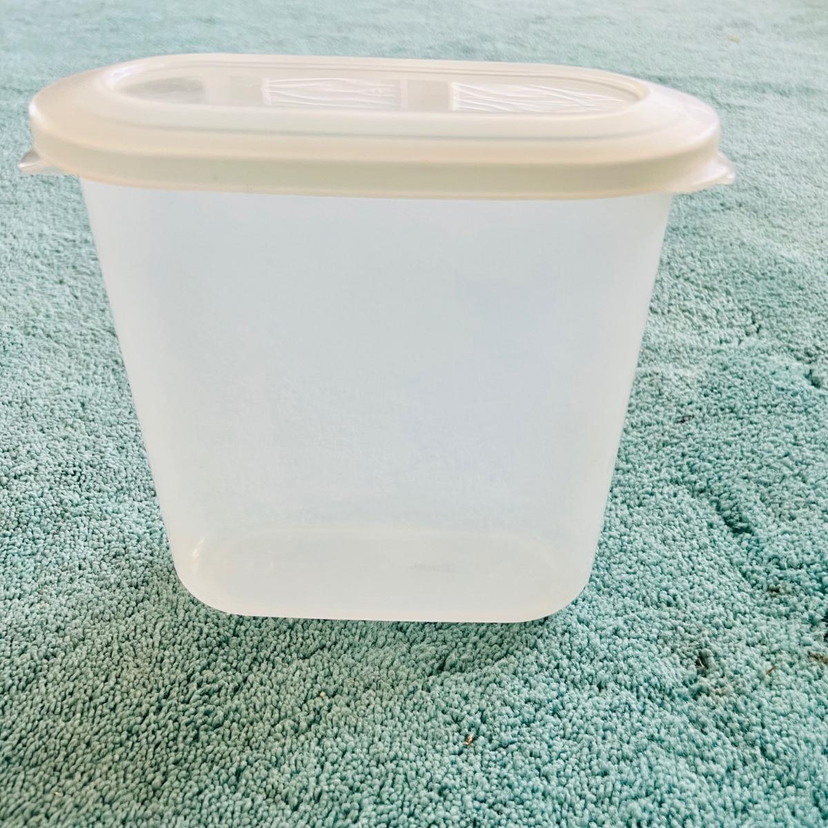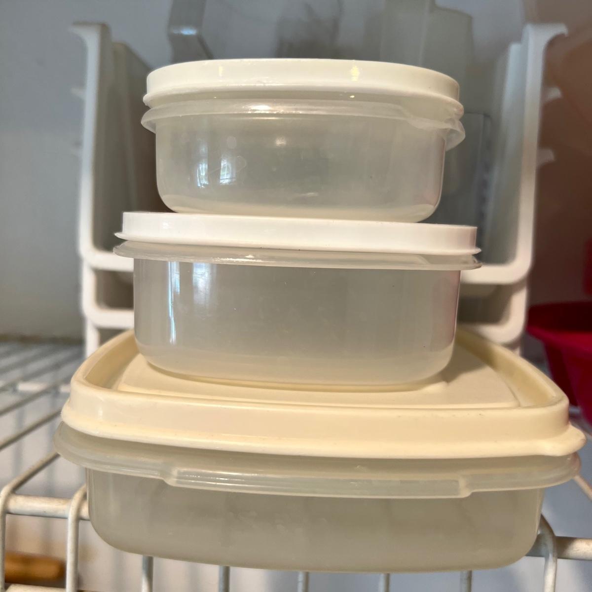 Lot includes a mixture of Tupperware Bowls and plastic containers with lids, a salad crisper, dip tray with cover, paper plate holders, measuring cups and more.