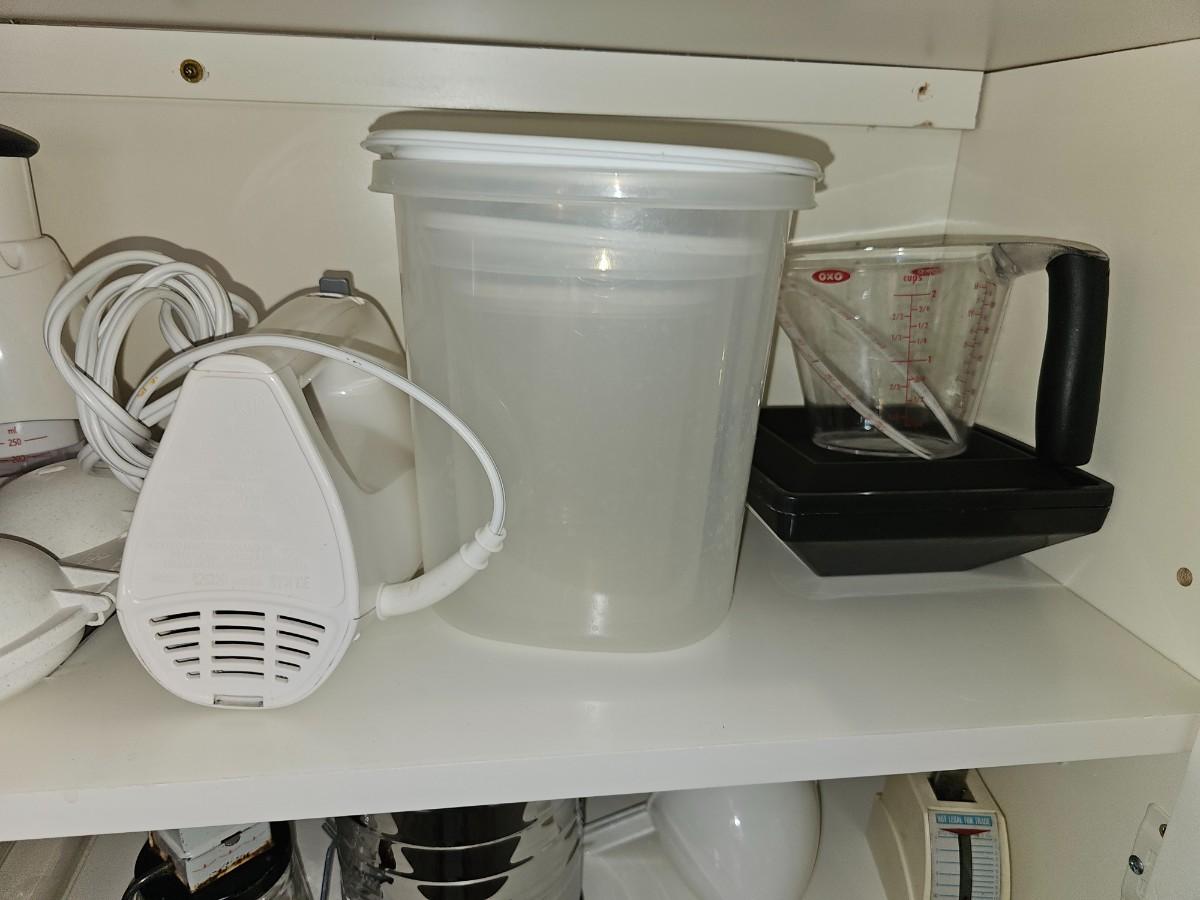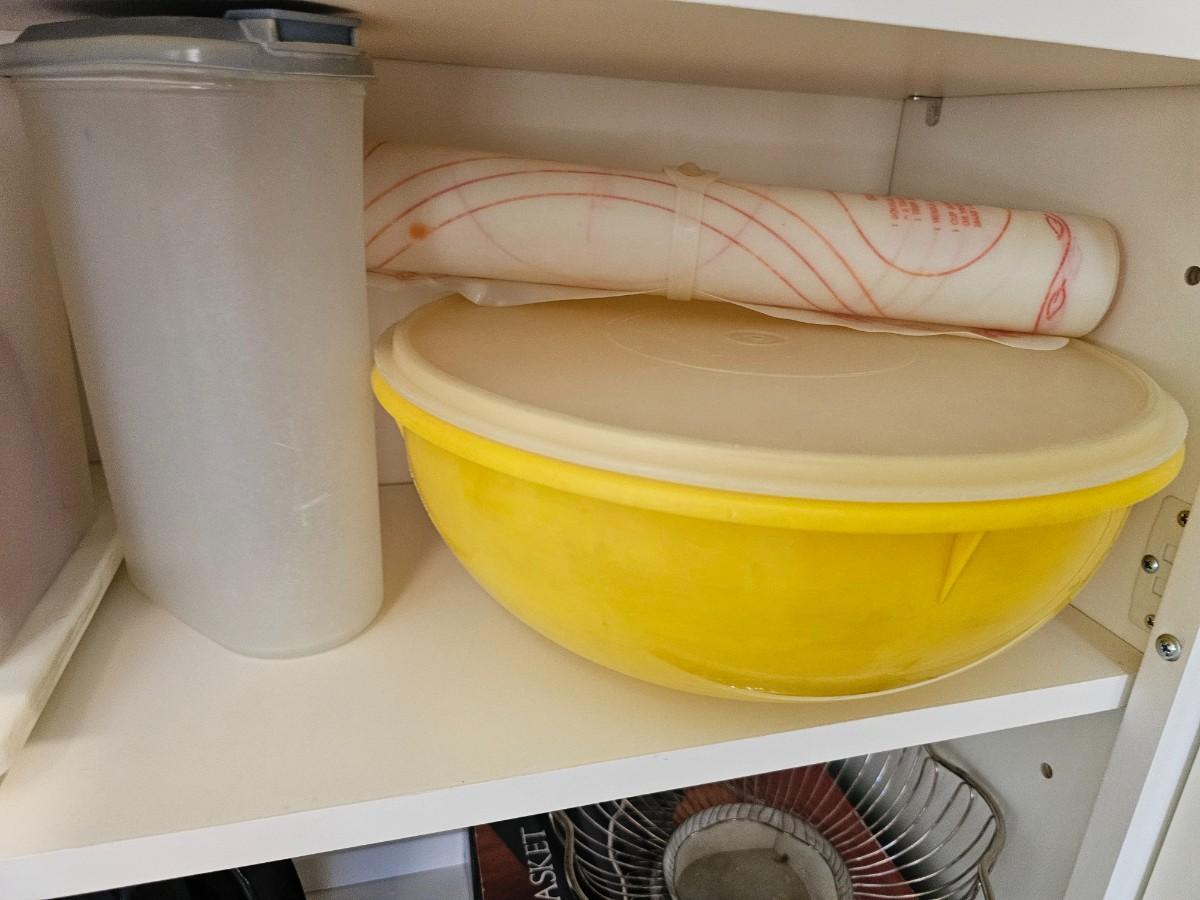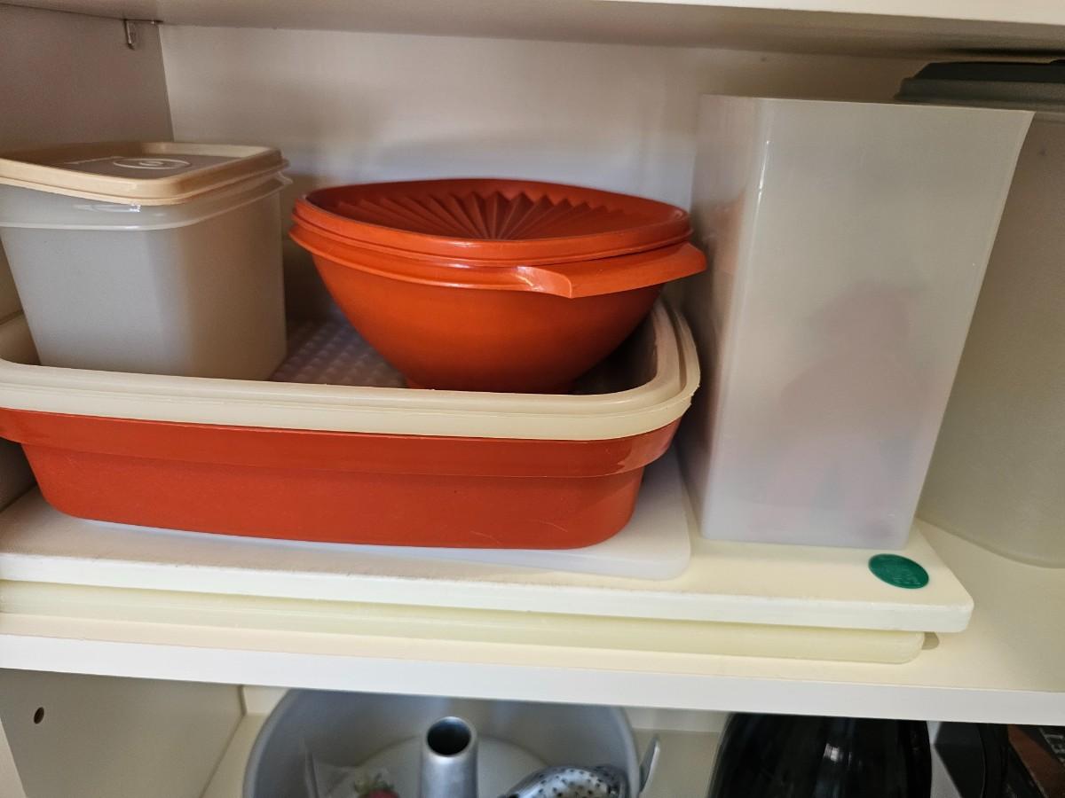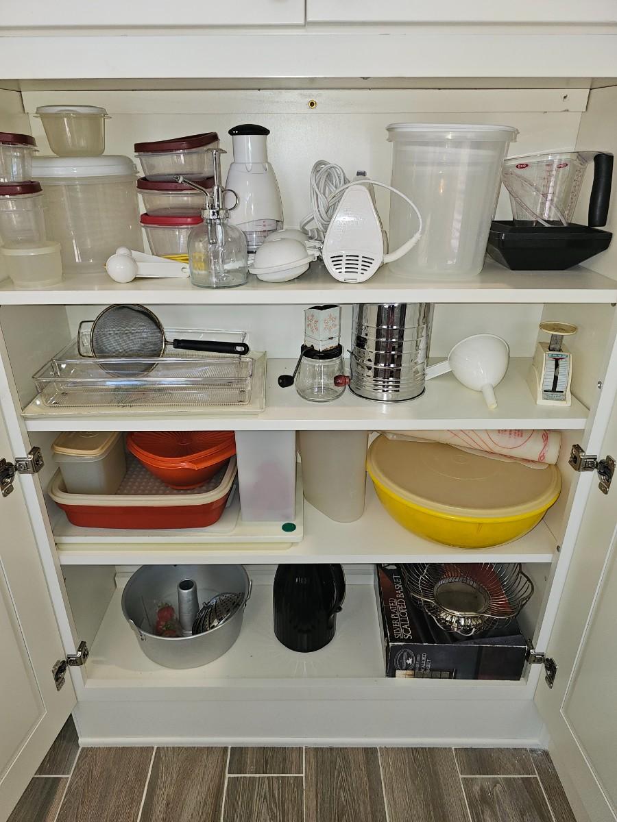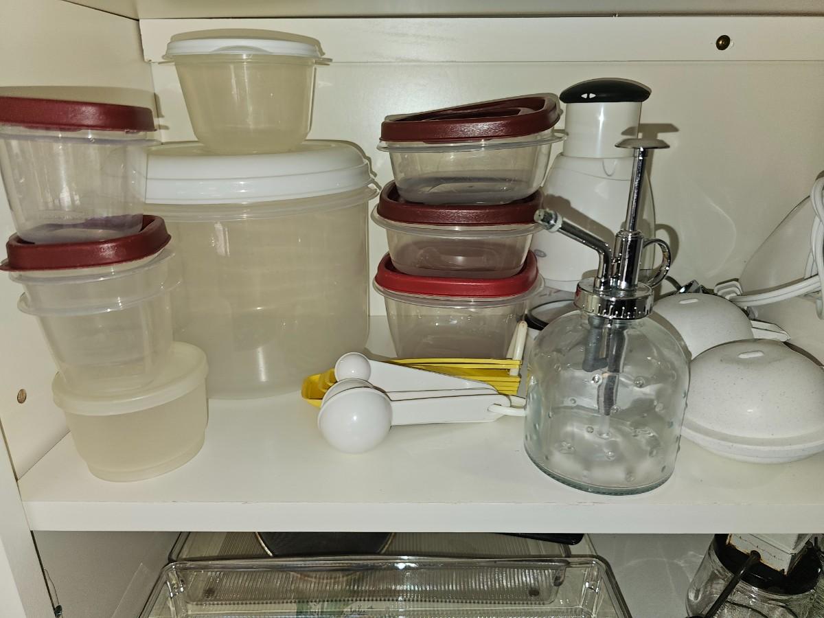 Variety of Tupperware and Rubbermaid items, hand mixer, baking items, all items pictured are included.