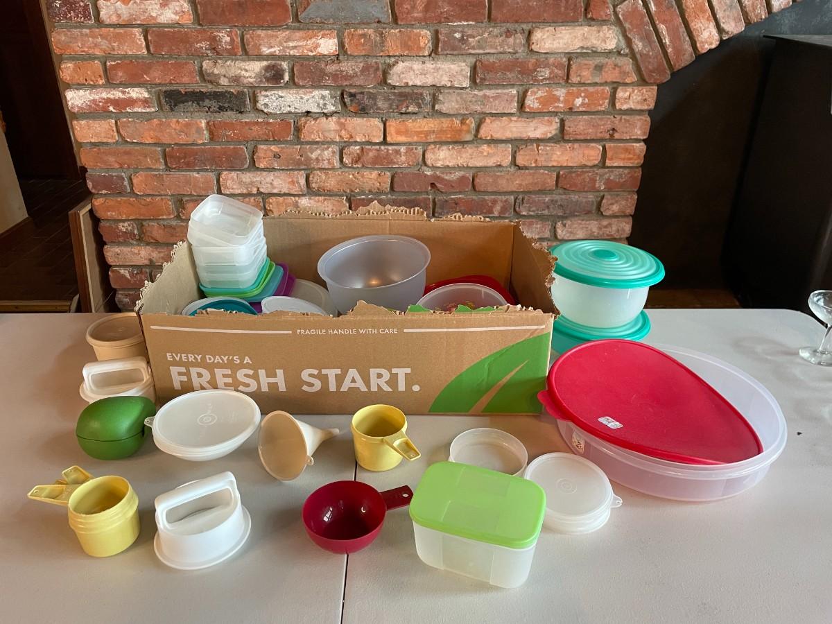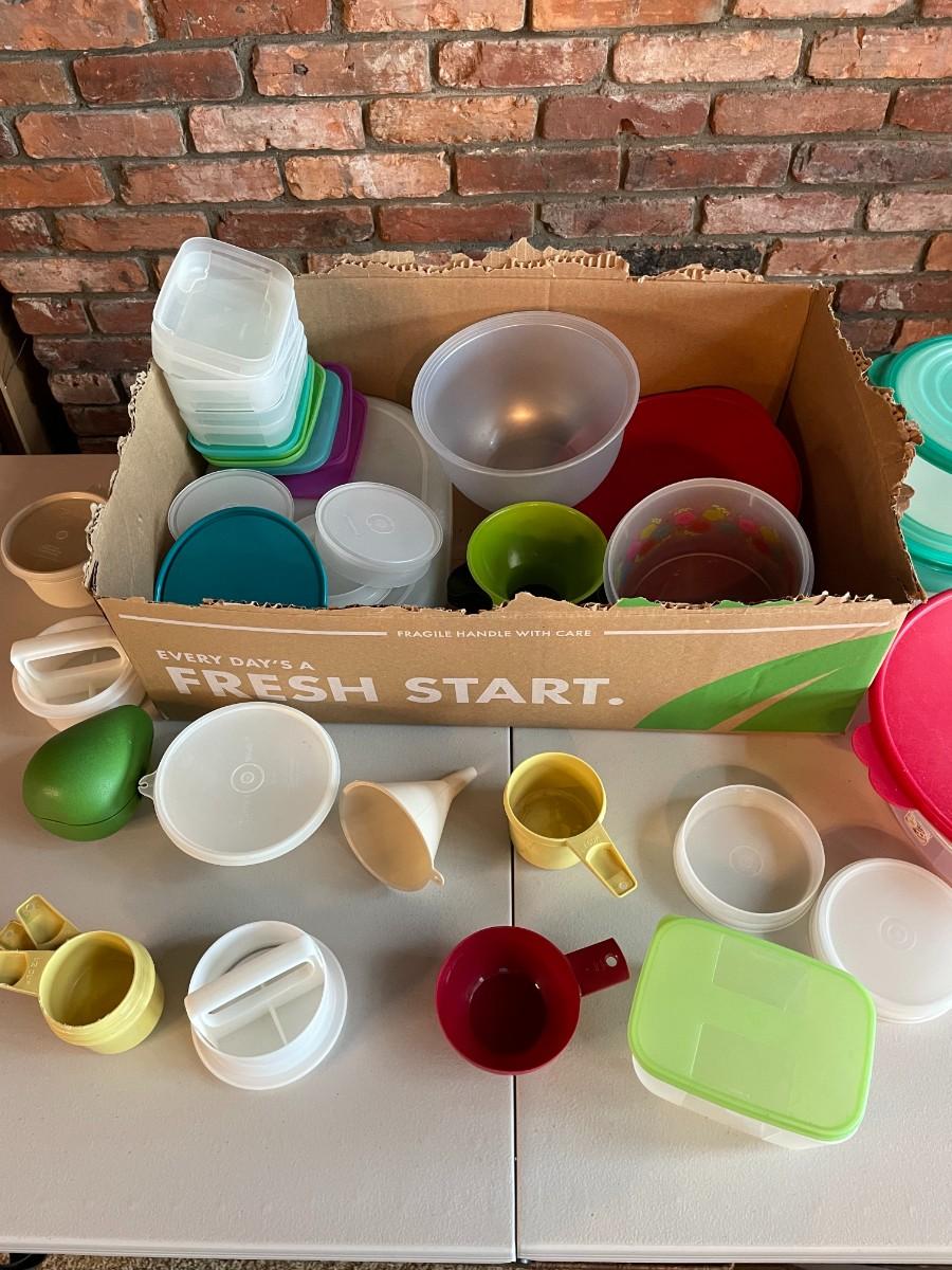 Lot includes several Tupperware items, measuring cups, and storage items.