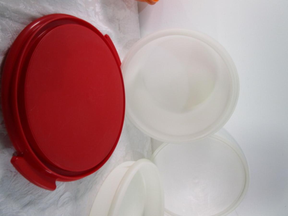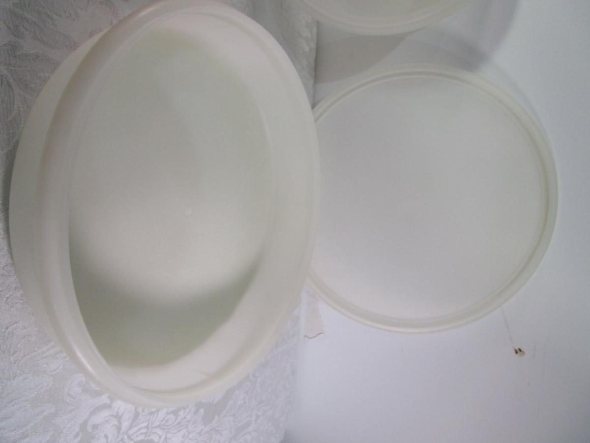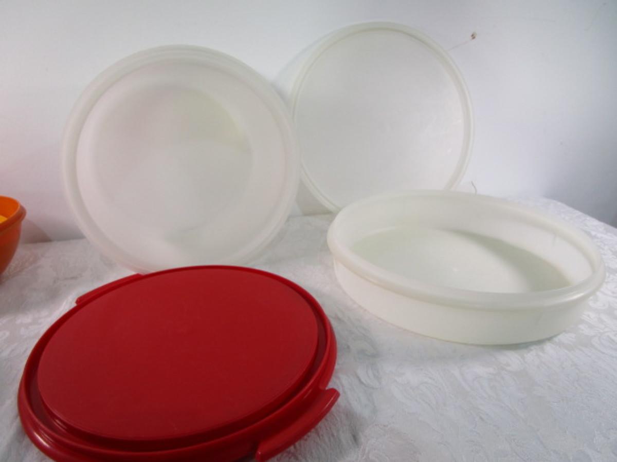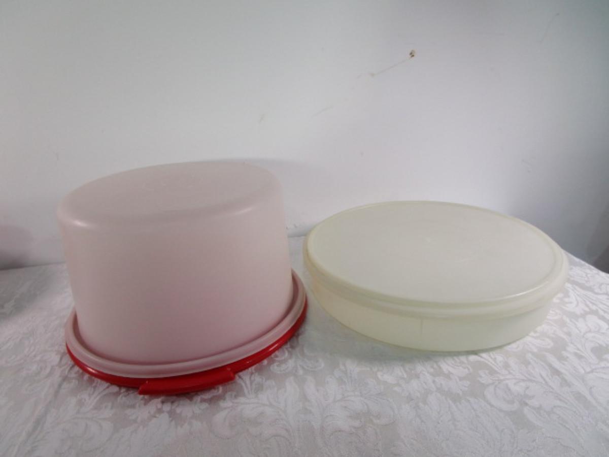 Cake plate is 10" in diameter 5-3/4" tall; 12" round container x 2-3/4" deep - D