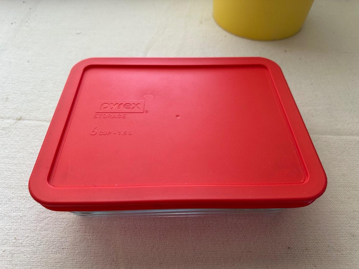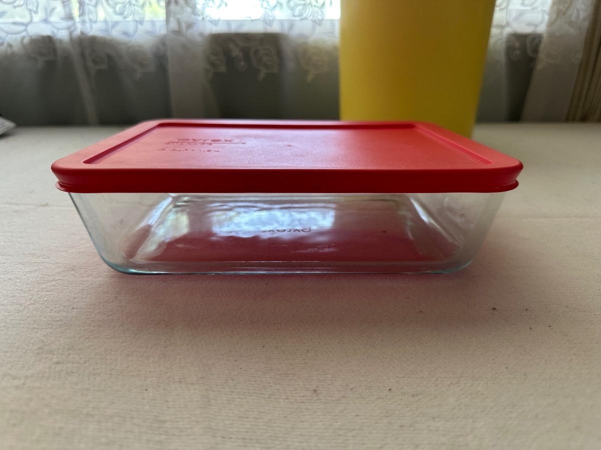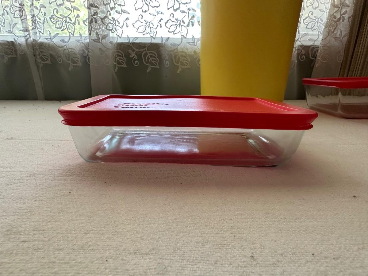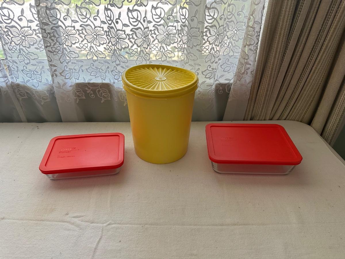 TUPPERWARE CANISTER AND TWO COVERED PYREX BAKING DISHES