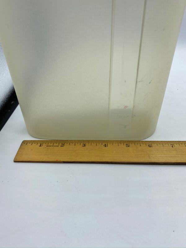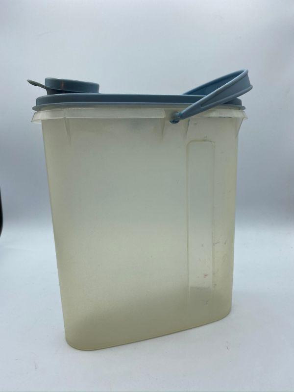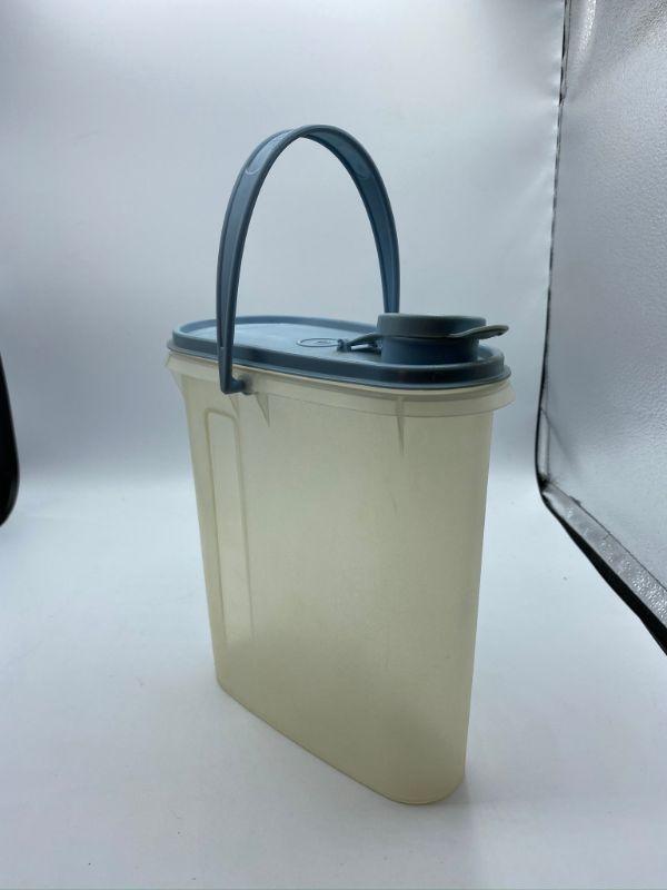 Vintage Tupperware juice container. Blue lid. Has a covered pour spout and a handle.