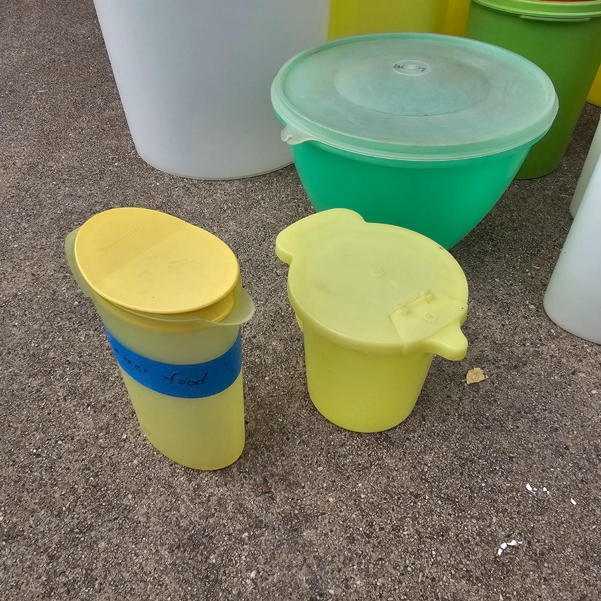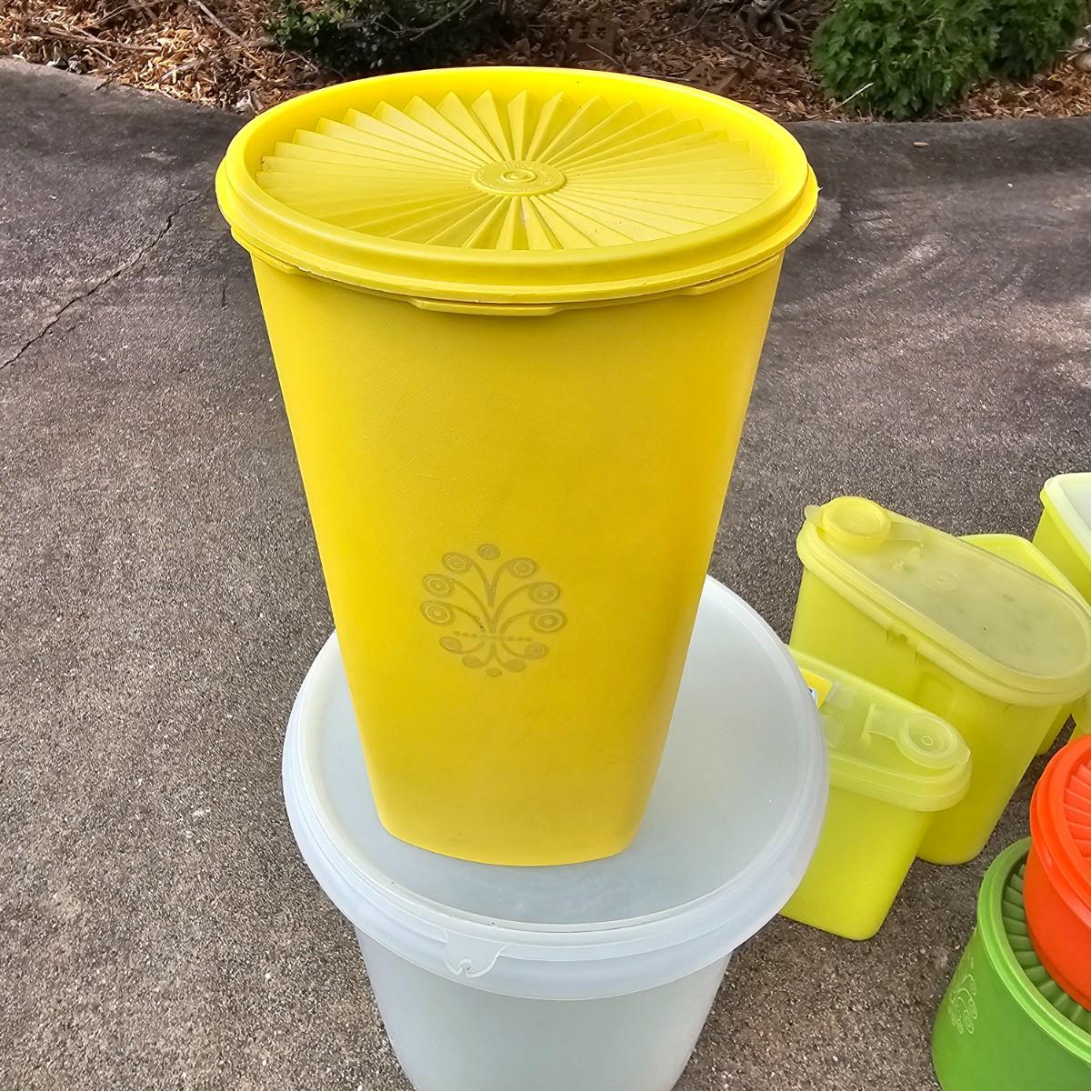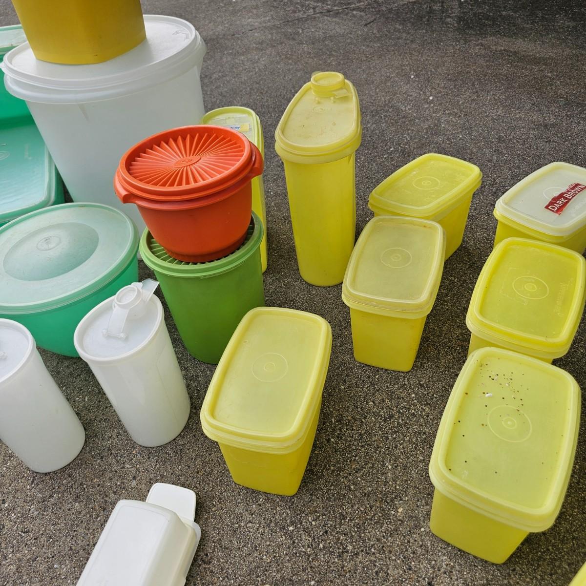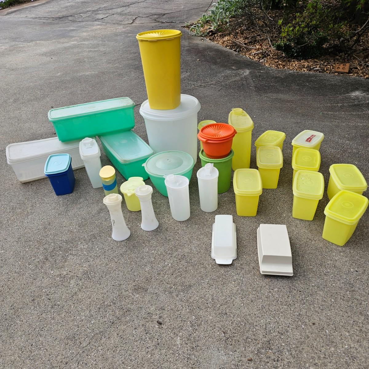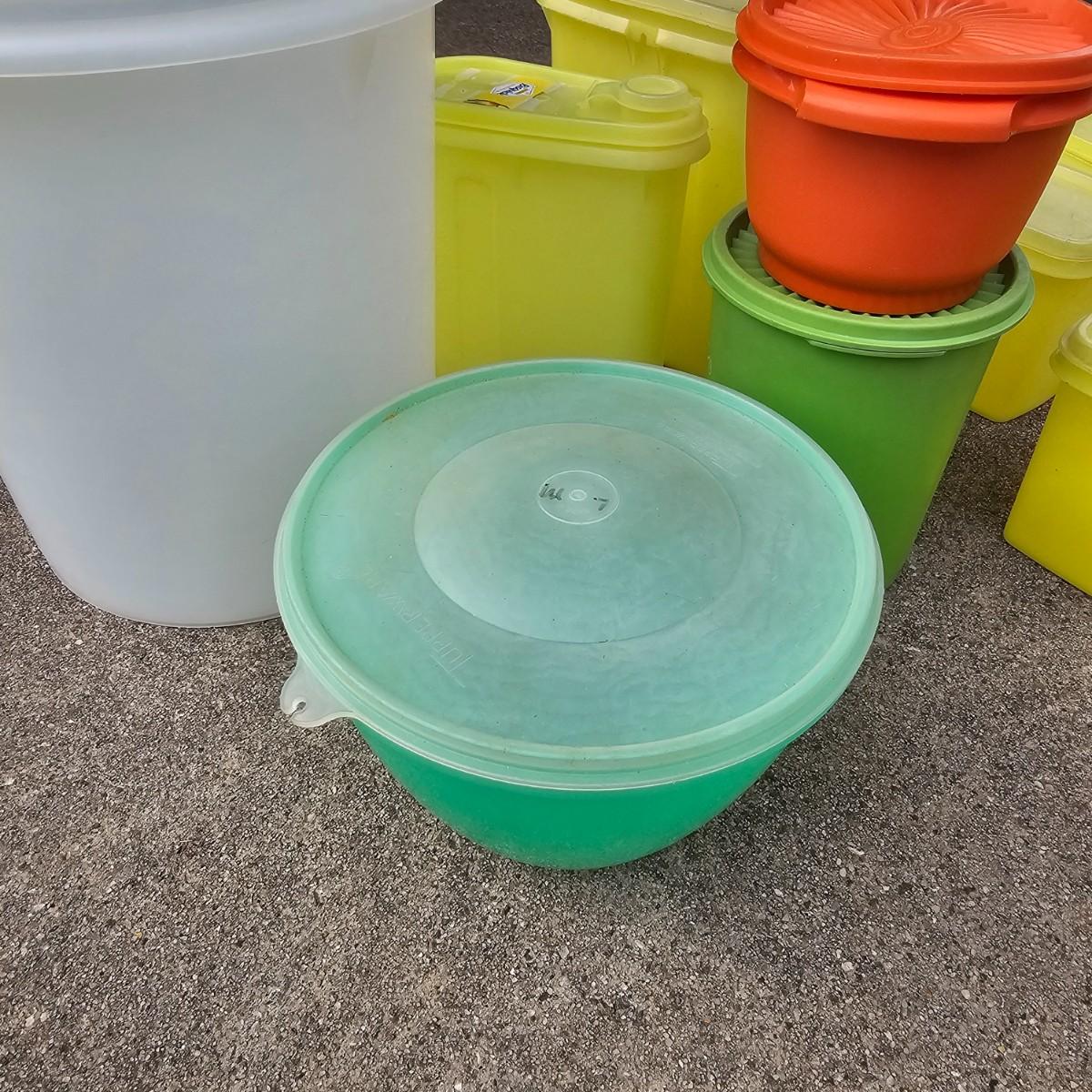 Lots of vintage Tupperware items, all with lids. Tubs, butter dishes, storage items, more. Long green tubs measure 6" x 14.5" x 5"H, large round is 10"D x 10"H, yellow oblong are 3.5" x 4.5" x 4.5"H. All items used. See photos for details. Shipping available.