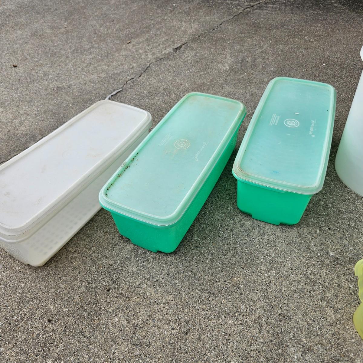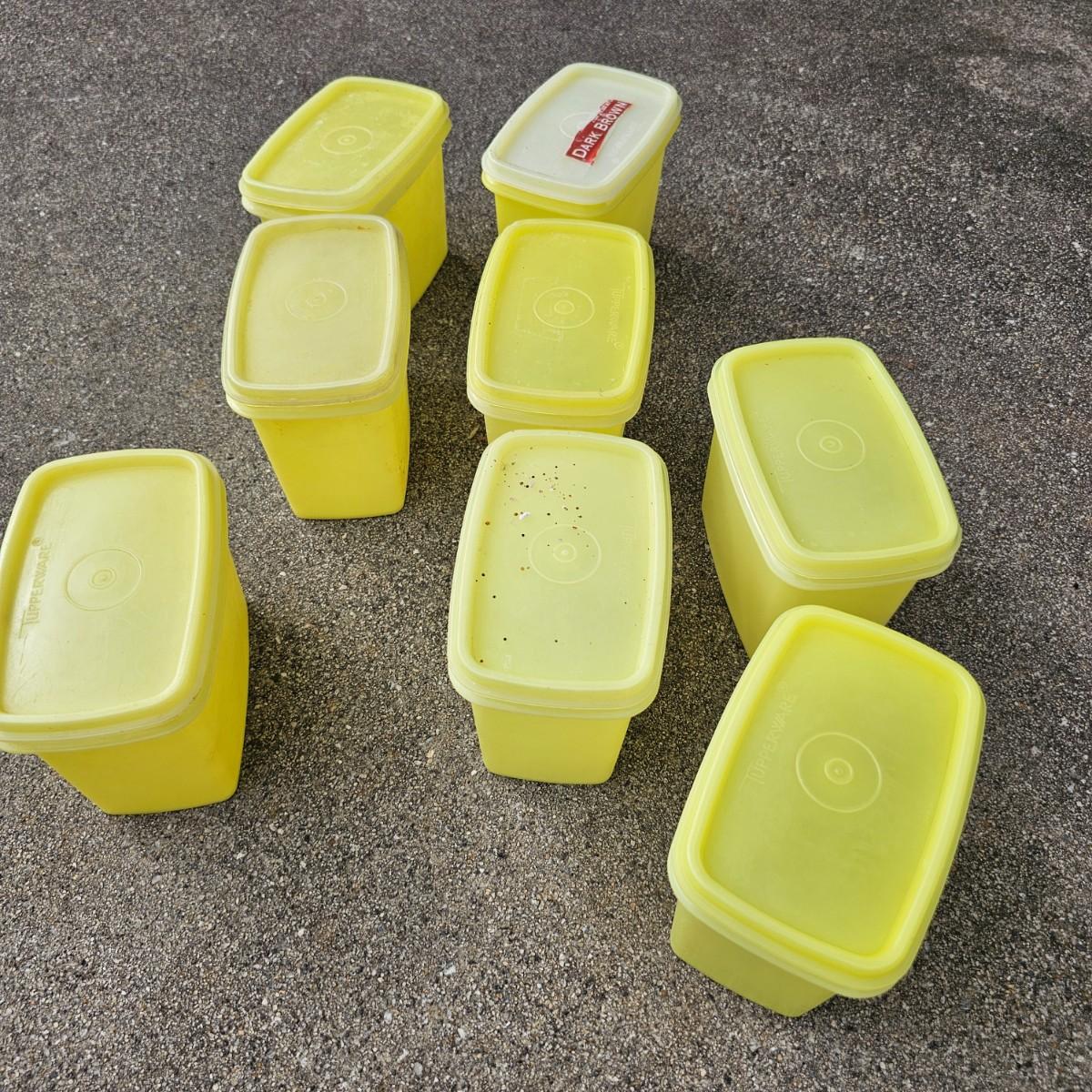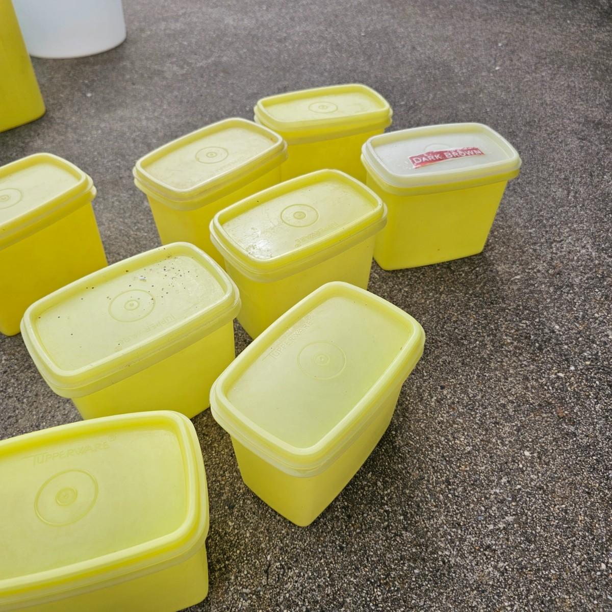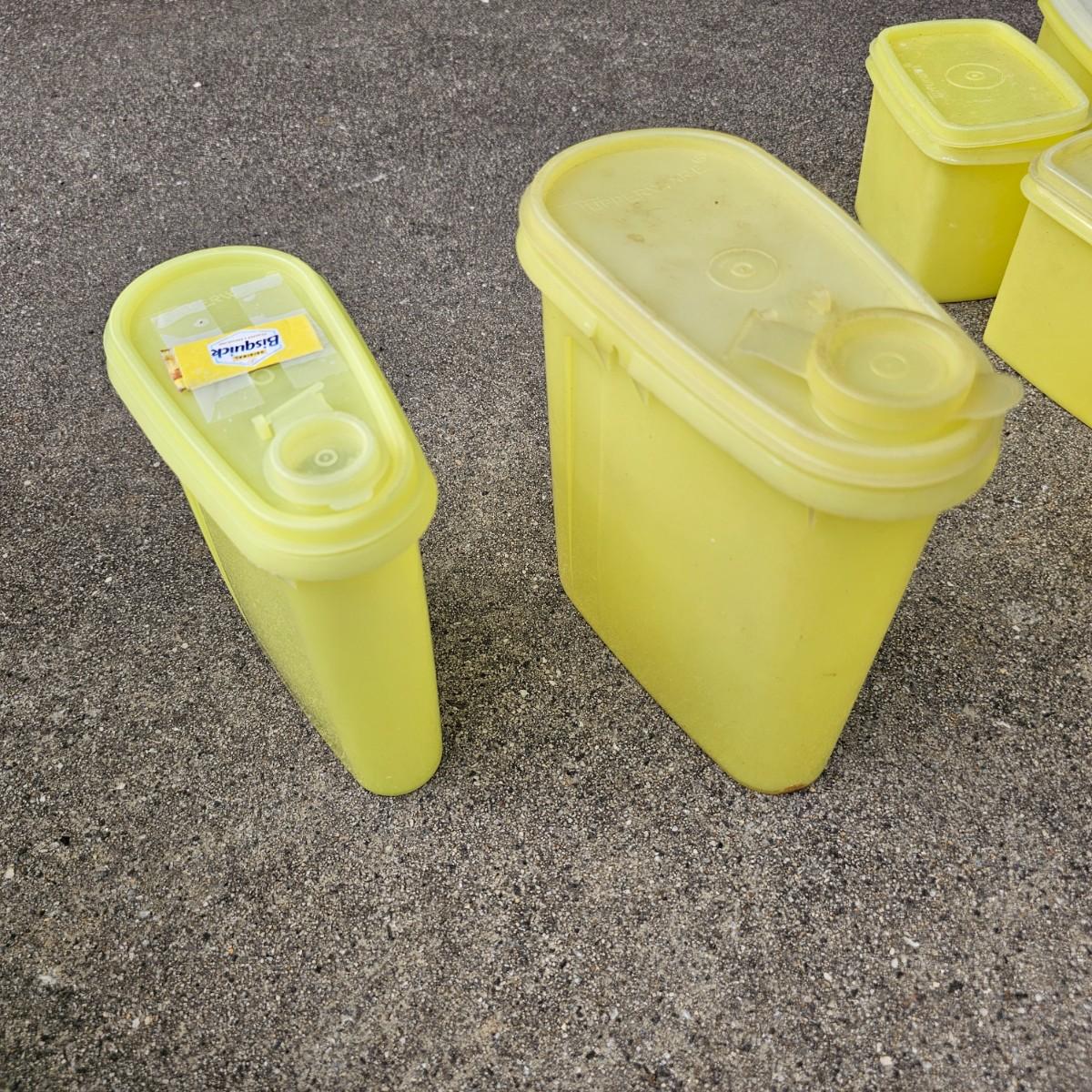 Lots of vintage Tupperware items, all with lids. Tubs, butter dishes, storage items, more. Long green tubs measure 6" x 14.5" x 5"H, large round is 10"D x 10"H, yellow oblong are 3.5" x 4.5" x 4.5"H. All items used. See photos for details. Shipping available.